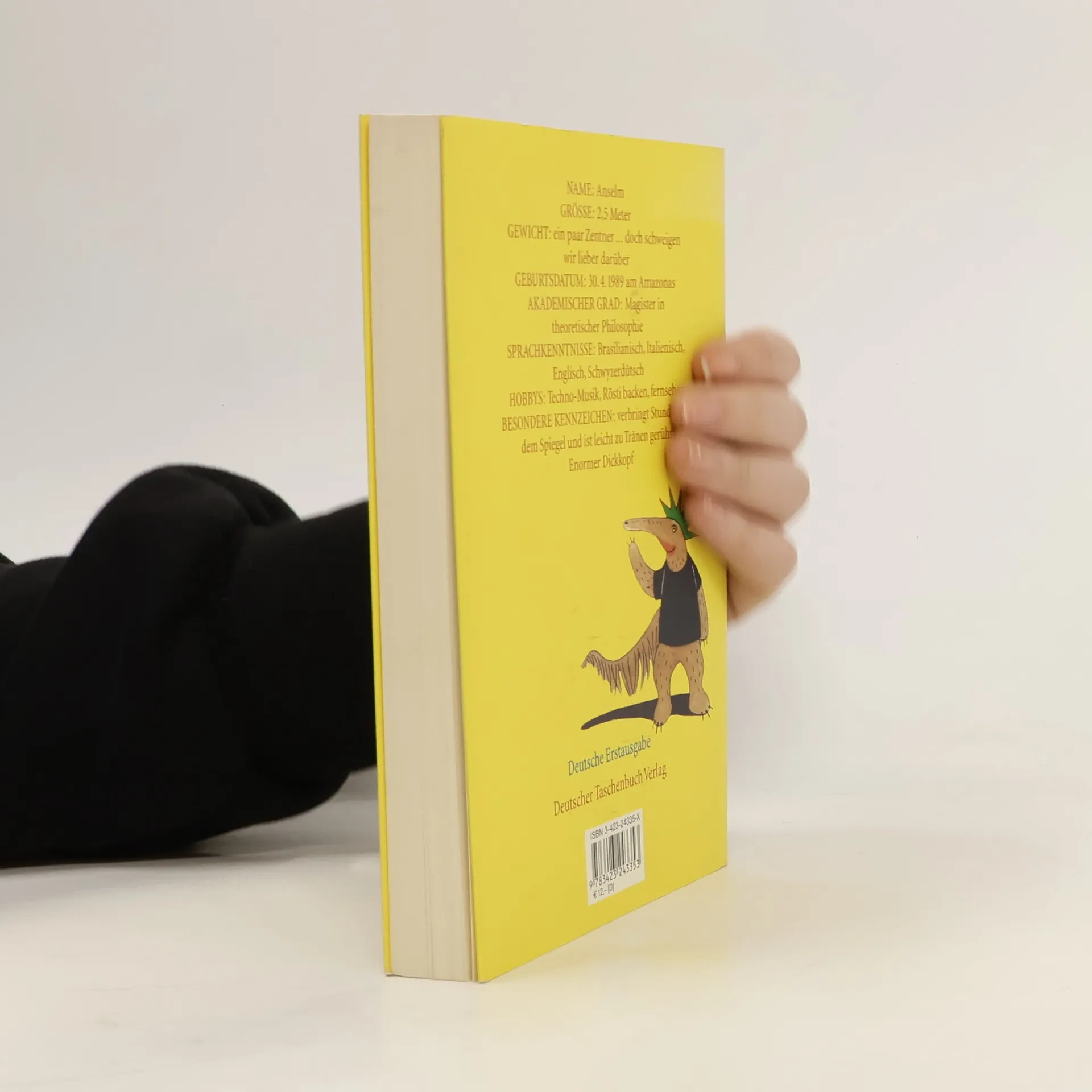 Anselm ist anders als die anderen. Denn Anselm ist ein Ameisenbär. Zusammen mit dem Autoren Culicchia lebt er in einer außergewöhnlichen Männer-WG. Anselm spricht vier Sprachen, hat Philosophie studiert, sitzt gerne im Schaukelstuhl und schaut Soap-Operas. Er schläft in seinem Lieblings-Biene-Maja-Schlafanzug und isst am allerliebsten natürlich Ameisenmarmelade. Wenn Culicchia mal ungeduldig wird, besänftigt ihn Anselm und sagt: "ich bin nun mal ein Ameisenbär". Manche verwechseln ihn mit den in Italien weit verbreiteten älteren Damen, die von oben bis unten in Pelze gekleidet sind. Denn Anselm ist sehr haarig. Deshalb darf er auch nicht ins Schwimmbad. In die Disco dagegen schon, wo die Mädchen voll auf ihn stehen, weil er so originell aussieht und außerdem tanzt wie der junge Travolta. Er ist halt einfach hipp, mal macht er auf Punker, färbt sich die Haare grün, dann mimt er den Sportsmann und geht morgens joggen. Anselm und Culicchia leben also eine ganz normale Männerfreundschaft - zumindest glauben sie das.
