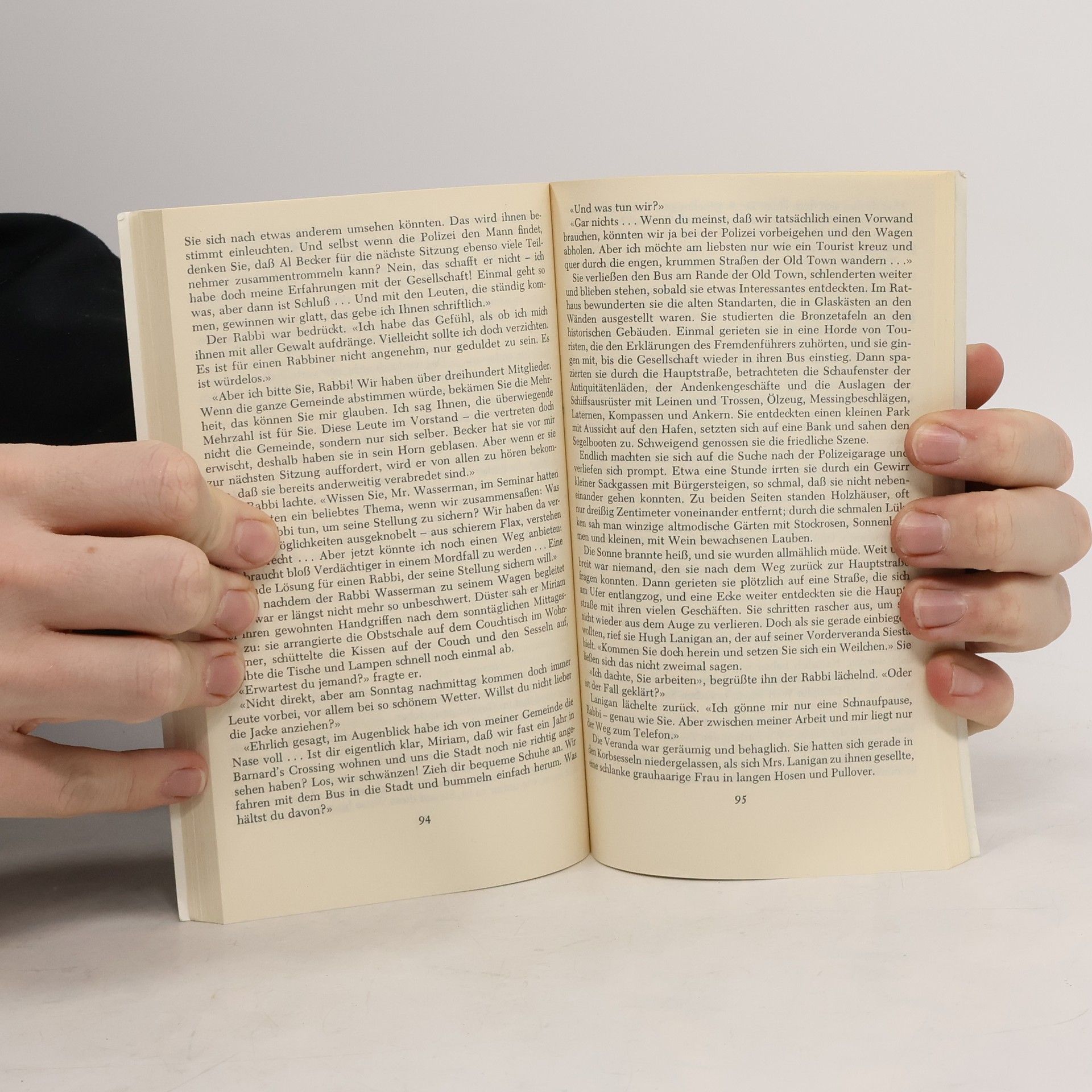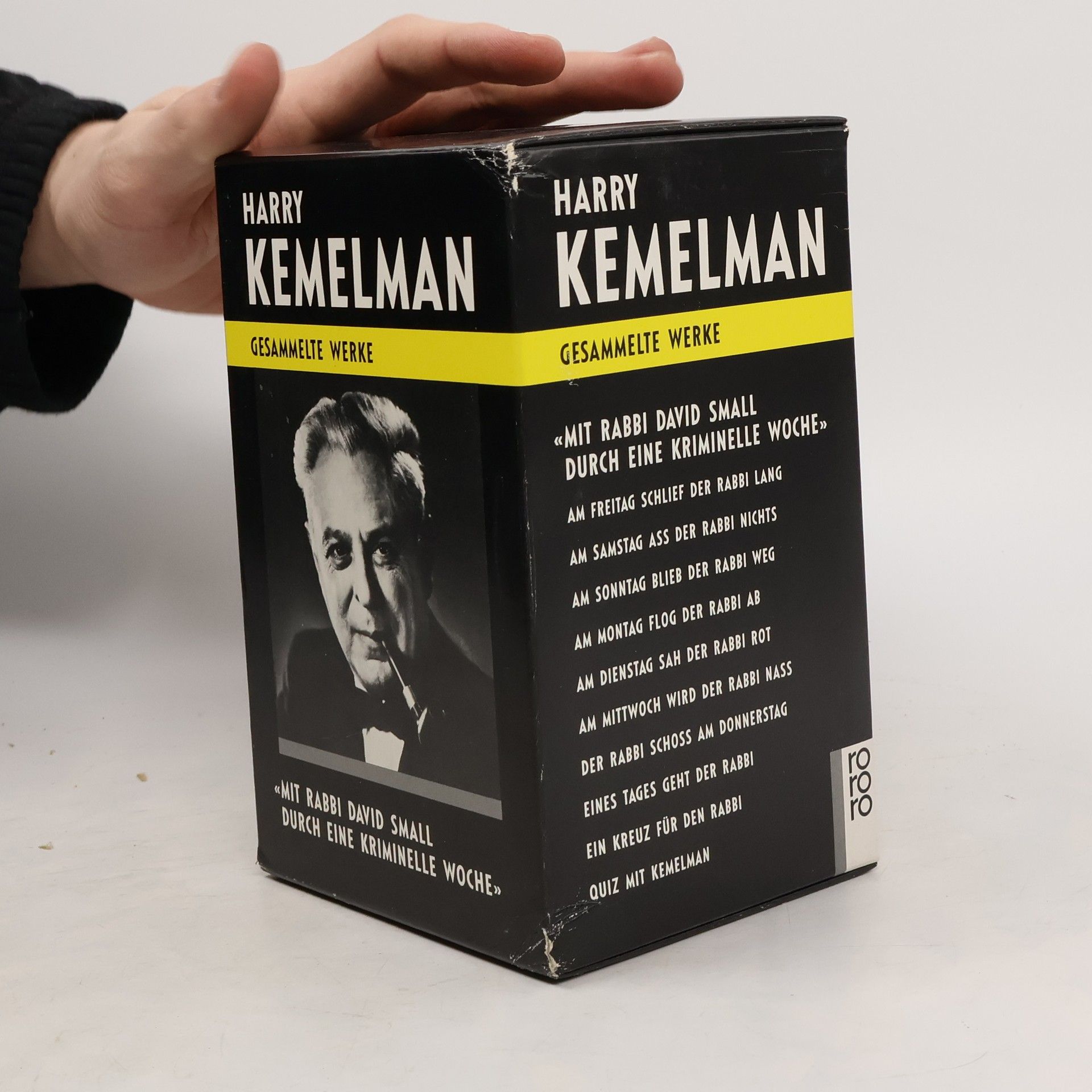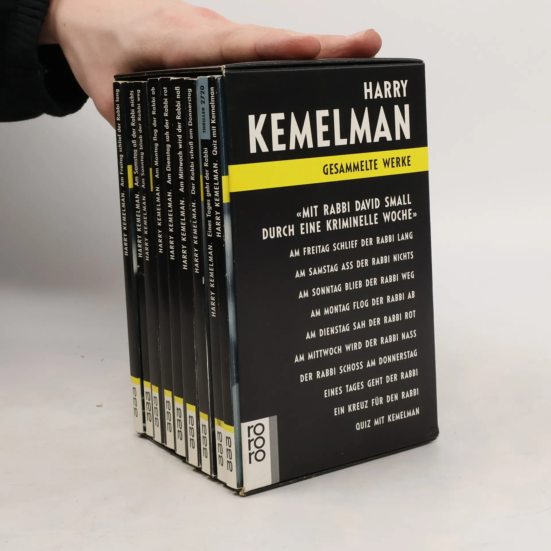 Boxed 10-book set of Kemelman's Rabbi Small novels, translated into German. Am Montag flog der Rabbi ab, Am Dienstag sah der Rabbi rot, Am Mittwoch wird der Rabbi naB, Der Rabbi schoB am Donnerstag, Am Freitag schleif der Rabbi lang, Am Samstag aB der Rabbi nichts, Am Sontag blieb der Rabbi weg, Eines Tages geht der Rabbi, Ein Kreuz fur den Rabbi, and Quiz mit Kemelman.