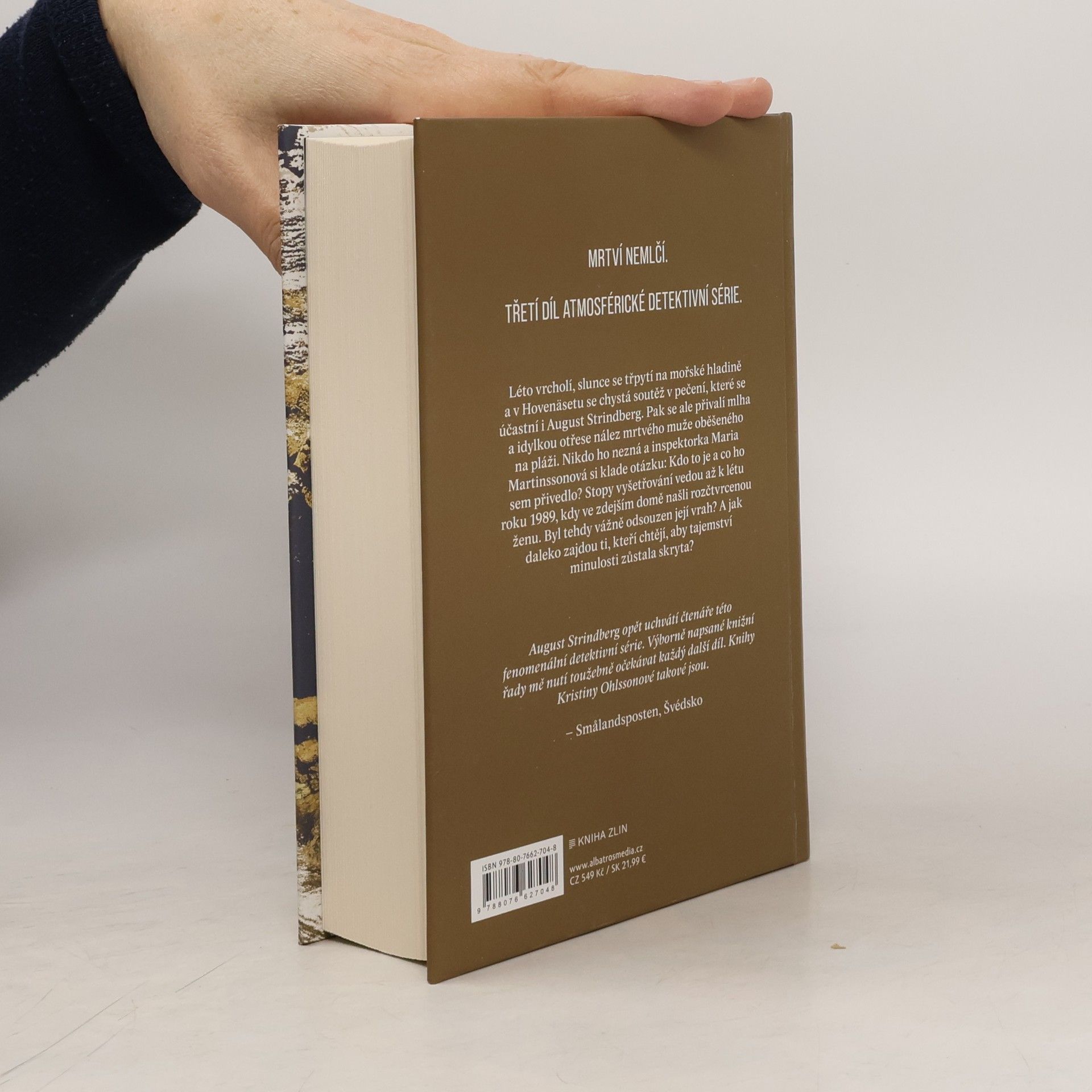 Mrtví nemlčí. Třetí díl atmosférické detektivní série. Léto vrcholí, slunce se třpytí na mořské hladině a v Hovenäsetu se chystá soutěž v pečení, které se účastní i August Strindberg. Pak se ale přivalí mlha a idylkou otřese nález mrtvého muže oběšeného na pláži. Nikdo ho nezná a inspektorka Maria Martinssonová si klade otázku: Kdo to je a co ho sem přivedlo? Stopy vyšetřování vedou až k létu roku 1989, kdy ve zdejším domě našli rozčtvrcenou ženu. Byl tehdy vážně odsouzen její vrah? A jak daleko zajdou ti, kteří chtějí, aby tajemství minulosti zůstala skryta? Nakladatelská anotace.