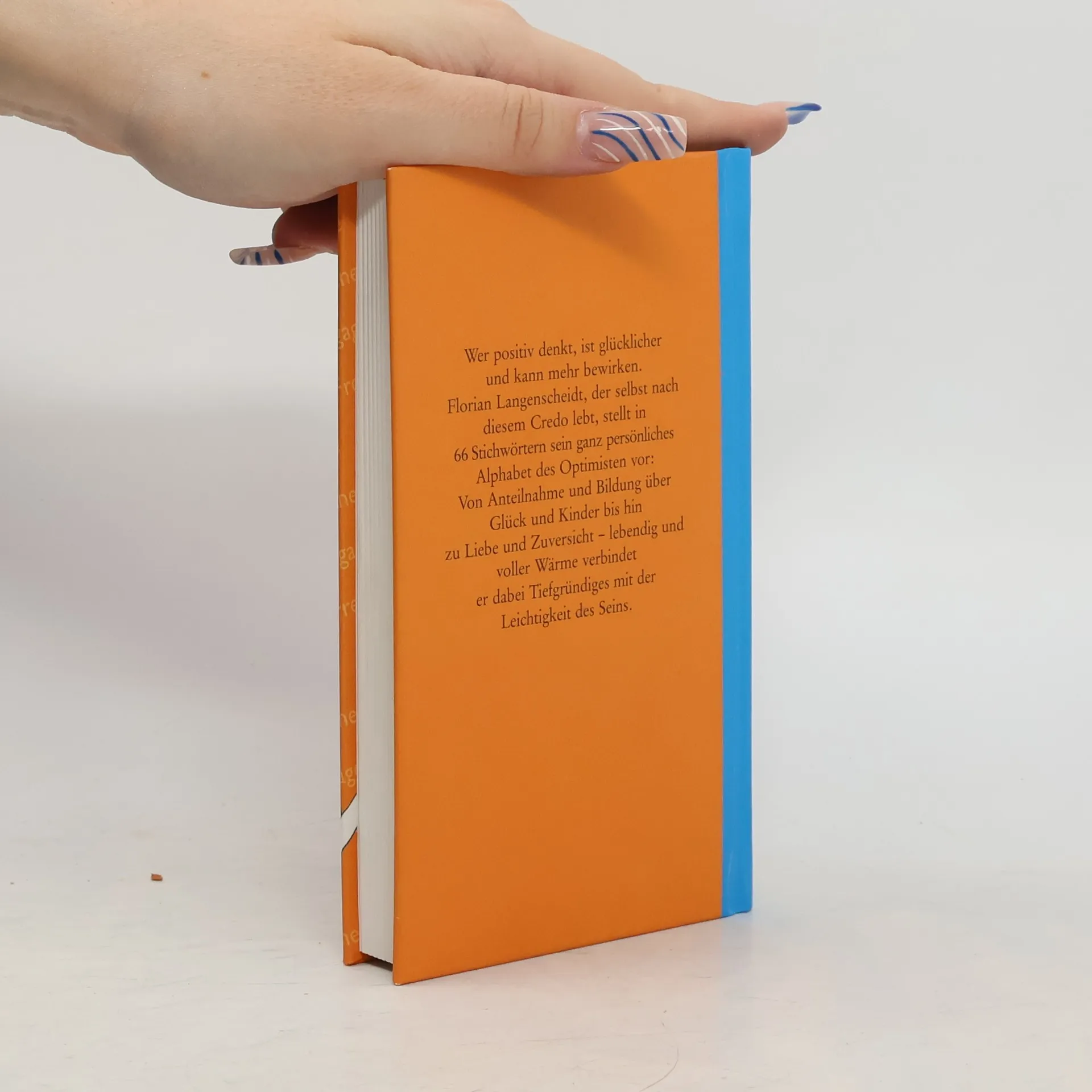 Optimisten haben es leichter: Sie sind glücklicher, zufriedener und sehen das Auf und Ab des Lebens gelassener als ihre pessimistisch eingestellten Zeitgenossen. Wer nicht alles so schwer nimmt und die schönen Dinge zu genießen weiß, strahlt dies auch aus. Florian Langenscheidt lebt selbst nach diesem Credo. In seinem Buch stellt er in 66 Stichwörtern sein ganz persönliches Alphabet des Optimisten vor