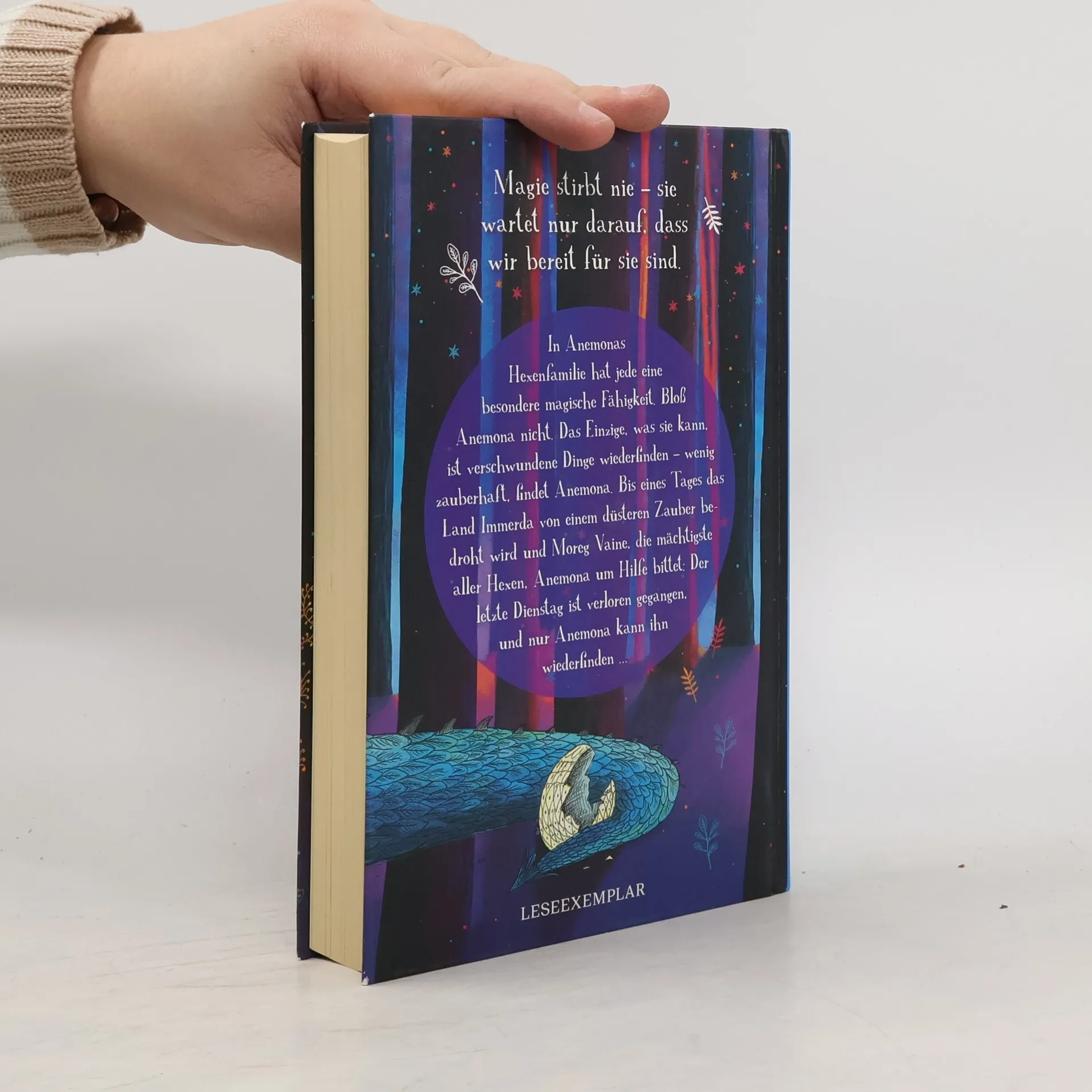 In Anemonas Hexenfamilie hat jede eine besondere magische Fähigkeit. Sie selbst kann leider nur verschwundene Dinge wiederfinden. Eine ziemlich unmagische Fähigkeit, vor allem, wenn es sich um verlegte Gebisse handelt (Igitt!). Bis eines Tages Moreg Vaine, die mächtigste aller Hexen, Anemona um Hilfe bittet: Der letzte Dienstag ist verloren gegangen – und einzig Anemona kann ihn wiederfinden. Zusammen mit Oswald, dem miesgelaunten Monster von unter dem Bett, begibt Anemona sich auf die Suche nach dem verlorenen Tag und einem uralten Zauber, der ganz Immerda zu bedrohen vermag … Originell, bestechend humorvoll, voller Phantasie und überraschender Wendungen: Band 1 der phantastischen Serie um die Hexe Anemona und das magische Land Immerda. Mit Bildern von Sarah Warburton