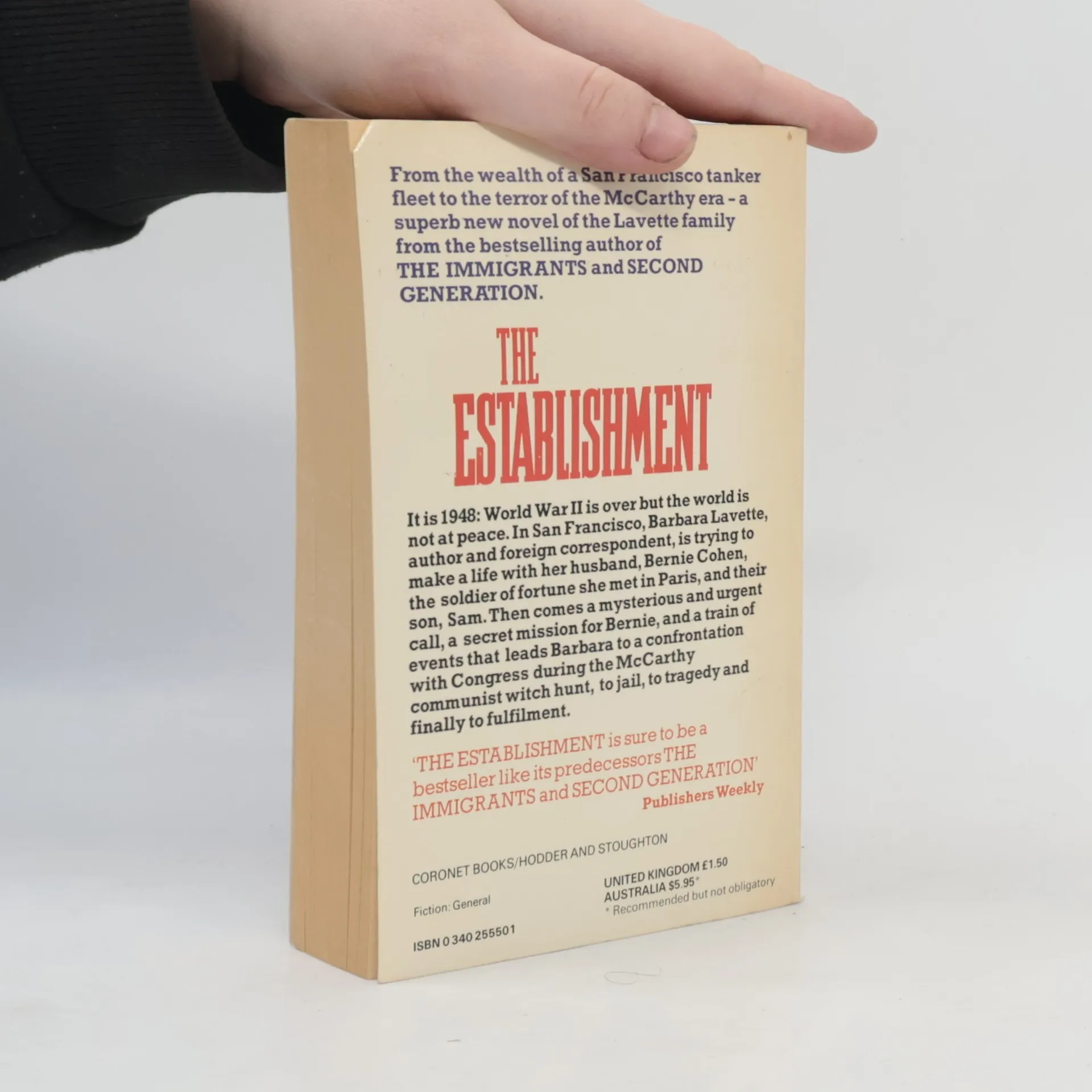 In The Establishment, Howard Fast pulls the listener into the turbulent and passionate lives of the Dan Lavette family story begun in The Immigrants and continued in Second Generation. Howard Fast again brings to life a cast of characters whose lives become a portrait of their time. Listeners will witness the events in the lives of the children of Dan Lavette: Follow daughter Barbara Lavette, a strong and magnetic personality, from tragedy to final fulfillment; observe the elder son, Tom, as he quests for and finally succumbs to his own unscrupulous drive for power; and feel the conflict as the younger son, Joe, struggles between dedication to his medical work to the poor and having no emotional strength left for his beautiful wife left alone.