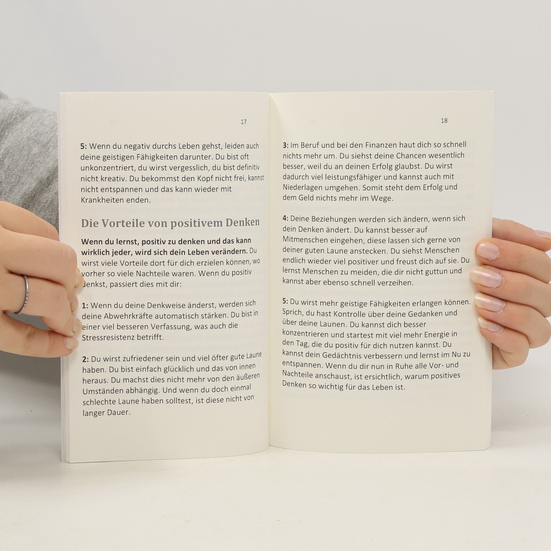 Möchtest du lernen, positiv zu denken und dadurch dein Leben zu verbessern? Dieses Buch bietet dir wertvolle Tipps zur Persönlichkeitsentwicklung und zeigt, dass positives Denken für jeden erlernbar ist. Es hilft dir, deine Gedanken umzukonfigurieren und das Gesetz der Anziehung zu nutzen, nach dem Gleiches Gleiches anzieht. Wenn du positiv denkst, steigerst du deine Energie und Lebensfreude, sodass du auch nach der Arbeit noch Zeit für deine Hobbys hast. Der Ratgeber unterstützt dich dabei, Motivation aufzubauen, in schwierigen Situationen gelassen zu bleiben und Herausforderungen zu meistern. Du hast die Wahl, negativ zu denken und Negatives anzuziehen, oder aktiv an dir zu arbeiten, um das Leben leichter zu gestalten. Erfahre, wie du positive Glaubenssätze nutzen kannst, um glücklich zu sein, und entdecke die Vorteile des positiven Denkens. Lerne, mit Negativität umzugehen und Stress zu reduzieren. Viele Menschen fühlen sich im hektischen Alltag gefangen, doch du kannst lernen, entspannt und gelassen zu bleiben. Es ist einfacher, als du denkst! Mit nur wenigen Minuten Übung pro Tag kannst du bereits nach zwei Wochen Veränderungen in deinem Leben feststellen. Positives Denken führt zu positiven Erfahrungen, und du kannst dein Leben nach deinen Wünschen gestalten. Setze die Methoden um und erlebe, wie du Stress und Panik hinter dir lässt.