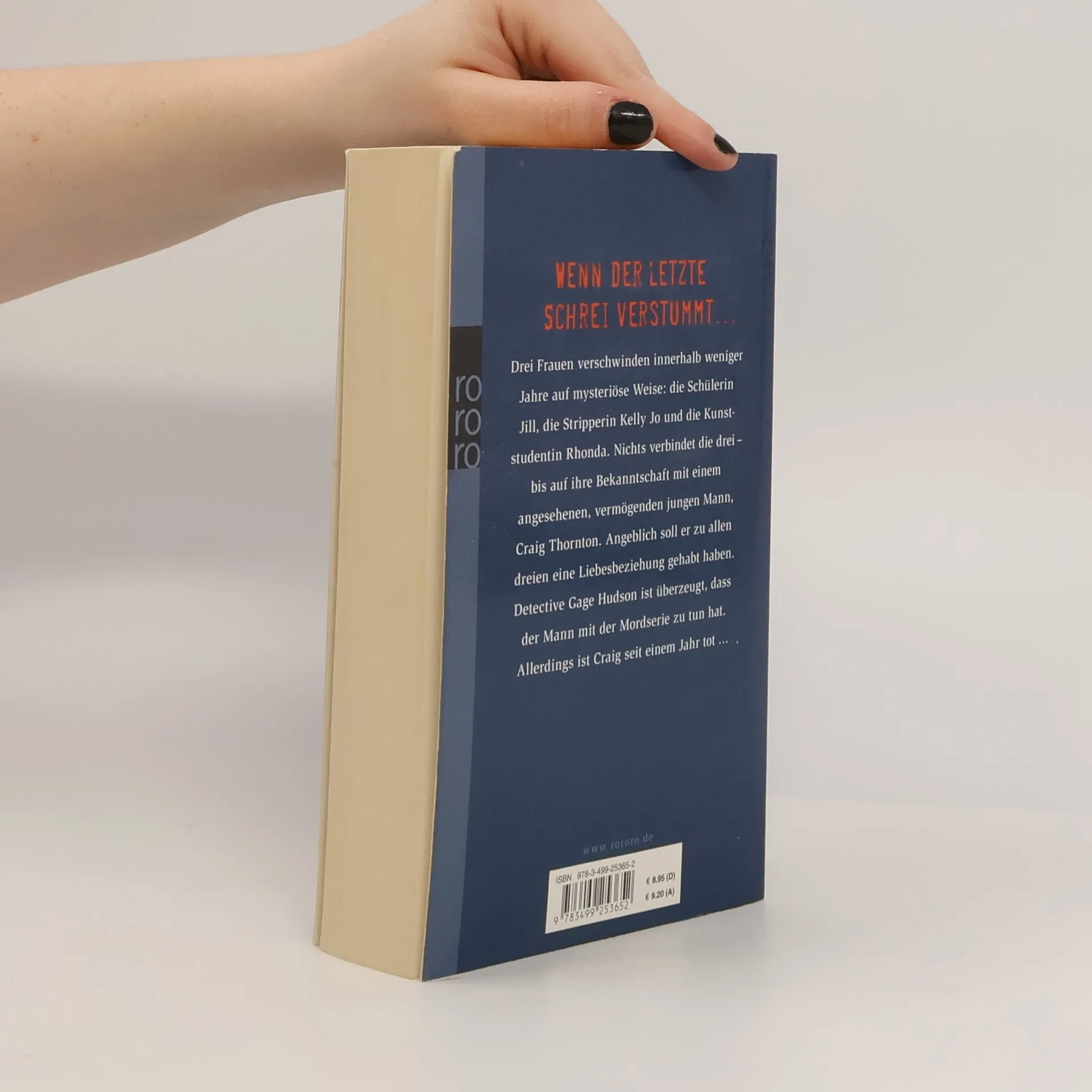 Wenn der letzte Schrei verstummt . . . Drei Frauen verschwinden innerhalb weniger Jahre auf mysteriöse Weise: die Schülerin Jill, die Stripperin Kelly Jo und die Kunststudentin Rhonda. Nichts verbindet die drei– bis auf ihre Bekanntschaft mit einem angesehenen, vermögenden jungen Mann, Craig Thornton. Angeblich soll er zu allen dreien eine Liebesbeziehung gehabt haben. Detective Gage Hudson ist überzeugt, das der Mann mit der Mordserie zu tun hat. Allerdings ist Craig seit einem Jahr tot …