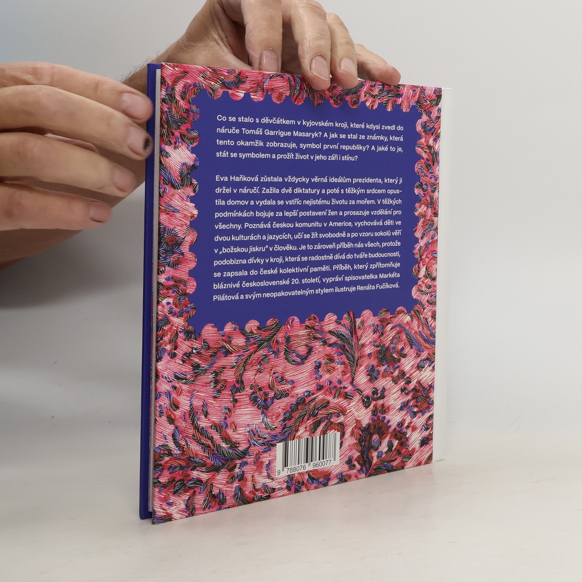 Příběh, který dokonale ilustruje bláznivé československé 20. století. Co se stalo s děvčátkem v kyjovském kroji, které kdysi zvedl do náruče Tomáš Garrigue Masaryk? A jak se stal ze známky, která tento okamžik zobrazuje, symbol první republiky? A jaké to je, stát se symbolem a prožít život v jeho záři i stínu? Eva Haňková zůstala vždycky věrná ideálům prezidenta, který ji držel v náručí. Zažila dvě diktatury a poté s těžkým srdcem opustila domov a vydala se vstříc nejistému životu za mořem. V těžkých podmínkách bojuje za lepší postavení žen a prosazuje vzdělání pro všechny. Poznává českou komunitu v Americe, vychovává děti ve dvou kulturách a jazycích, učí se žít svobodně a po vzoru sokolů věří v „božskou jiskru“ v člověku. Je to zároveň příběh nás všech, protože podobizna dívky v kroji, která se radostně dívá do tváře budoucnosti, se zapsala do české kolektivní paměti. Příběh, který zpřítomňuje bláznivé československé 20. století, vypráví spisovatelka Markéta Pilátová a svým neopakovatelným stylem ilustruje Renáta Fučíková.