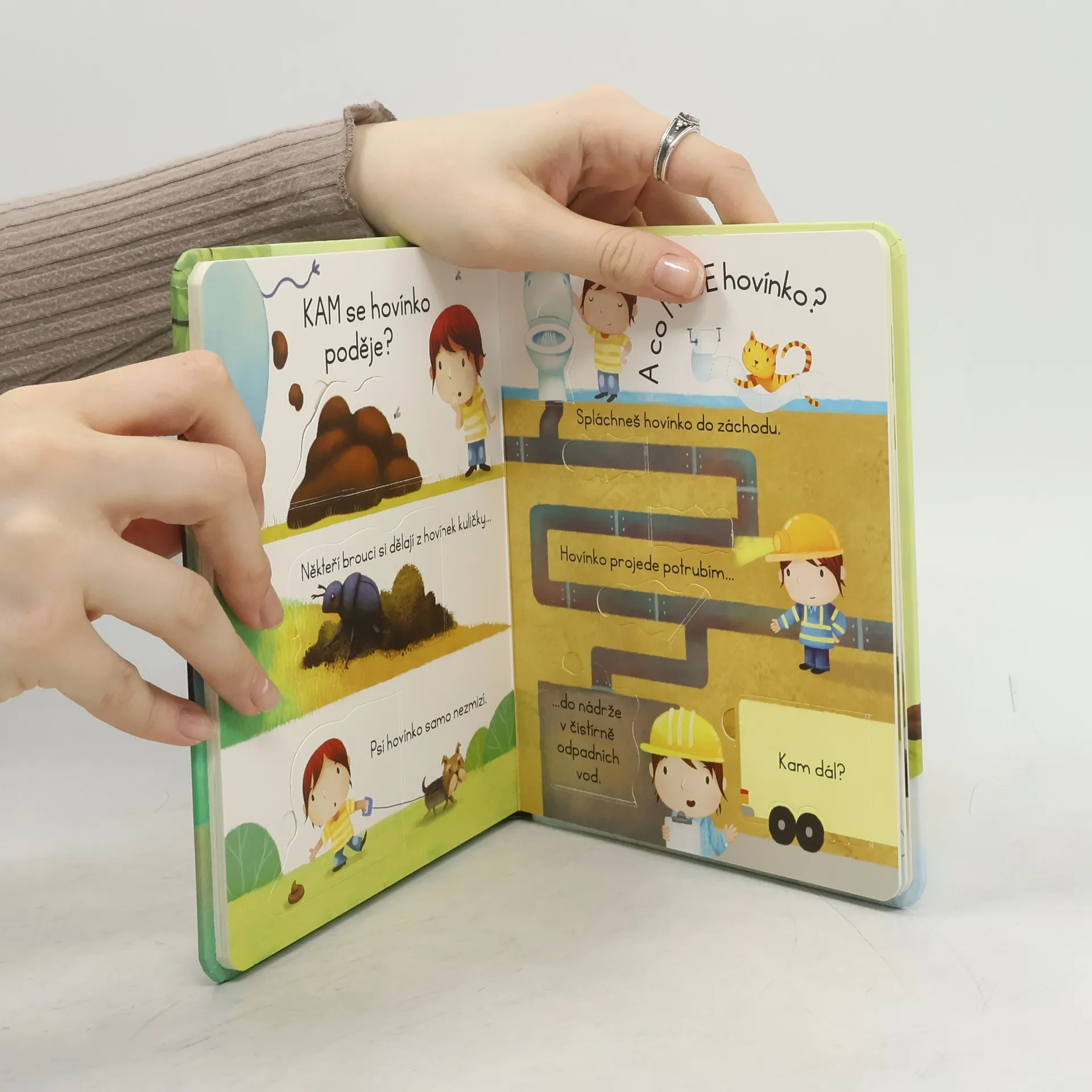 Kakají všichni. Ale co se pak s vykakaným hovínkem stane? Odpovědi naleznete pod okénky v této knížce pro nejmenší. Hovínko se dělá do plíny, splachuje se do záchoda, zvířátka dělají svá hovínka venku... Ale co to vlastně hovínko je? Víš, že jsou brouci, kteří si dělají z hovínek kuličky, a že králík svoje bobky dokonce jí? Na všechny všetečné otázky dětí na téma "Co je to hovínko?" najdou bezradní rodiče odpovědi v této úžasné knížce s odklápěcími okénky.
