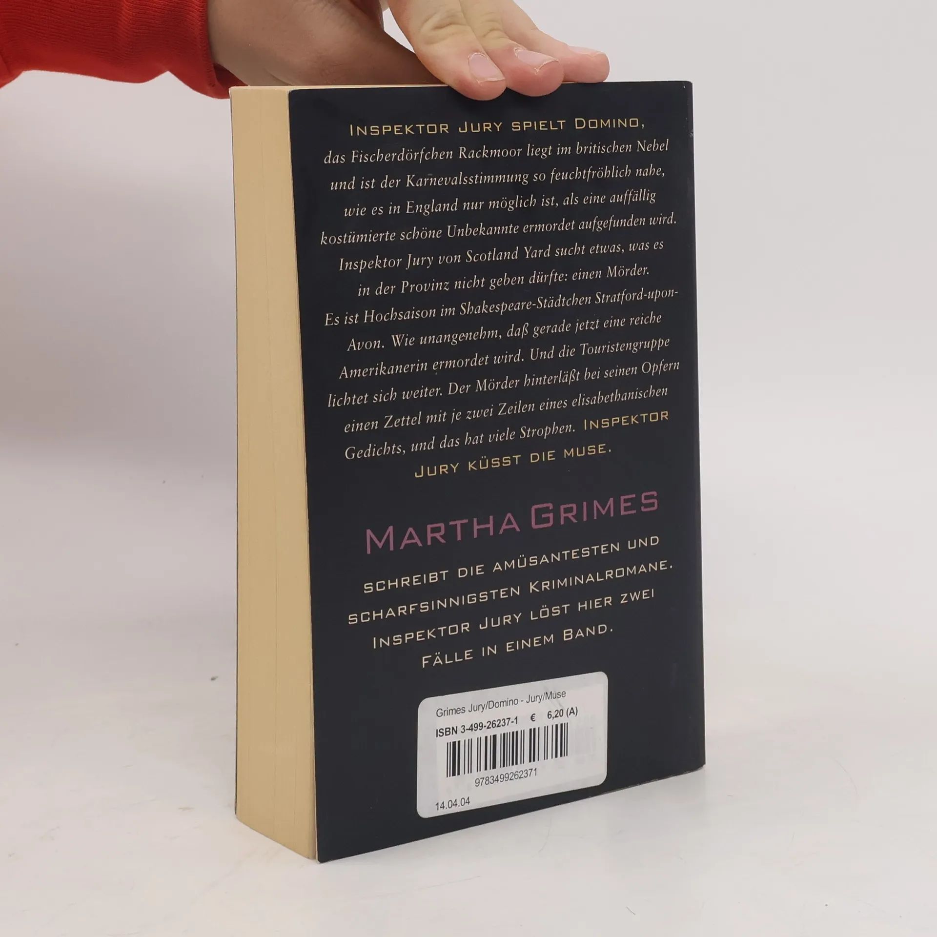 Inspektor Jury spielt DominoDas Fischerdörfchen Rackmoor liegt in britischem Nebel und ist der Karnevalsstimmung so feuchtfröhlich nahe, wie es in England nur möglich ist, als eine auffällig kostümierte schöne Unbekannte ermordet aufgefunden wird. Wieder einmal erhält Inspektor Jury von Scotland Yard den Auftrag, schleunigst aus London abzureisen und seinen geschulten Blick in der Provinz umherschweifen zu lassen – auf der Suche nach etwas, was es im respektablen, auf Jagd, Nebel und wärmende Getränke eingeschworenen Rackmoor nicht geben dürfte: einen Mörder. Oder vielleicht eine Mörderin? Inspektor Jury küßt die MuseEs ist Hochsaison im Shakespeare-Städtchen Stratford-upon-Avon. Wie unangenehm, daß gerade jetzt eine reiche Amerikanerin ermordet wird. Und die Touristen-Gruppe lichtet sich weiter. Der Mörder hinterläßt bei seinen Opfern einen Zettel mit je zwei Zeilen eines elisabethanischen Gedichts, und das hat viele Strophen! Inspektor Jury zieht einen schrulligen Literaturprofessor hinzu.