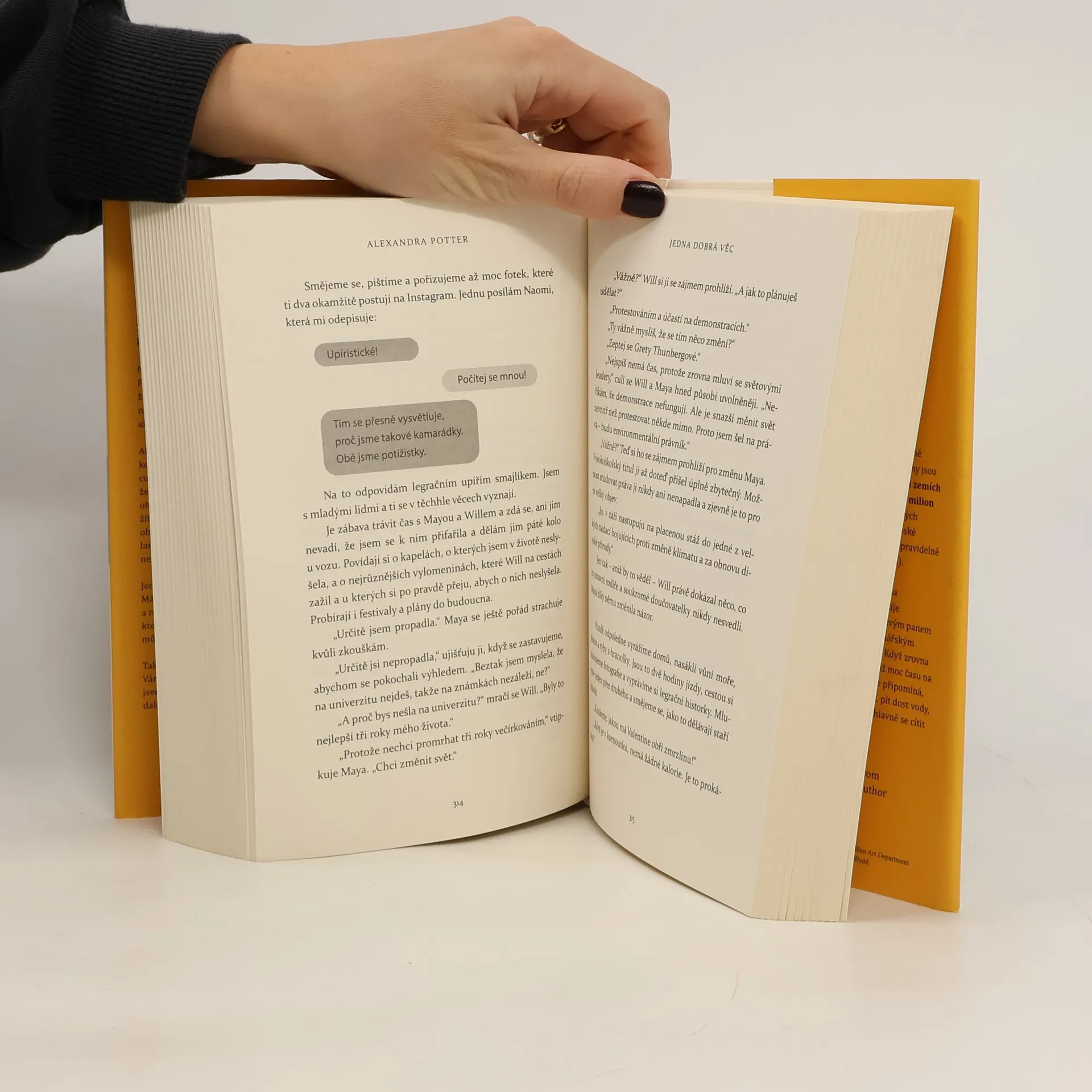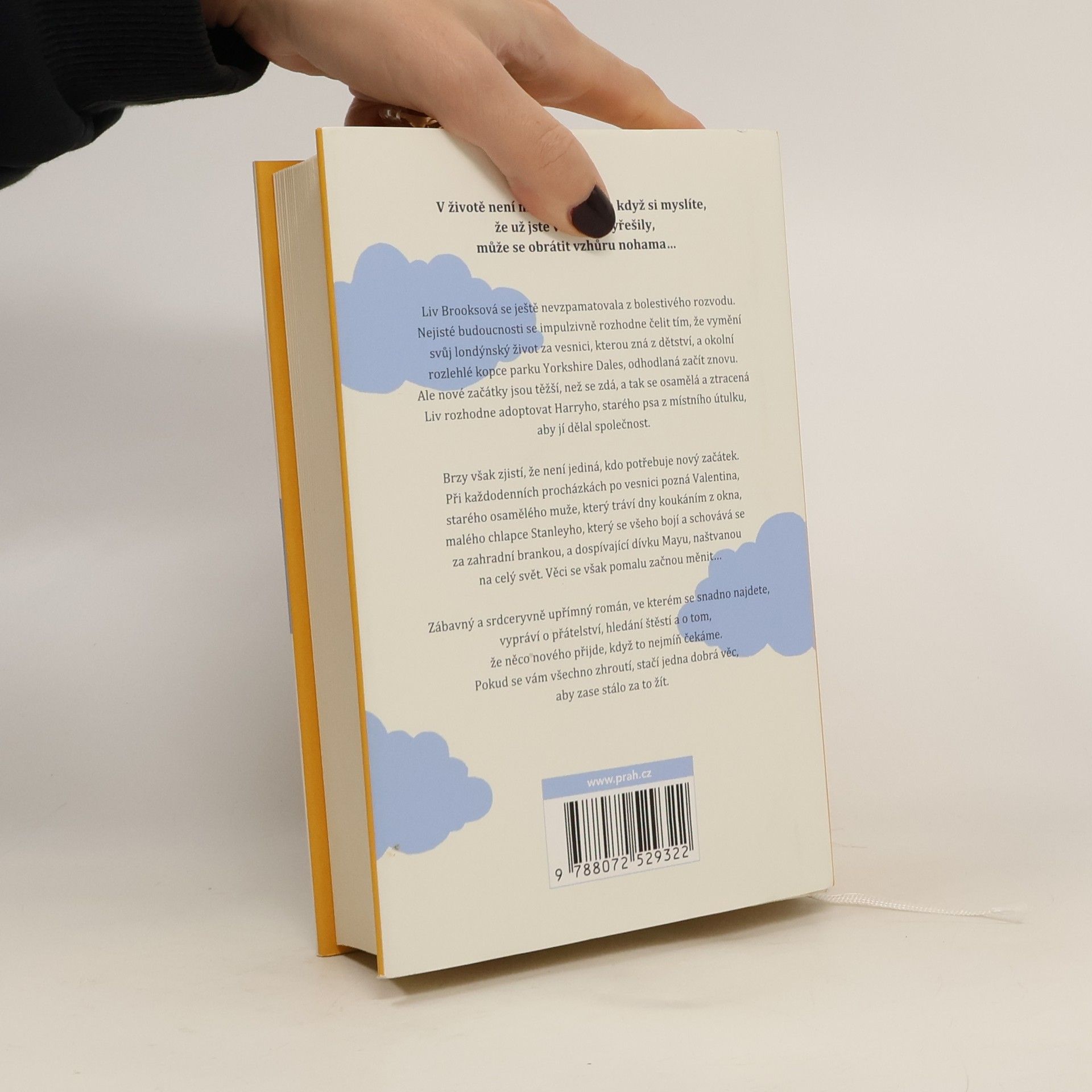 V životě není nic jisté. Zrovna když si myslíte, že už jste všechno vyřešily, může se obrátit vzhůru nohama… Liv Brooksová se ještě nevzpamatovala z bolestivého rozvodu. Nejisté budoucnosti se impulzivně rozhodne čelit tím, že vymění svůj londýnský život za vesnici, kterou zná z dětství, a okolní rozlehlé kopce parku Yorkshire Dales, odhodlaná začít znovu. Ale nové začátky jsou těžší, než se zdá, a tak se osamělá a ztracená Liv rozhodne adoptovat Harryho, starého psa z místního útulku, aby jí dělal společnost. Brzy však zjistí, že není jediná, kdo potřebuje novy´ začátek. Při každodenních procházkách po vesnici pozná Valentina, starého osamělého muže, který tráví dny koukáním z okna, malého chlapce Stanleyho, který se všeho bojí a schovává se za zahradní brankou, a dospívající dívku Mayu, naštvanou na cely´ svět. Věci se však pomalu začnou měnit… Zábavný a srdceryvně upřímný román, ve kterém se snadno najdete, vypráví o přátelství, hledání štěstí a o tom, že něco nového přijde, když to nejmíň čekáme. Pokud se vám všechno zhroutí, stačí jedna dobrá věc, aby zase stálo za to žít.
