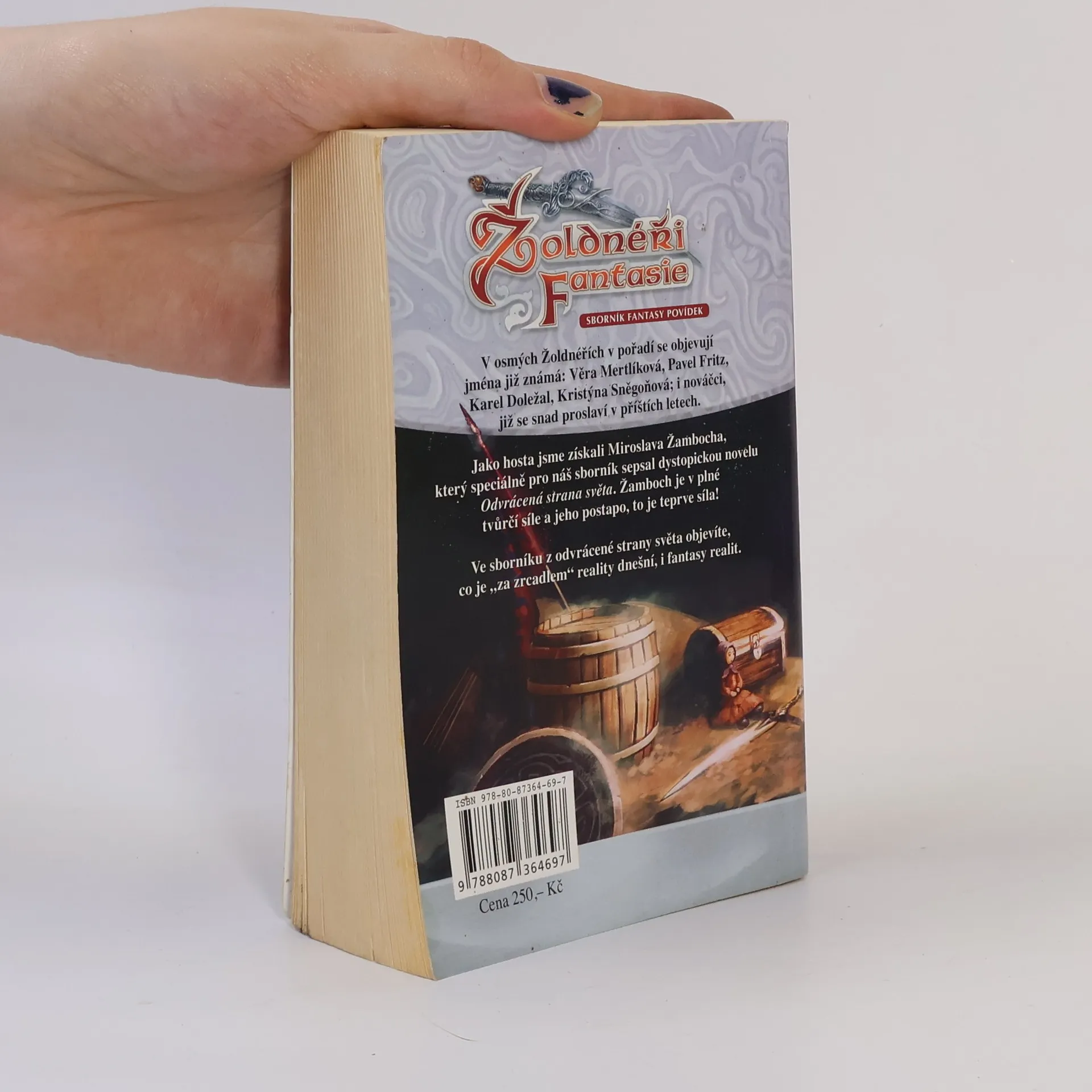 V osmých Žoldnéřích v pořadí se objevují jména již známá: Věra Mertlíková, Pavel Fritz, Karel Doležal, Kristýna Sněgoňová; i nováčci, již se snad proslaví v příštích letech. Jako hosta jsme získali Miroslava Žambocha, který speciálně pro náš sborník sepsal dystopickou novelu Odvrácená strana světa. Žamboch je v plné tvůrčí síle a jeho postapo, to je teprve síla! Ve sborníku z odvrácené strany světa objevíte, co je za zrcadlem reality dnešní, i fantasy realit. Jedná se o speciální vydání se skicovou mutací obálky, které vyšlo jen ve velice omezeném počtu.