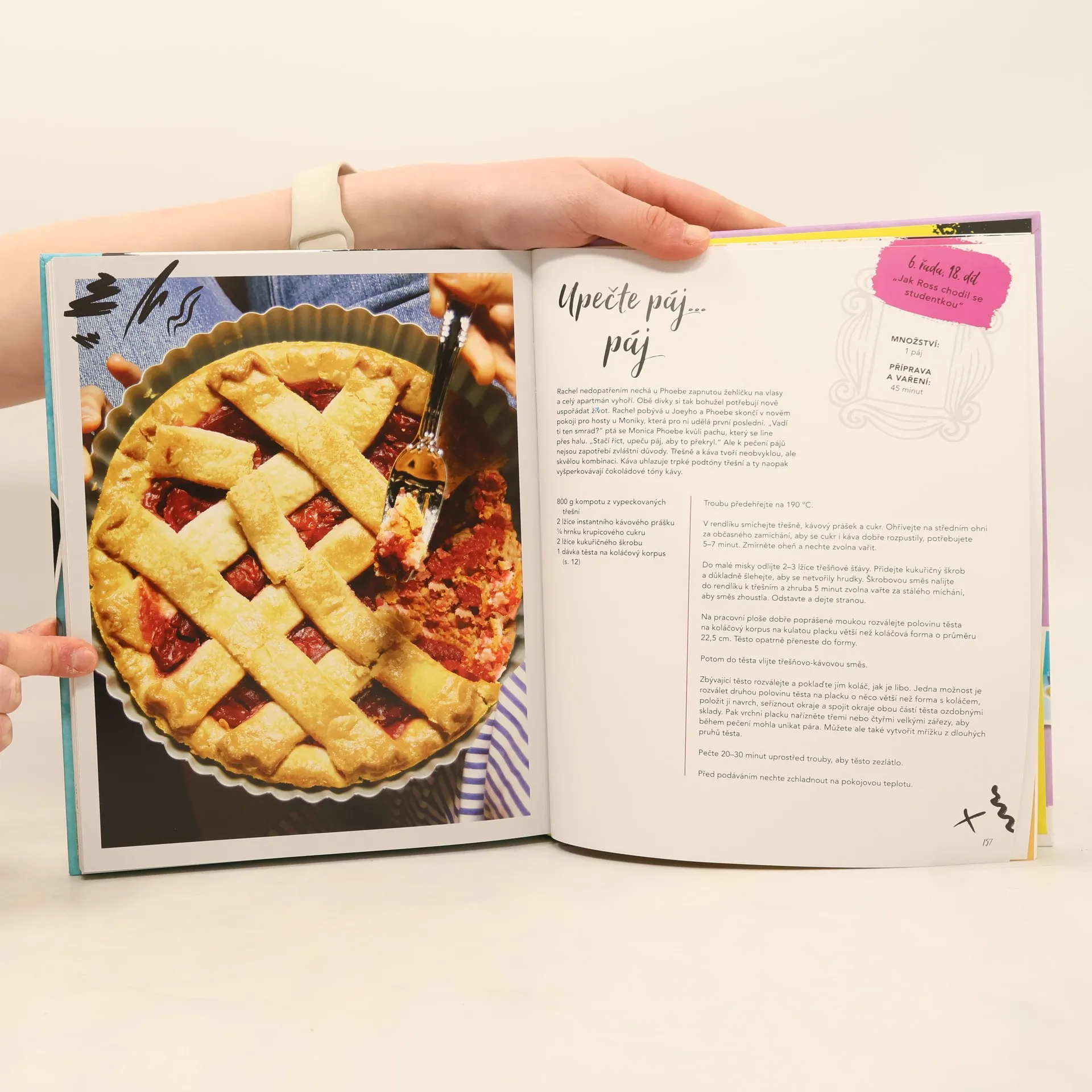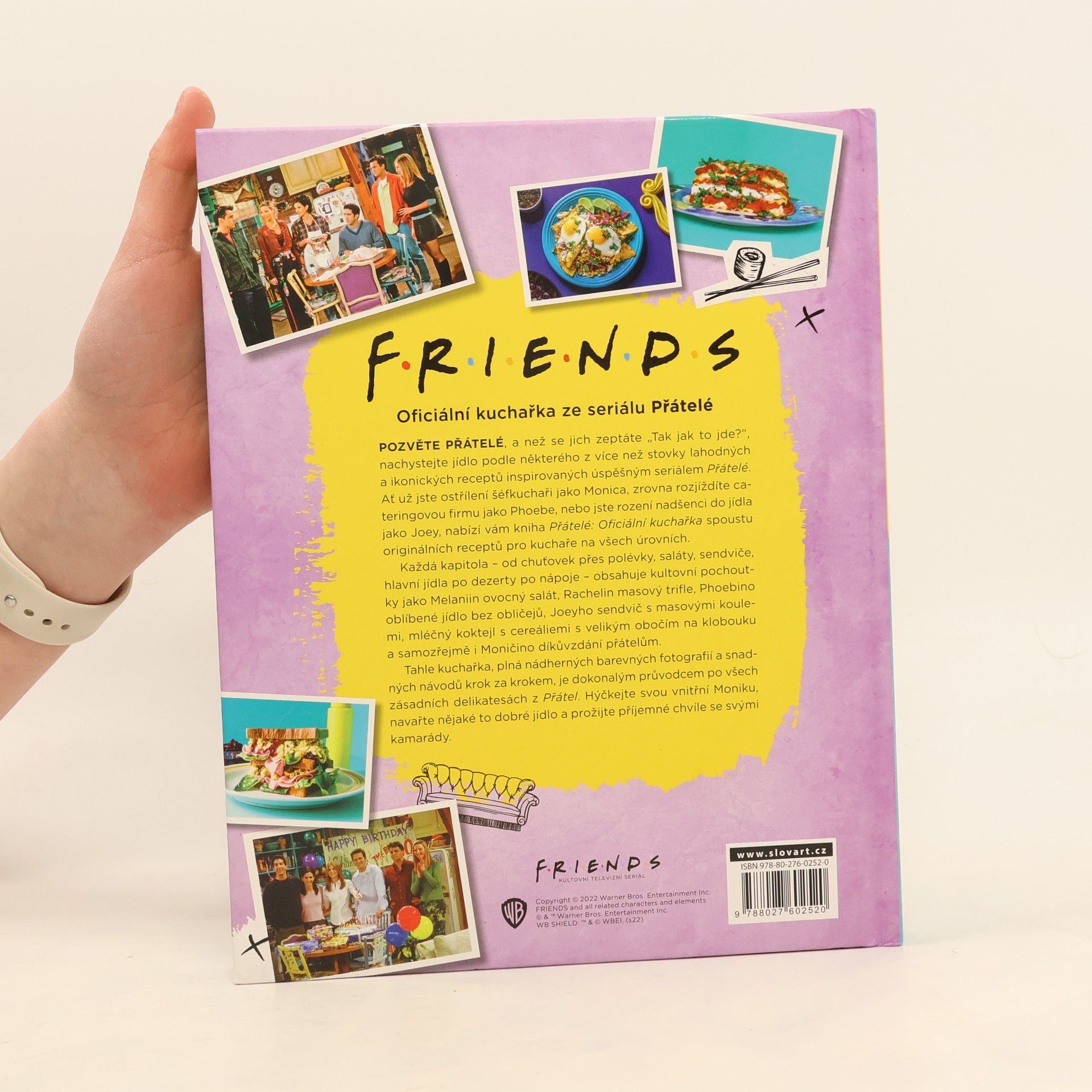 Pozvěte kamarády a nachystejte jídlo podle některého z více než stovky ikonických receptů inspirovaných úspěšným seriálem Přátelé. Když si znovu pustíte jednotlivé epizody, jistě si uvědomíte, že jídlo je jeden z pilířů lidské pospolitosti. Právě nadčasovost a uvěřitelnost příběhů odehrávajících se kolem jídla utkvěla v paměti fanouškům na celém světě. Ať už jste ostřílení šéfkuchaři jako Monica, rozjíždíte cateringovou firmu jako Phoebe, nebo jste rození fanatici jídla jako Joey, nabízíme vám spoustu originálních receptů pro kuchaře na všech úrovních. Každá kapitola - chuťovky, polévky, saláty, sendviče, hlavní jídla, dezerty a nápoje - nabízí kultovní pochoutky jako Rachelin masový trifle, Phoebiny kelímky s granitou, Joeyho sendvič s masovými koulemi, vejce pro Chandlera, Rossovy ruce pálící fajitas i Moničino díkůvzdání přátelům.Kuchařka plná barevných fotografií a snadných návodů je dokonalým průvodcem po všech zásadních delikatesách z Přátel.