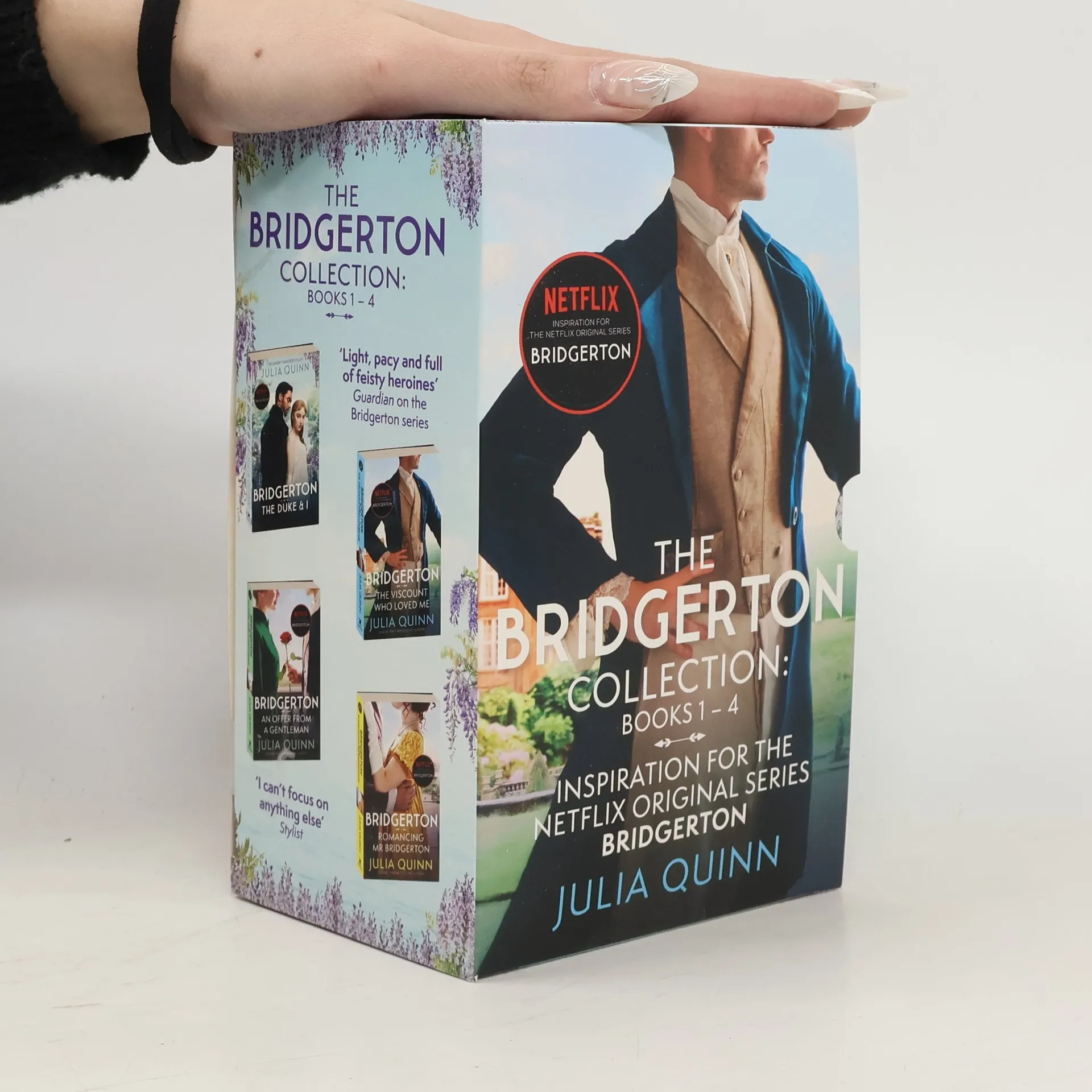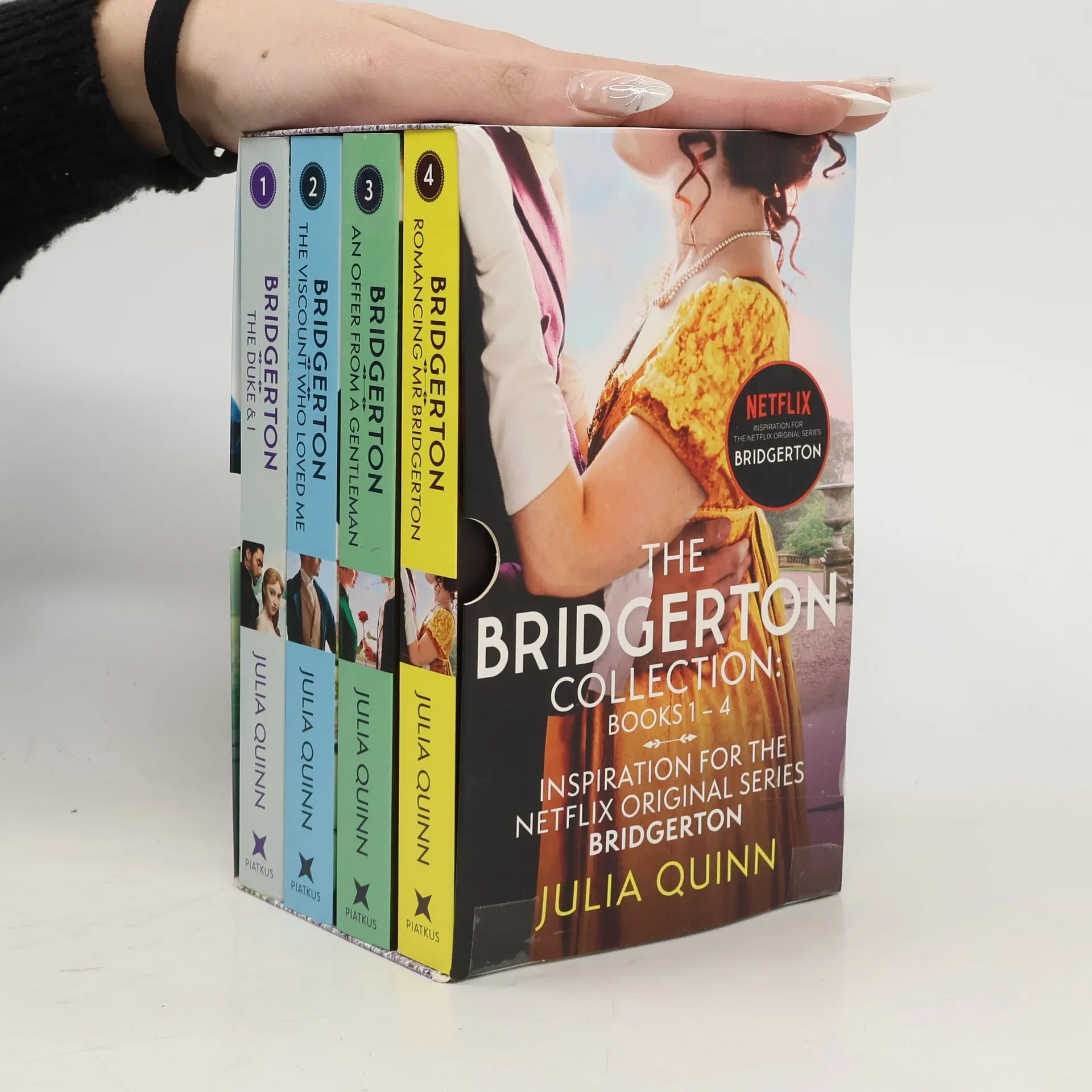 Escape to the ballrooms of Regency London with this beautifully designed boxset of the first four books in the worldwide bestselling Bridgerton series, the inspiration behind the Netflix phenomenon. In this glamorous, witty series, the Bridgertons reign over the Ton, watched (and gossiped about) by a mysterious columnist known only as Lady Whistledown. Book 1 : The Duke & I : Simon Basset appears on the verge of proposing to the lovely Daphne Bridgerton. But secretly their affair is a ruse to escape marriage-minded society mothers. Or is it? Amidst the glittering, gossipy, cut-throat world of London's elite, there is only one certainty : love ignores every rule. Book 2 : The Viscount Who Loved Me : Anthony Bridgerton needs a wife. As the oldest son, he knows it's high time he settled down and ensured the continuation of the Bridgerton line. What a shame then, that he seems to have fallen in love with entirely the wrong woman. Book 3 : An Offer From a Gentleman : One ball, one unknown woman and one magical night, changed everything for Benedict Bridgerton. Now, he has sworn to find and wed his mystery miss, for he knows this is his only chance for a fairy tale love story. Book 4 : Romancing Mr Bridgerton : Penelope Featherington has loved her best friend's brother, Colin Bridgerton, ever since she was a girl. When she discovers his deepest secret she must decide : is it time to share her own?