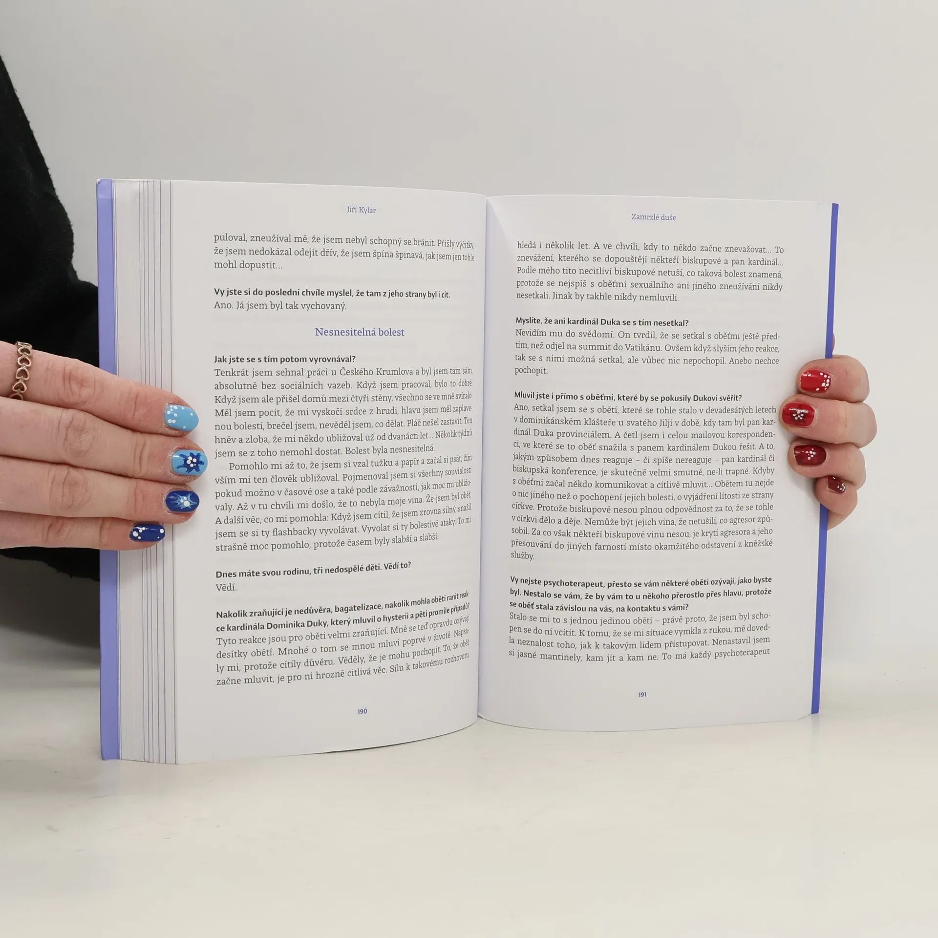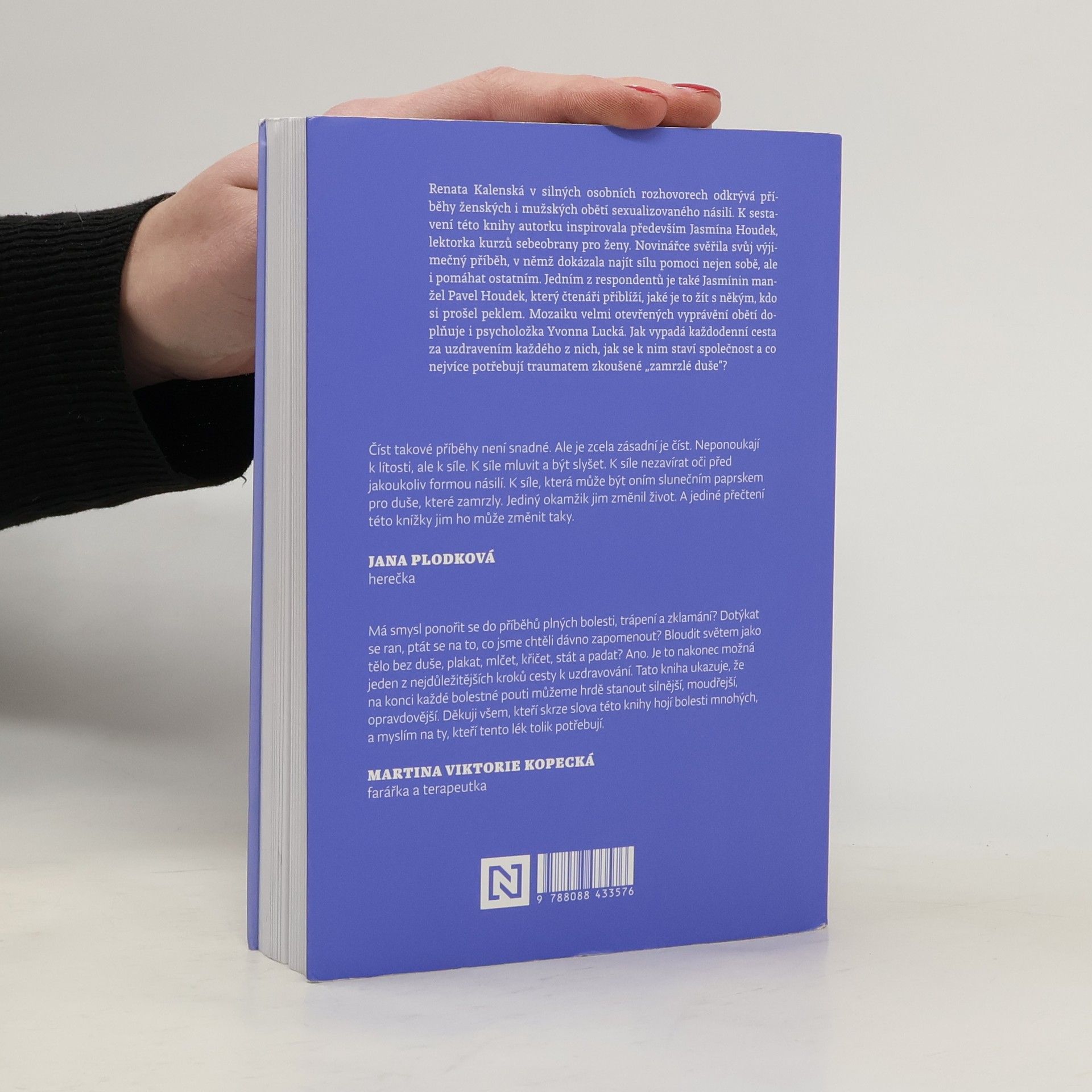 Renata Kalenská v silných osobních rozhovorech odkrývá příběhy ženských i mužských obětí sexualizovaného násilí. K sestavení této knihy autorku inspirovala především Jasmína Houdek, lektorka kurzů sebeobrany pro ženy. Novinářce svěřila svůj výjimečný příběh, v němž dokázala najít sílu pomoci nejen sobě, ale i pomáhat ostatním. Jedním z respondentů je také Jasmínin manžel Pavel Houdek, který čtenáři přiblíží, jaké je to žít s někým, kdo si prošel peklem. Mozaiku velmi otevřených vyprávění obětí doplňuje i psycholožka Yvonna Lucká. Jak vypadá každodenní cesta za uzdravením každého z nich, jak se k nim staví společnost a co nejvíce potřebují traumatem zkoušené „zamrzlé duše“?
