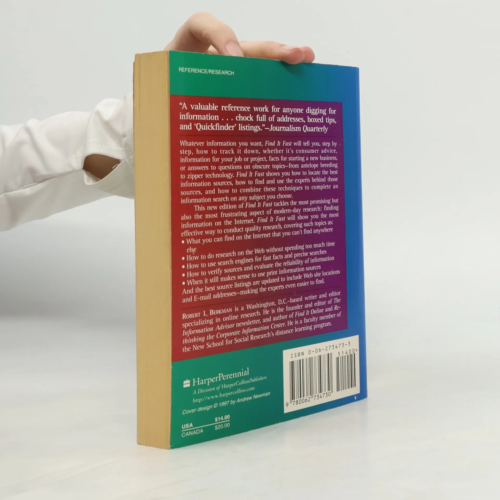 Find It Fast provides step-by-step instructions for finding out anything a reader wants to know, including consumer advice, job information, facts for starting a new business and answers on obscure topics. In this 4th Edition, Berkman promises to help researchers untangle the Web and find the most authoritative, accurate data available. He provides guidance for the many researchers and writers who haven't yet sifted out the really valuable sources, and reveals the best way to use the Internet and CD-ROM databases to locate experts, and conduct a thorough and effective information search. Throughout are valuable tips on getting the most out of sources, plus dozens of firsthand examples demonstrating effective information-search strategies at work. This new edition also includes updated names, addresses and phone numbers.