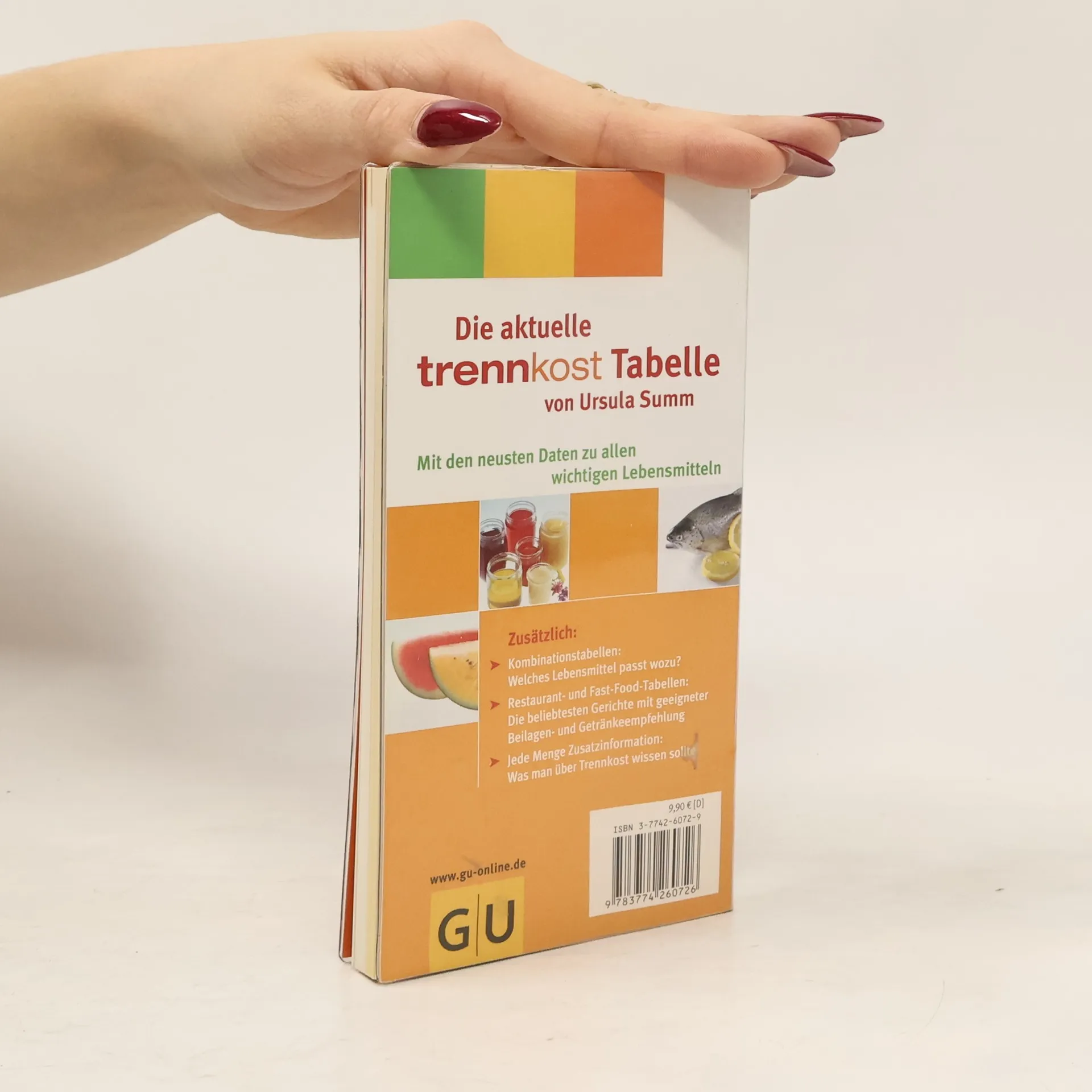 Mit ihrer neuen GU-Trennkost-Reihe stellt Erfolgsautorin Ursula Summ ihre erweiterte Trennkost vor. Die neue Trennkost-Tabelle bietet einen Überblick über die wichtigsten Lebensmittel auf aktuellstem Stand. Klar und übersichtlich durch die etablierten GU-Summ-Trennkost-Farben bietet die Tabelle eine schnelle Orientierung zu Hause, im Supermarkt und Unterwegs: Unterteilt nach einzelnen Lebensmittelgruppen, mit Angabe der Kalorien und Gruppenzugehörigkeit, mit Kombinationstabelle und Extra-Tabelle für typische Restaurant- und Fast-Food-Gerichte. In Verbindung mit dem Einführungstext und der Vorstellung eines idealen Trennkosttages finden so auch Trennkostanfänger die nötige Hilfe und einen leichten Einstieg.