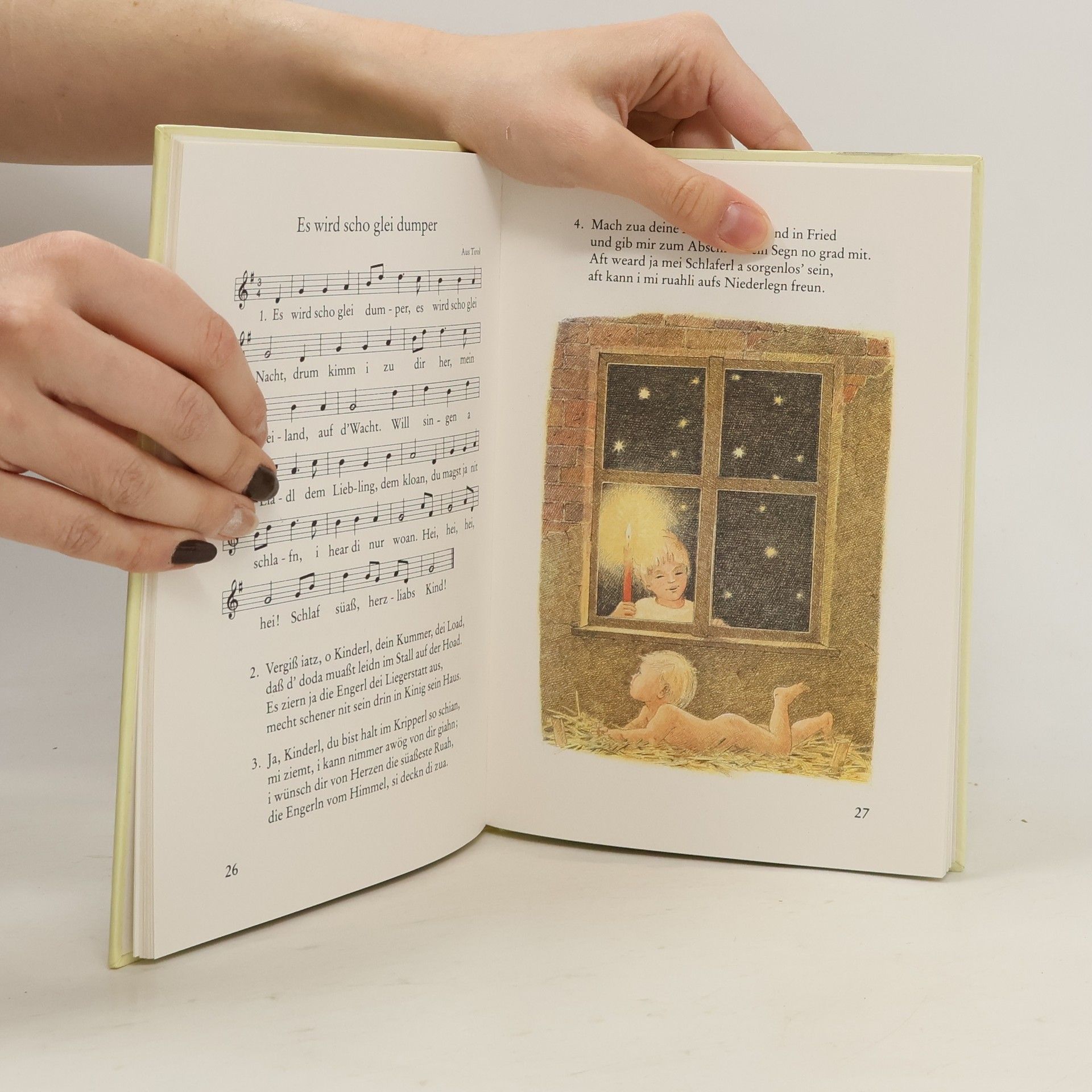 35 reich illustrierte Weihnachstlieder aus alter und neuer Zeit jeweils mit Notenbild für eine Singstimme.
