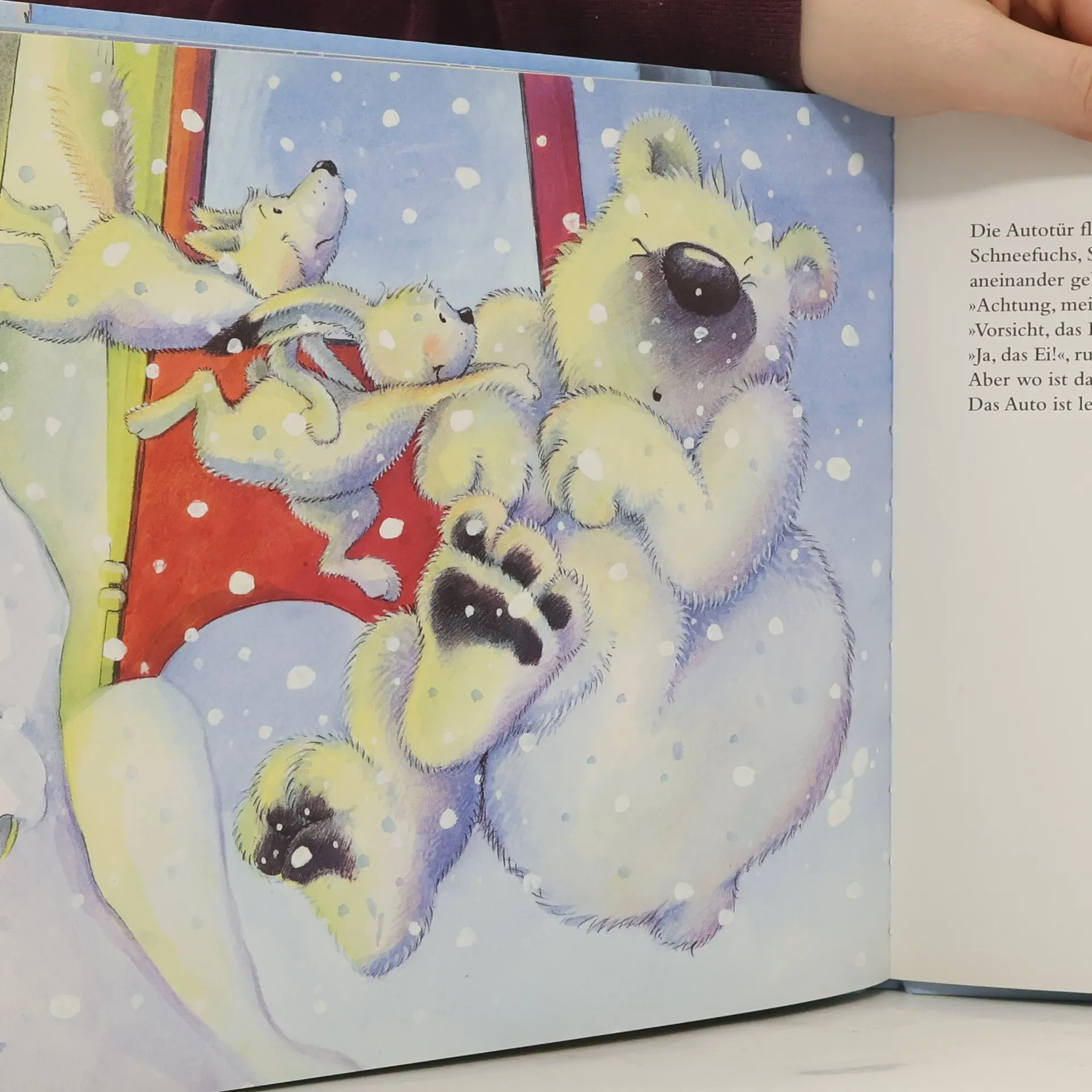 Ein Schneefuchs, ein Eisbär und ein Schneehase suchen am Nordpol Schutz in einem Auto. Schließlich bringt noch ein Pinguinmännchen und werdender Vater sein Ei in das wärmende Auto, um eine Runde fischen zu gehen. Doch genau in diesem Moment schlüpft der kleine Pinguin ..