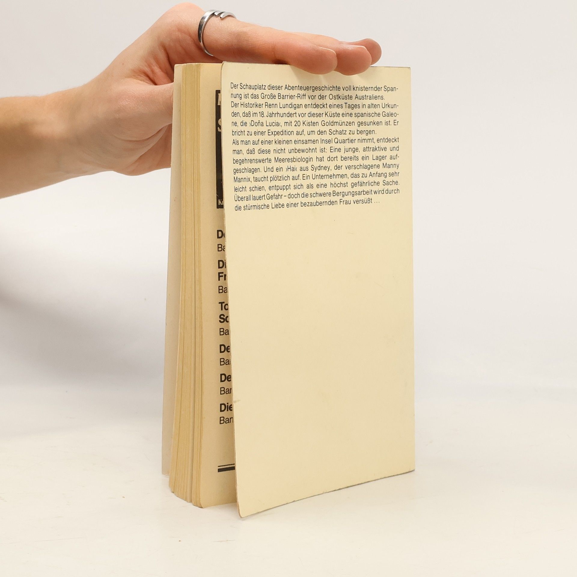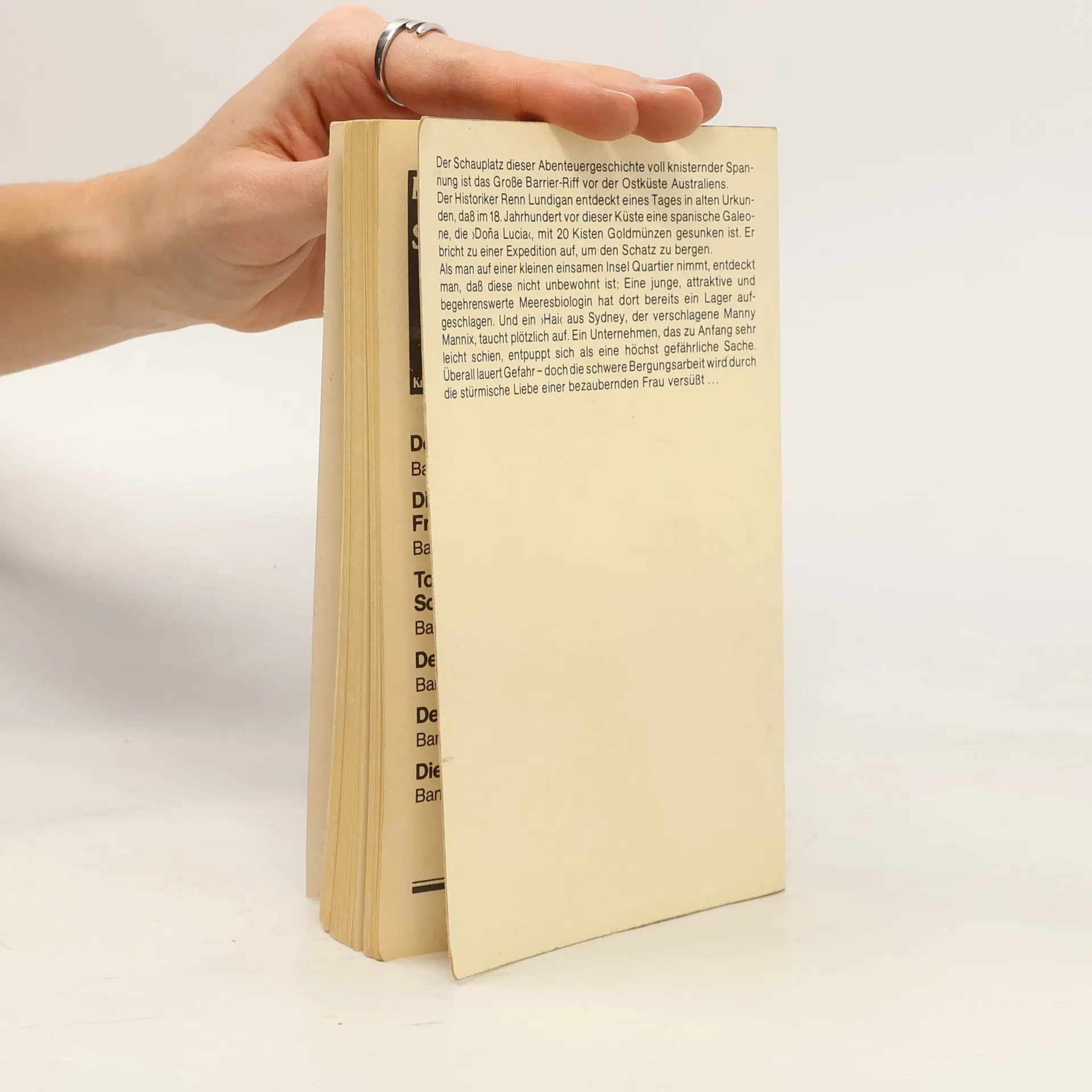 Der Schauplatz dieser Abenteuergeschichte voll knisternder Spannung ist die Ostküste Australiens. Der Historiker Renn Lundigan entdeckt eines Tages in alten Urkunde, dass im 18.Jahrhundert vor dieser Küste eine spanische Galeone, die Dona Lucia, mit 20 Kisten Goldmünzen gesunken ist. Er bricht zu einer Expedition auf, um den Schatz zu bergen. Doch eine junge, hübsche und begehrenswerte Meeresbiologin hat dort bereits ein Lager aufgeschlagen. Ein mörderisches Spiel beginnt.