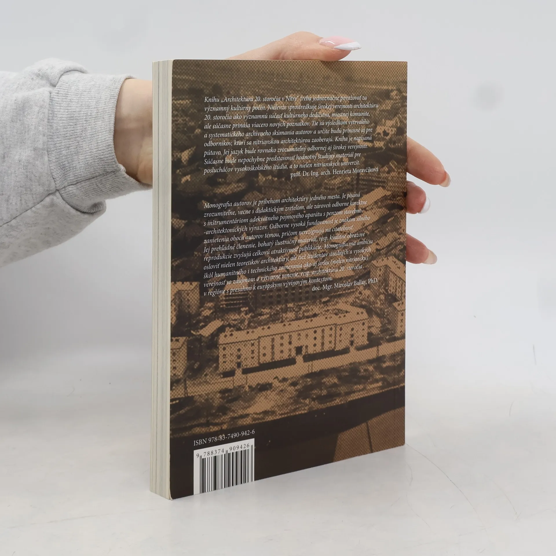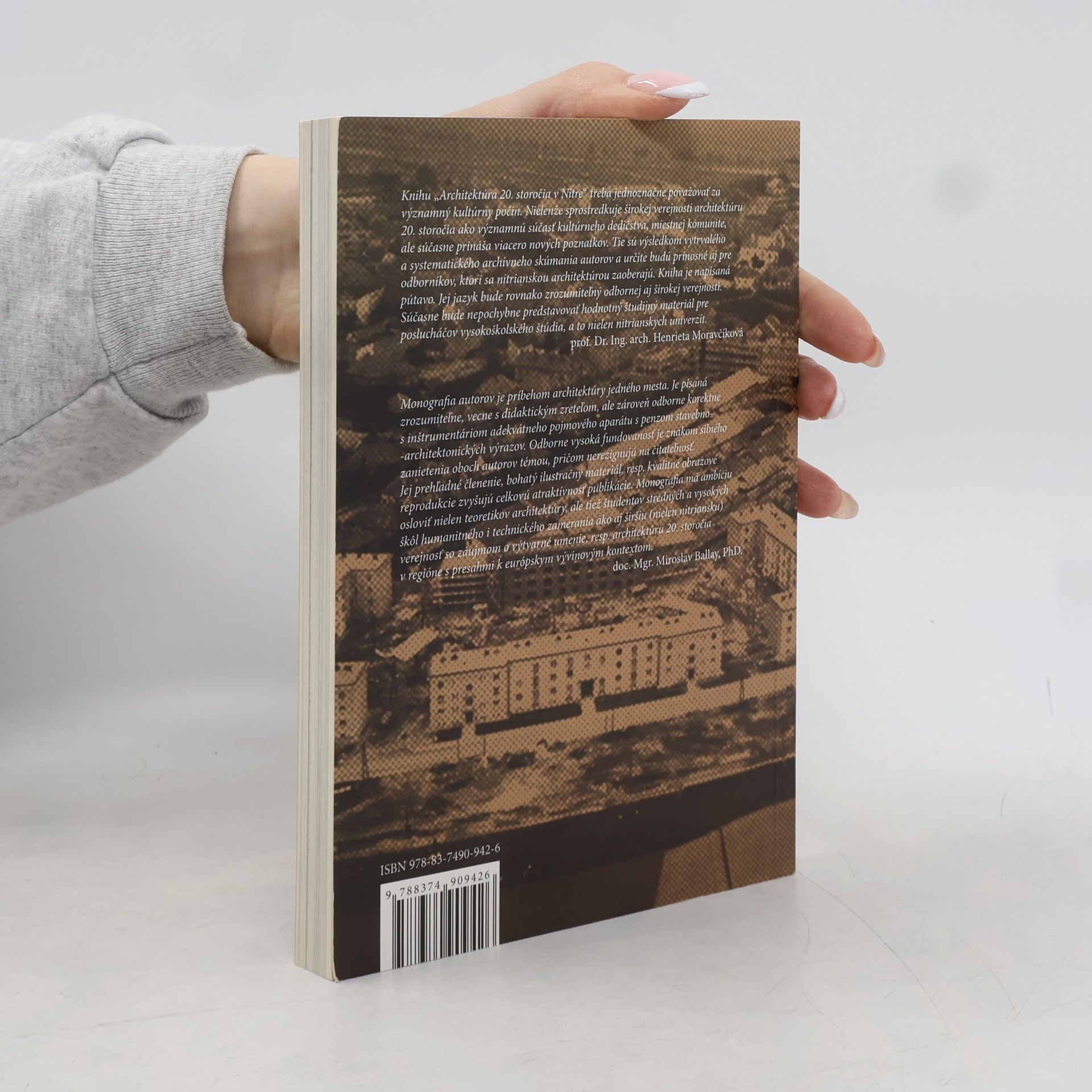 Monografia „Architektúra 20. storočia v Nitre. Stav poznania“ je výsledkom úsilia dvoch ľudí, ktorí cítili povinnosť a potrebu podrobnejšie preskúmať architektonické kultúrne dedičstvo svojho mesta. Na jednej strane si boli vedomí vysokej koncentrácie hodnotnej architektúry z 20. storočia na jeho území a na strane druhej si uvedomovali skutočnosť, že Nitrania, či presnejšie „Nitránčani“, jej venujú len minimálnu pozornosť. Autori predstavujú širšej verejnosti architektov a ich diela súborne formou krátkych hutných textov usporiadaných do kapitol podľa chronológie vývinu architektúry v priebehu storočia. Vďaka archívnemu výskumu kniha spresňuje rozchádzajúce sa fakty o známych stavbách, neraz národných kultúrnych pamiatkach, nanovo predstavuje architektov, ktorí načas upadli do zabudnutia, identifikuje autorov hodnotných, no doteraz autorsky anonymných budov v meste, porovnáva pôvodné projekty s konečnými realizáciami a vedľa realizovaných projektov ako rovnocenné kladie tie, ktoré zostali len v plánoch. Text publikácie sprevádzajú dobové plány a fotografie.