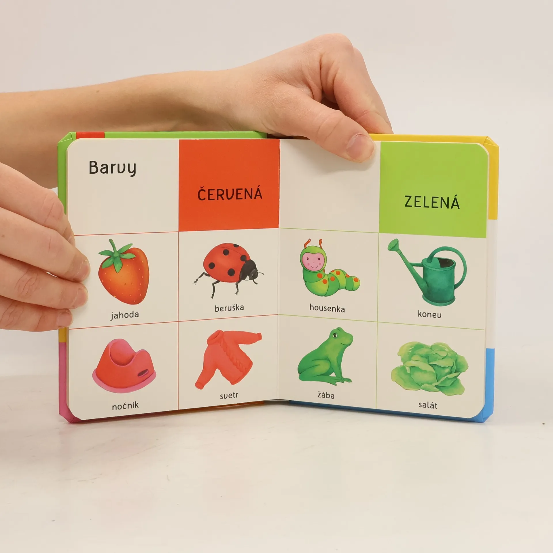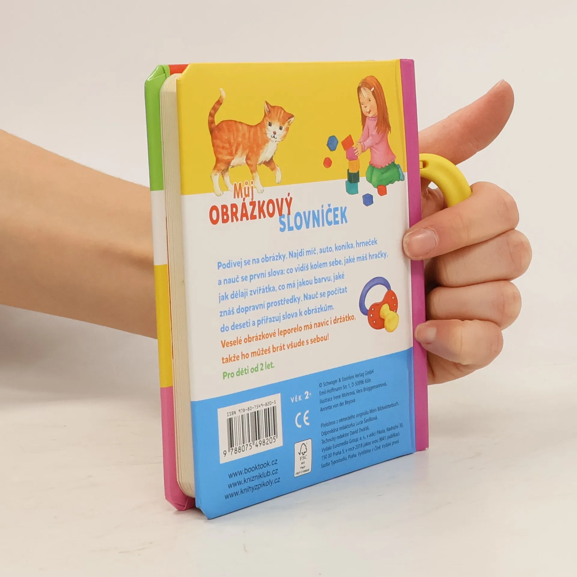 Podívej se na obrázky! Najdi míč, auto, koníčka, hrneček a nauč se svoje první slova: co vidíš kolem sebe, jaké máš hračky, jak dělají zvířátka, co má jakou barvu, jaké znáš dopravní prostředky. Nauč se počítat do deseti a přiřazuj slova k obrázkům.Veselé obrázkové leporelo má navíc i držátko, takže je možné brát ho všude s sebou!