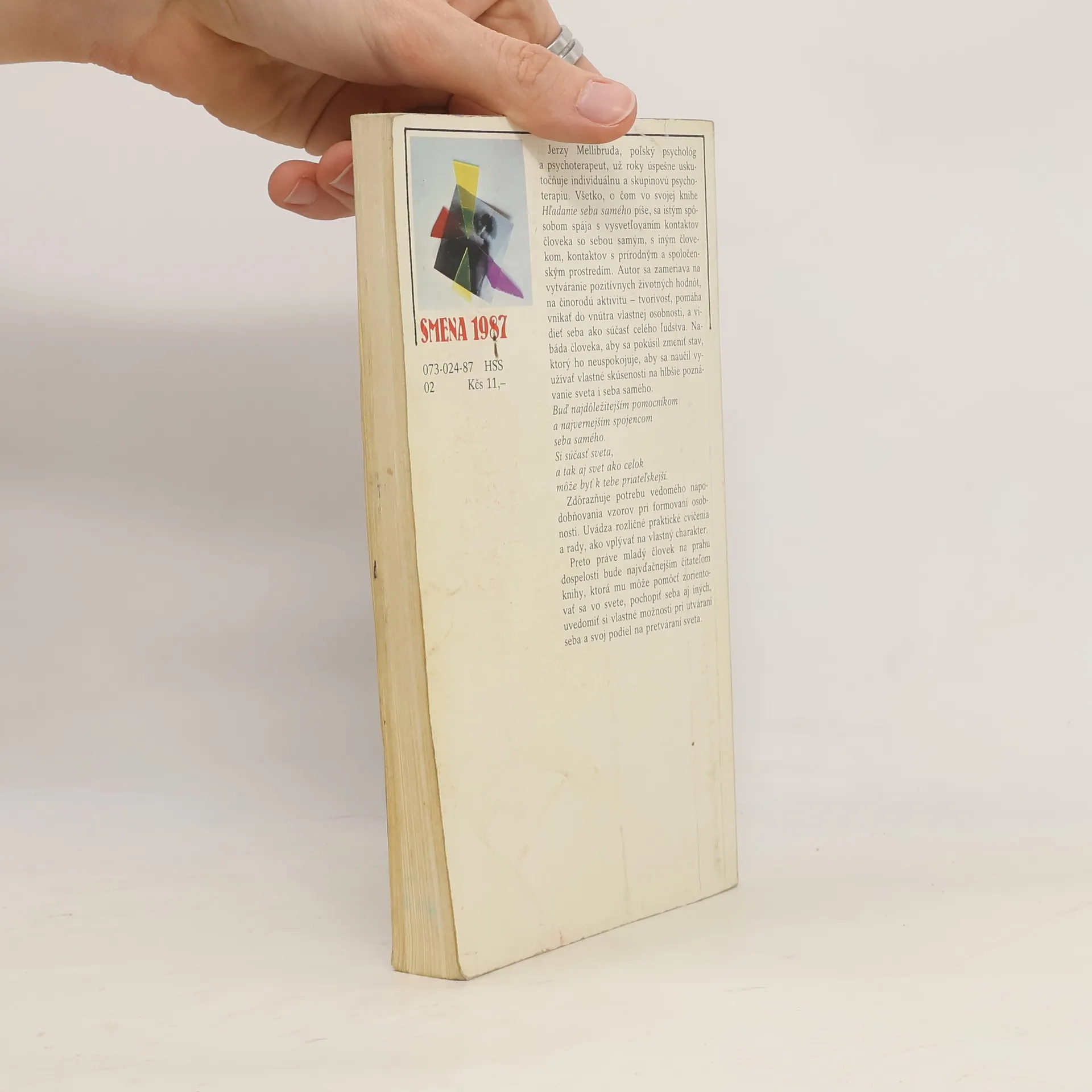 Jerzy Mellibruda, poľský psychológ a psychoterapeut, už roky úspešne uskutočňuje individuálnu a skupinovú psychoterapiu. Všetko, o čom vo svojej knihe Hľadanie seba samého píše, sa istým spôsobom spája s vysvetľovaním kontaktov človeka so sebou samým, s iným človekom, kontaktov s prírodným a spoločenským prostredím. Autor sa zameriava na vytváranie pozitívnych životných hodnôt, na činorodú aktivitu - tvorivosť, pomáha vnikať do vnútra vlastnej osobnosti, a vidieť seba ako súčasť celého ľudstva. Nabáda človeka, aby sa pokúsil zmeniť stav, ktorý ho neuspokojuje, aby sa naučil využívať vlastné skúsenosti na hlbšie poznávanie sveta i seba samého. Buď najdôležitejším pomocníkom a najvernejším spojencom seba samého. Si súčasť sveta, a tak aj svet ako celok môže byť k tebe priateľskejší. Zdôrazňuje potrebu vedomého napodobňovania vzorov pri formovaní osobnosti. Uvádza rozličné praktické cvičenia a rady, ako vplývať na vlastný charakter. Preto práve mladý človek na prahu dospelosti bude najvďačnejším čitateľom knihy, ktorá mu môže pomôcť zorientovať sa vo svete, pochopiť seba aj iných, uvedomiť si vlastné možnosti pri utváraní seba a svoj podiel na pretváraní sveta.