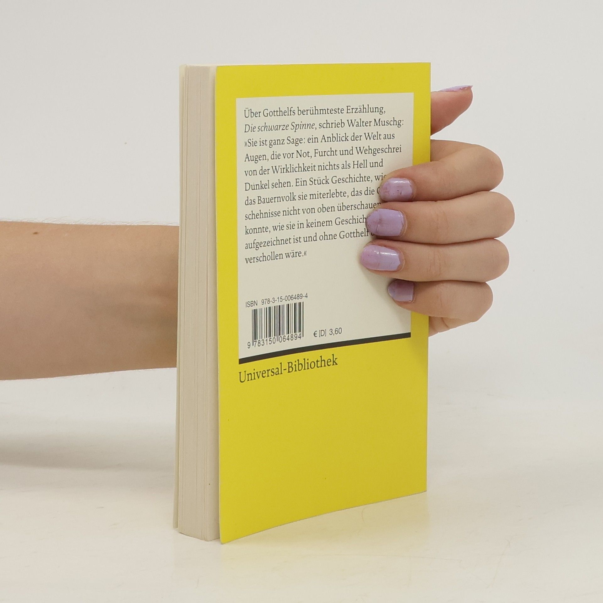 'Die schwarze Spinne' (erschienen 1842) ist die berühmteste Novelle Jeremias Gotthelfs und ein Meisterwerk der Erzählliteratur des Biedermeier. In der kunstvoll aufgebauten Novelle mit ihrer komplexen Erzählstruktur wird eine Geschichte um Gottlosigkeit und Aberglauben erzählt. In zwei legendenartigen Rückblicken berichtet ein Großvater vom tödlichen Wüten einer teuflischen Spinne und der Rettung durch christlich-heldenmütige Gesinnung. Versinnlicht wird die didaktische Absicht des Autors durch die genrehafte Schilderung der Dorfwelt und eine Sprachkraft, die die groteske Handlung in ihrer ganzen Phantastik entfaltet. Text in neuer Rechtschreibung. - Mit Anmerkungen von Wolfgang Mieder.