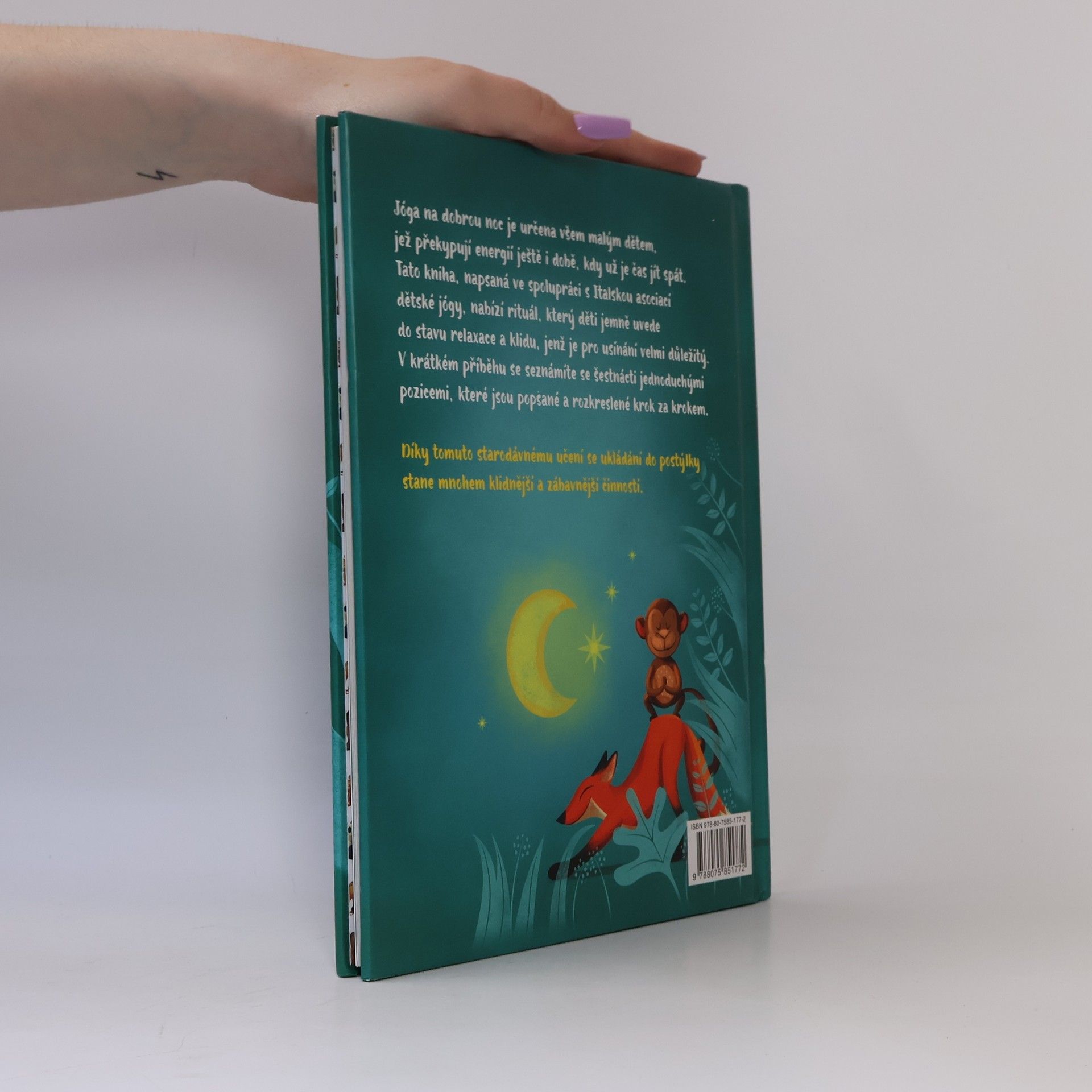 Uvolňující pozice pro děti před spaním. Jóga na dobrou noc je určena všem malým dětem, jež překypují energií ještě i době, kdy už je čas jít spát. Tato kniha, napsaná ve spolupráci s Italskou asociací dětské jógy, nabízí rituál, který děti jemně uvede do stavu relaxace a klidu, jenž je pro usínání velmi důležitý. V krátkém příběhu se představí šestnáct jednoduchých pozic, vysvětlených a rozkreslených krok za krokem. Díky tomuto starodávnému učení se ukládání do postýlky stane mnohem klidnější a zábavnější záležitostí.