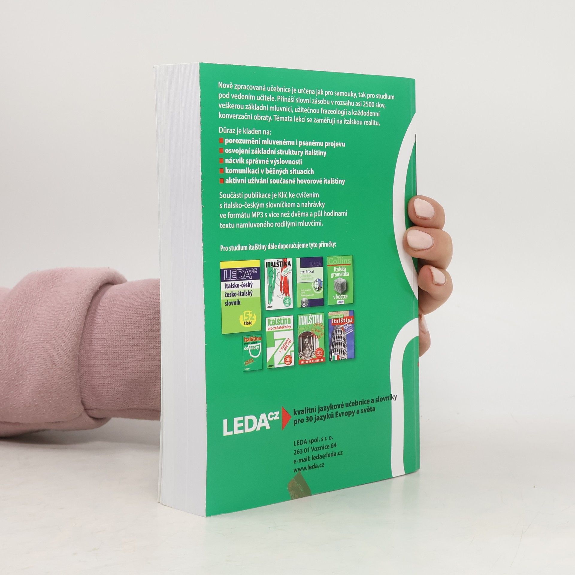 Nově zpracované vydání oblíbené učebnice pro samouky obsahuje italskou mluvnici, slovní­ zásobu v rozsahu asi 2500 slov, frazeologii a výslovnost. Důraz je kladen na aktivní­ užívání­ italštiny, schopnost dorozumět se a pohotově reagovat v nejčastější­ch situacích. Každou lekci uzavírají­ kvizy, které mají vzbudit zájem uživatele o kulturu Itálie. Učebnice je určena také pro kursy a školy. Její součástí je klíč ke cvičení­m s italsko-českým a česko-italským slovníčkem v samostatné brožuře a nahrávka vybraných textů na dvou audio CD.