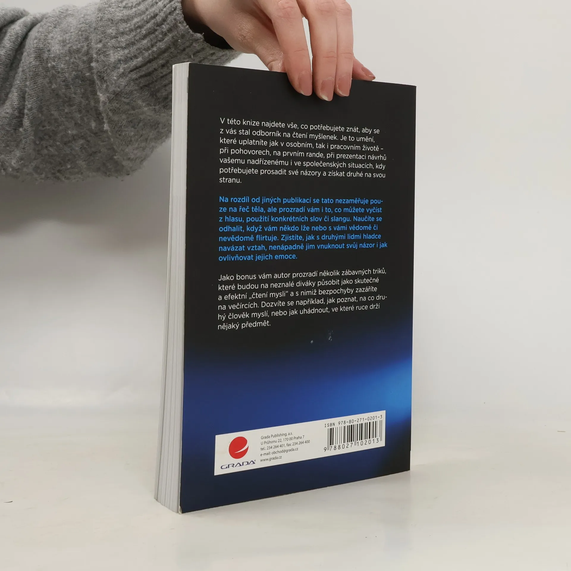 V této knize najdete vše, co potřebujete znát, aby se z vás stal odborník na čtení myšlenek. Je to umění, které uplatníte jak v osobním, tak i pracovním životě – při pohovorech, na prvním rande, při prezentaci návrhů vašemu nadřízenému i ve společenských situacích, kdy potřebujete prosadit své názory a získat druhé na svou stranu. Na rozdíl od jiných publikací se tato nezaměřuje pouze na řeč těla, ale prozradí vám i to, co můžete vyčíst z hlasu, použití konkrétních slov či slangu. Naučíte se odhalit, když vám někdo lže nebo s vámi vědomě či nevědomě flirtuje. Zjistíte, jak s druhými lidmi hladce navázat vztah, nenápadně jim vnuknout svůj názor i jak ovlivňovat jejich emoce. Jako bonus vám autor prozradí několik zábavných triků, které budou na neznalé diváky působit jako skutečné a efektní „čtení mysli“ a s nimiž bezpochyby zazáříte na večírcích. Dozvíte se například, jak poznat, na co druhý člověk myslí, nebo jak uhádnout, ve které ruce drží nějaký předmět.