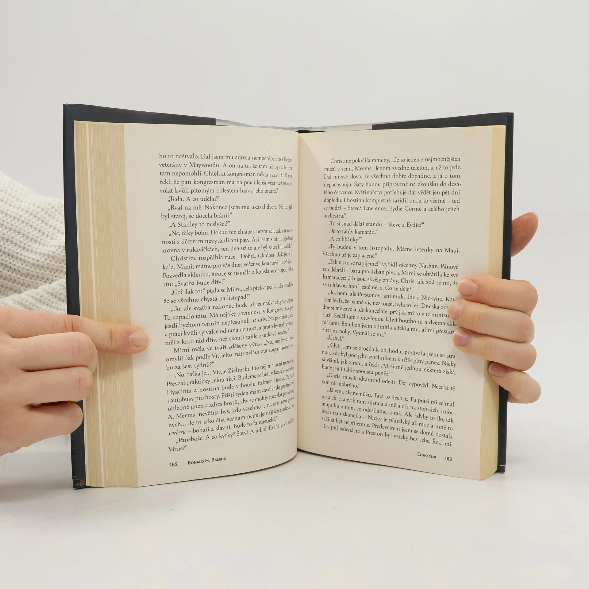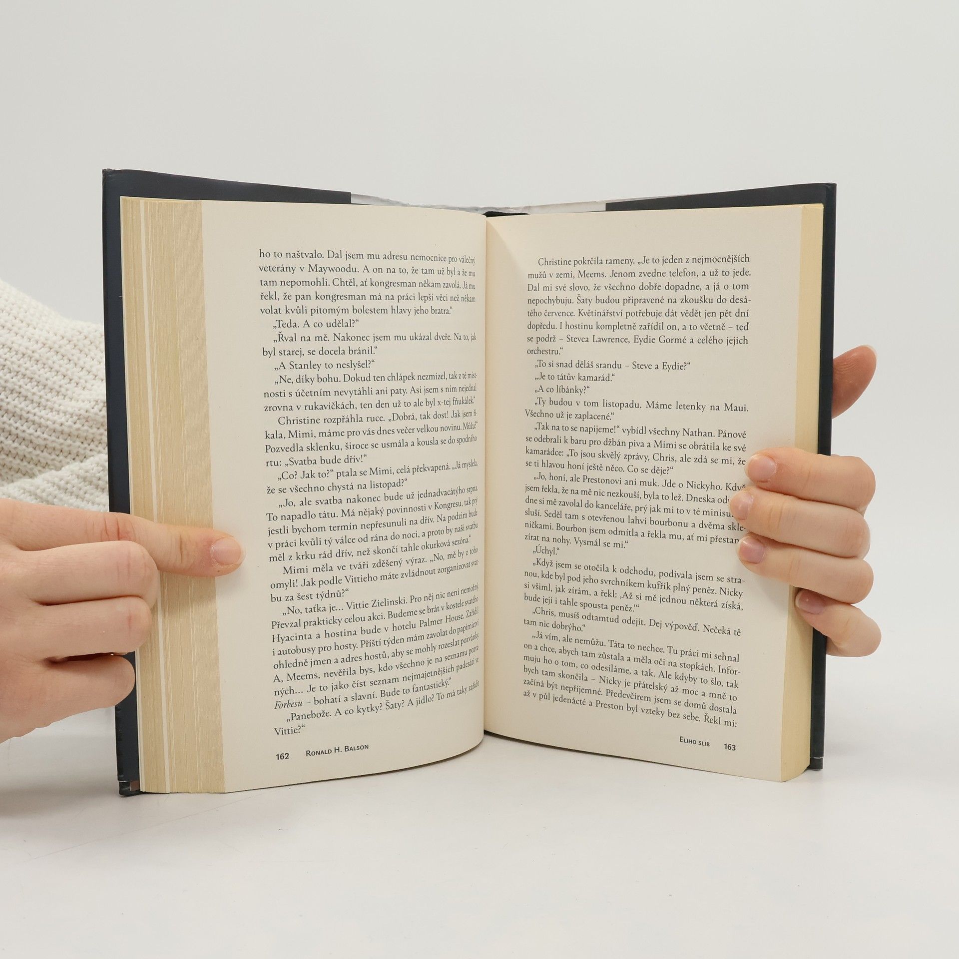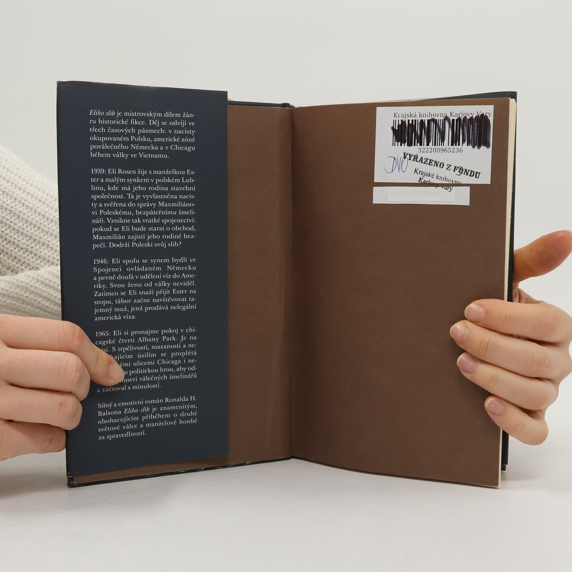 Eliho slib je mistrným dílem historické fikce, jehož děj se odvíjí ve třech časových pásmech: v nacisty okupovaném Polsku, americké zóně poválečného Německa a v Chicagu během války ve Vietnamu. Ronald H. Balson, nositel Národní židovské knižní ceny za literaturu, v knize zkoumá cenu války, ambivalentní hodnotu přežití a nezlomitelnou sílu rodinných pout. 1939: Eli Rosen žije se svou ženou Ester a jejich malým synkem v polském Lublinu, kde má jeho rodina stavební společnost. Ta je vyvlastněna nacisty a svěřena do správy Maxmiliánovi Poleskému, bezpáteřnímu šmelináři. Vznikne tak vratké spojenectví: pokud se Eli bude starat o obchod, Maxmilián zajistí jeho rodině bezpečí. Dostane Poleski svému slibu, nebo jejich vztah skončí zradou a tragédií? 1946: Eli spolu se synem bydlí ve Spojenci ovládaném Německu a pevně doufá v udělení víz do Ameriky. Svou ženu od války neviděl. Po táboře se potuluje muž, jenž prodává nelegální americká víza – nezná její osud třeba on? 1965: Eli si pronajme pokoj v chicagské čtvrti Albany Park. Je na misi. S trpělivostí, mazaností a neutuchajícím úsilím se proplétá neznámými ulicemi Chicaga i nebezpečnou politickou hrou a pátrá přitom po pravdě o Esteřině zmizení, jež mu poslední čtvrt století zůstává záhadou. Silný a emotivní román Ronalda H. Balsona Eliho slib je znamenitým, obohacujícím příběhem o druhé světové válce a manželově honbě za spravedlností.