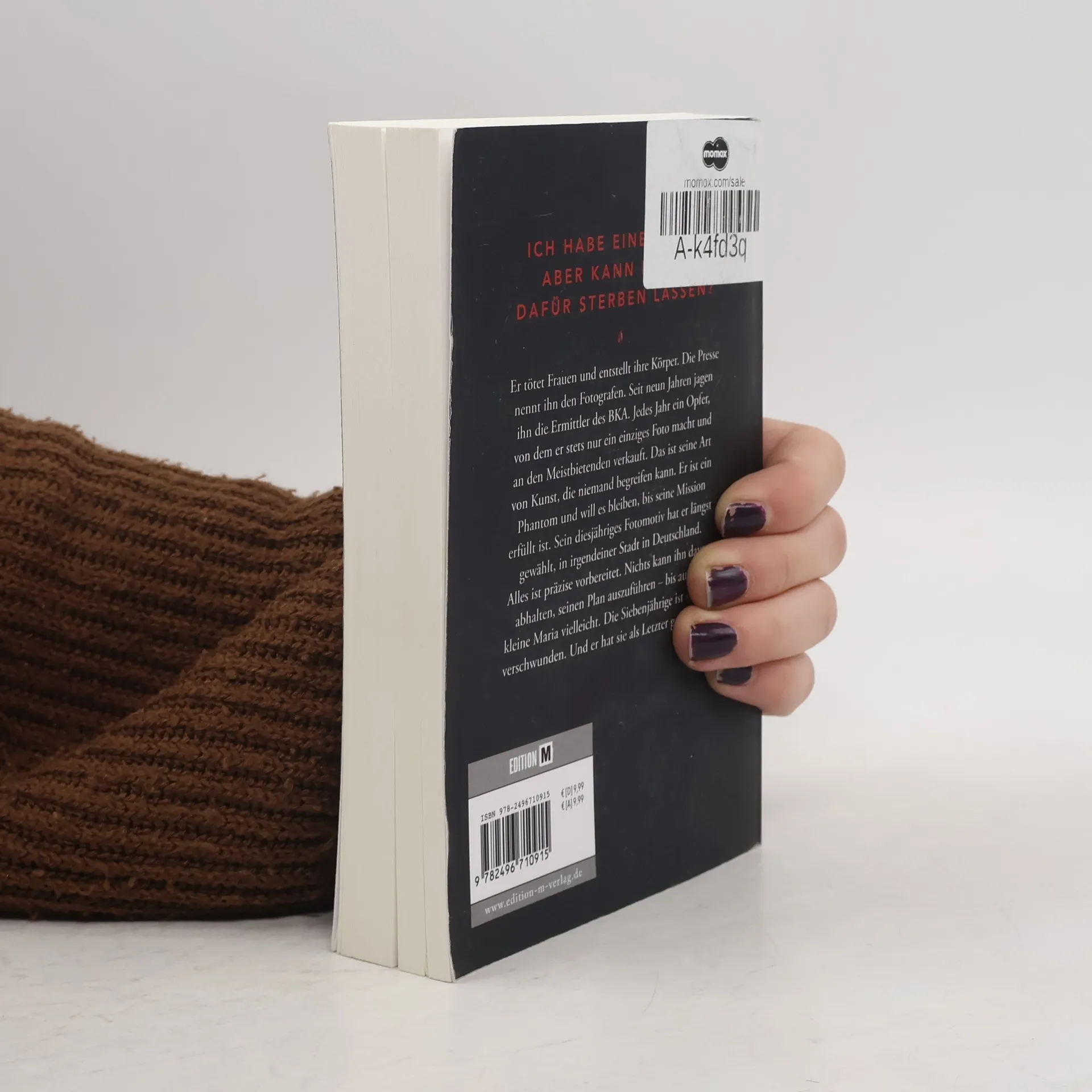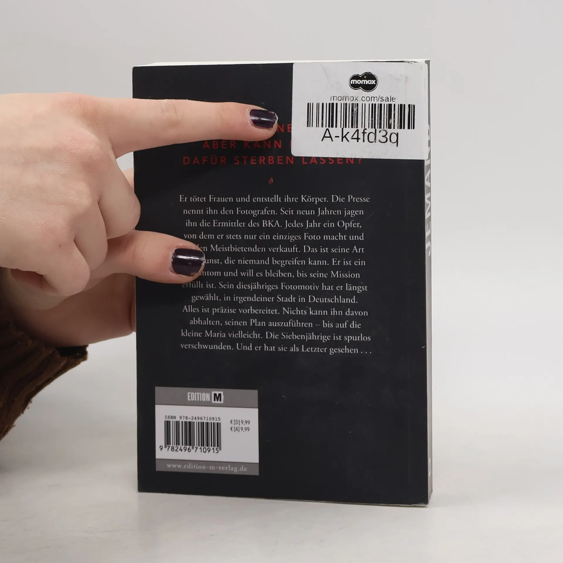 Der neue Thriller von Bestsellerautor Elias Haller handelt von einem Serienkiller, der Frauen tötet und ihre Körper entstellt, um Fotos zu verkaufen. Nach neun Jahren Jagd durch das BKA plant er sein nächstes Opfer, bis die siebenjährige Maria verschwindet und er sie als Letzten gesehen hat.