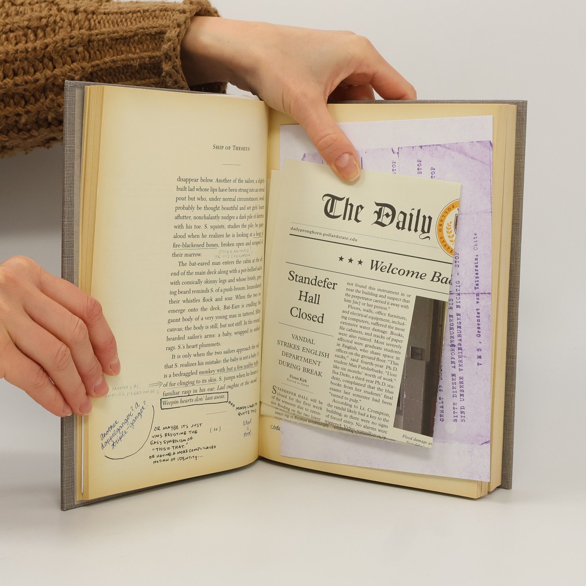 A young woman picks up a book left behind by a stranger. Inside it are his margin notes, which reveal a reader entranced by the story and by its mysterious author. She responds with notes of her own, leaving the book for the stranger, and so begins an unlikely conversation that plunges them both into the unknown. The book: Ship of Theseus, the final novel by a prolific but enigmatic writer named V.M. Straka, in which a man with no past is shanghaied onto a strange ship with a monstrous crew and launched onto a disorienting and perilous journey. The writer: Straka, the incendiary and secretive subject of one of the world's greatest mysteries, a revolutionary about whom the world knows nothing apart from the words he wrote and the rumors that swirl around him. The readers: Jennifer and Eric, a college senior and a disgraced grad student, both facing crucial decisions about who they are, who they might become, and how much they're willing to trust another person with their passions, hurts, and fears. S. ... is the chronicle of two readers finding each other in the margins of a book and enmeshing themselves in a deadly struggle between forces they don't understand, and it is also Abrams and Dorst's love letter to the written word