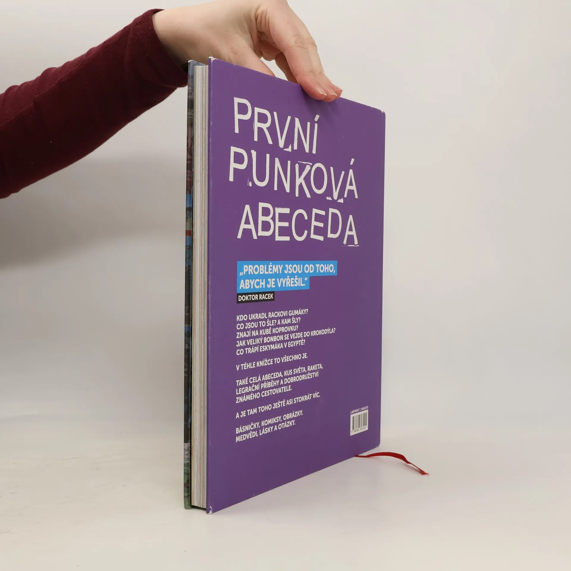 První punková abeceda Doktor Racek sedá do rakety a vydává se na cestu kolem zeměkoule. Navštěvuje různé kouty světa a děti se při tom učí písmena. Kniha jako gejzír nápadů vedle hravé formy obsahuje i vzdělávací prvky. Básničky, komiksy, koláže, krátké pohádky, hry, otázky a úkoly. Pro všechny děti a jejich skvělé rodiče. Nikdo se nebude ani vteřinu nudit! Kdo ukradl Rackovi gumáky? Co jsou šle? A kam šly? Znají na Kubě koprovku? Jak veliký bonbon se vejde do krokodýla? Co trápí Eskymáka v Egyptě? V téhle knížce je všechno – celá abeceda, kus světa, raketa, legrační příběhy a dobrodružství známého cestovatele.