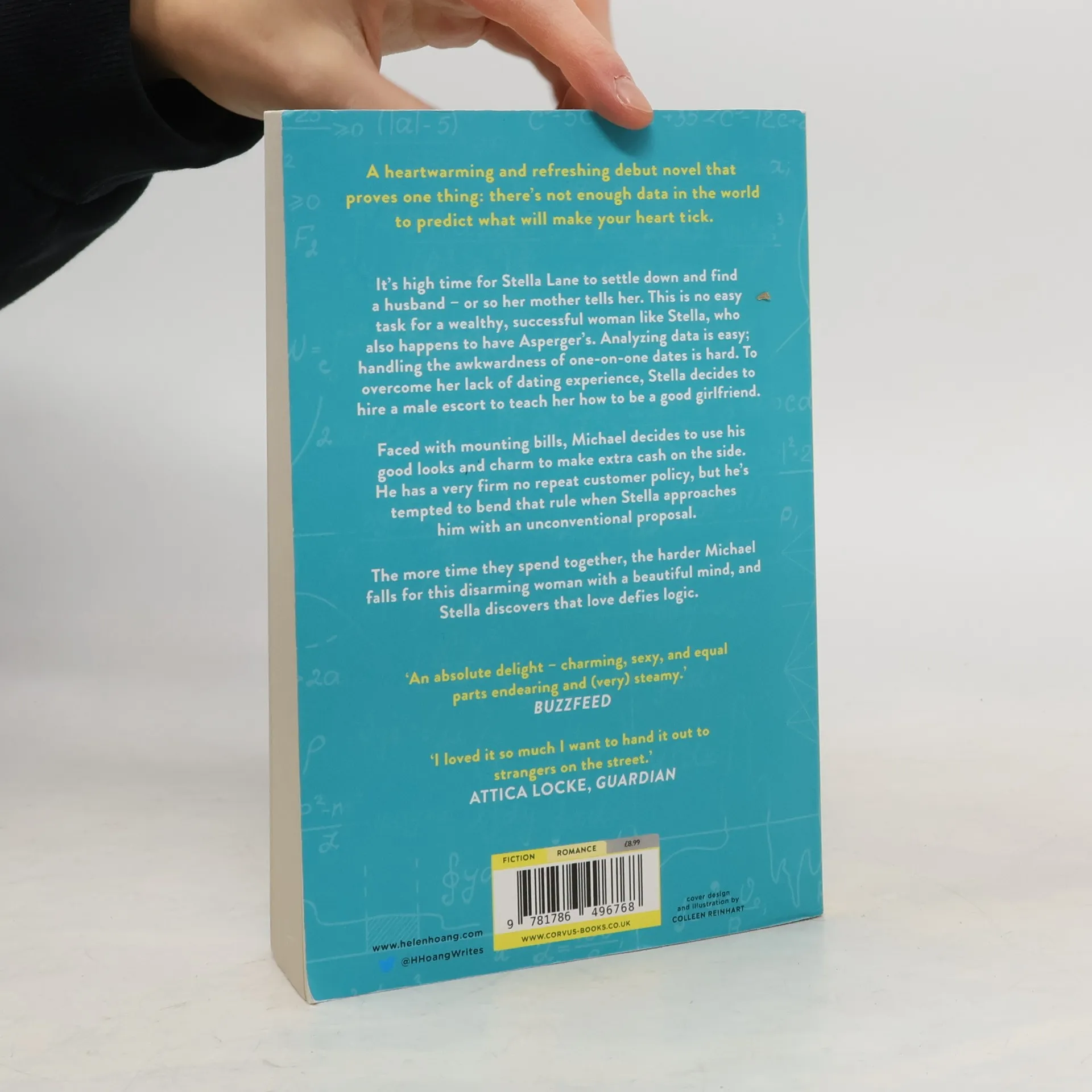 Goodread's Romance Book of the Year, 2018 A Washington Post Book of the Year, 2018 An AmazonBook of the Year, 2018 Cosmopolitan's 33 Books to Get Excited About in 2018 Elle Best Summer Reads 2018 __________ A heartwarming and refreshing debut novel that proves one thing: there's not enough data in the world to predict what will make your heart tick. It's high time for Stella Lane to settle down and find a husband - or so her mother tells her. This is no easy task for a wealthy, successful woman like Stella, who also happens to have Asperger's. Analyzing data is easy; handling the awkwardness of one-on-one dates is hard. To overcome her lack of dating experience, Stella decides to hire a male escort to teach her how to be a good girlfriend. Faced with mounting bills, Michael decides to use his good looks and charm to make extra cash on the side. He has a very firm no repeat customer policy, but he's tempted to bend that rule when Stella approaches him with an unconventional proposal. The more time they spend together, the harder Michael falls for this disarming woman with a beautiful mind, and Stella discovers that love defies logic. Heart-tugging, sexy and utterly joyful - The Kiss Quotient is a book for anyone who has been in love, or in lust...