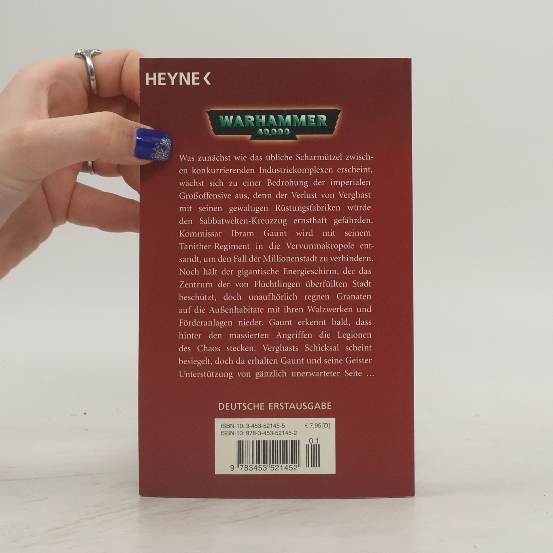 Dan Abnett ist der Superstar von „Warhammer 40.000“, des bekanntesten und faszinierendsten Science-Fiction-Rollenspiels! Angesiedelt in einer archaischen Zukunftswelt, in der sich die Menschheit in der Galaxis ausgebreitet hat und nun einer dunklen Macht gegenübersteht, haben diese Romane inzwischen auch in Deutschland eine riesige Fangemeinde. Was zunächst wie das übliche Scharmützel zwischen konkurrierenden Industriekomplexen erscheint, wächst sich zu einer Bedrohung der imperialen Großoffensive aus, denn der Verlust von Verghast mit seinen gewaltigen Rüstungsfabriken würde den Sabbatwelten-Kreuzzug ernsthaft gefährden. Kommissar Ibram Gaunt wird mit seinem Tanither-Regiment in die Vervunmakropole entsandt, um den Fall der Millionenstadt zu verhindern. Noch hält der gigantische Energieschirm, der das Zentrum der von Flüchtlingen überfüllten Stadt beschützt, doch unaufhörlich regnen Granaten auf die Außenhabitate mit ihren Walzwerken und Förderanlagen nieder. Gaunt erkennt bald, dass hinter den massierten Angriffen die Legionen des Chaos stecken. Verghasts Schicksal scheint besiegelt, doch da erhalten Gaunt und seine Geister Unterstützung von gänzlich unerwarteter Seite.