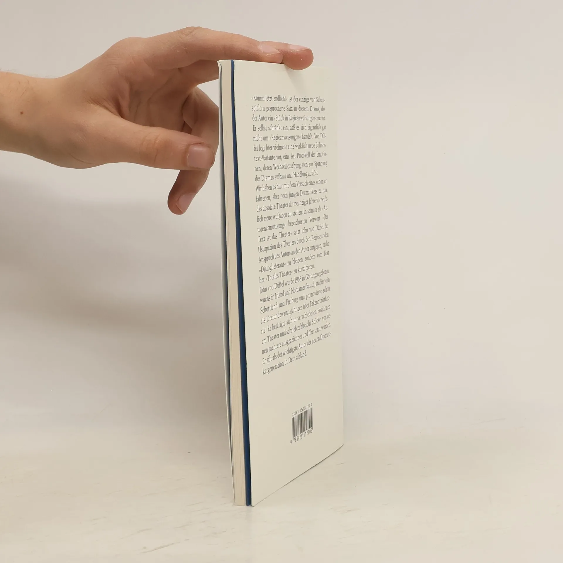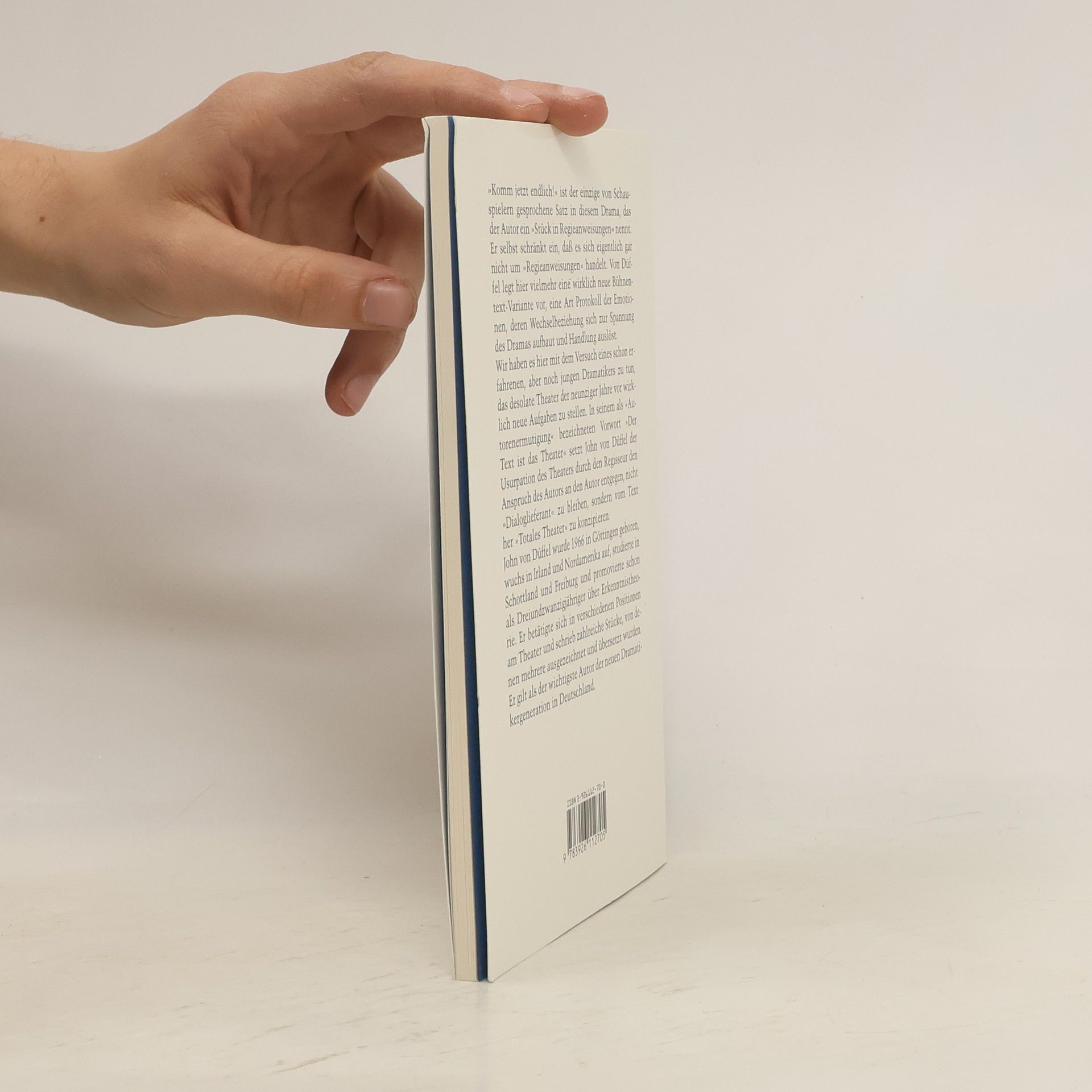 "Komm jetzt endlich!" ist der einzige von einem Schauspieler gesprochene Satz in diesem Stück. Mit dieser radikal ungewohnten Bühnenvorlage hat der Autor nichts Geringeres im Sinn, als das desolate, abgenutzte Gegenwartstheater vor eine Herausforderung zu stellen, die zum Verlassen der eingefahrenen Spuren zwingt: Er legt eine Art Protokoll von Emotionen vor, deren Wechselbeziehung sich zur Spannung des Dramas aufbaut und Handlung auslöst. Düffel gilt als einer der wichtigsten Autoren der neuen Dramatikergeneration in Deutschland.