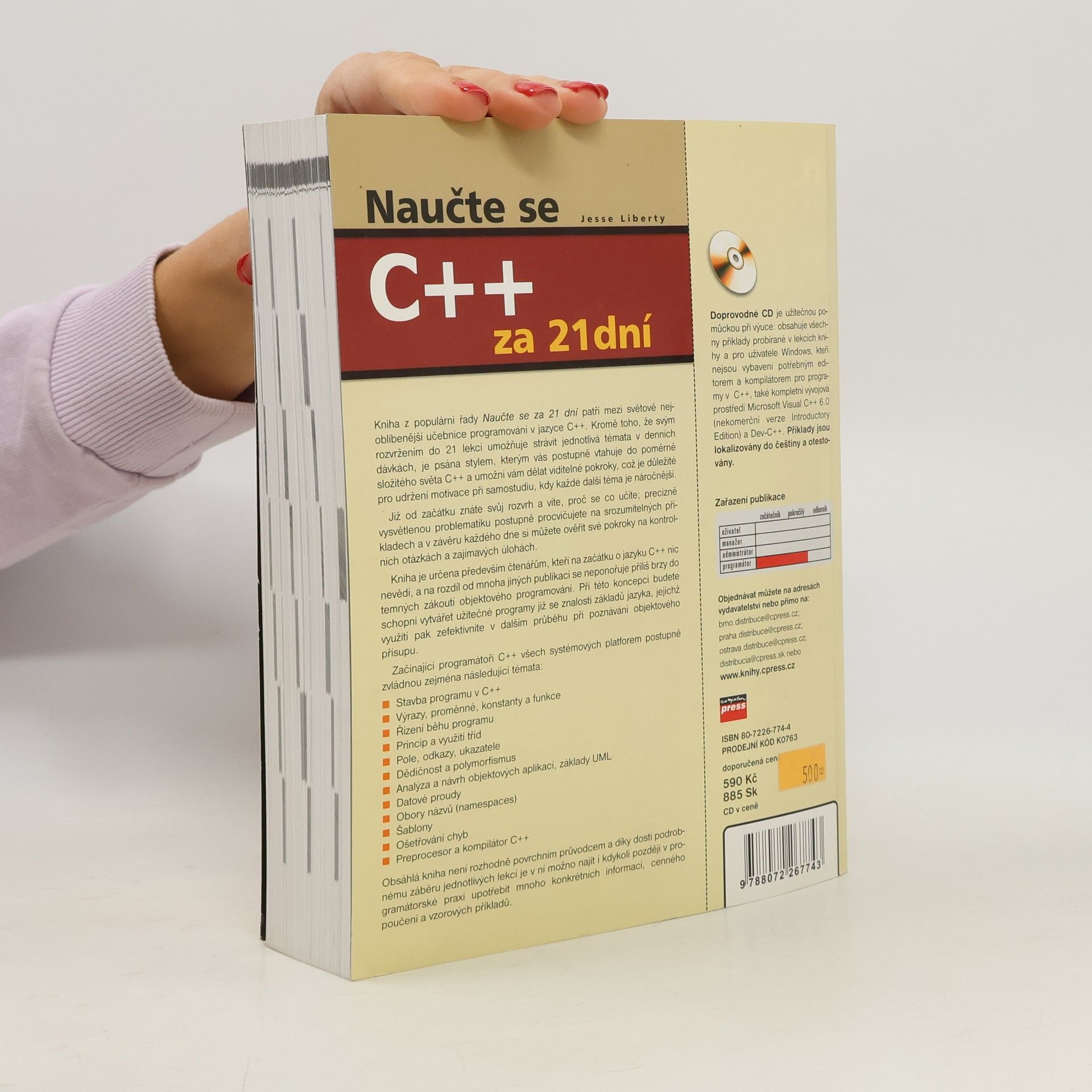 Programovacích jazyků existuje celá řada, ale je jen jeden jazyk, z něhož mnoho ostatních vychází a jehož znalost vám umožní nejen naprogramovat prakticky libovolnou aplikaci, ale také snadno přejít k jakémukoliv jinému programovacímu jazyku. Kniha z populární řady "Naučte se za 21 dní" patří mezi světově nejoblíbenější učebnice programování v jazyce C++. Kromě toho, že svým rozvržením do 21 lekcí umožňuje strávit jednotlivá témata v denních dávkách, je psána stylem, kterým vás postupně vtahuje do poměrně složitého světa C++ a umožní vám dělat viditelné pokroky, což je důležité pro udržení motivace při samostudiu, kdy každé další téma je navíc náročnější. Již od začátku znáte svůj rozvrh a víte, proč se co učíte; precizně vysvětlenou problematiku postupně procvičujete na srozumitelných příkladech a v závěru každého dne si můžete ověřit své pokroky na kontrolních otázkách a zajímavých úlohách. Programátoři C++ všech systémových platforem zvládnou zejména následující témata: * Stavba programu v C++ * Výrazy, proměnné, konstanty a funkce * Řízení běhu programu * Princip a užití tříd * Pole, odkazy, ukazatele * Dědičnost a polymorfismus * Analýza a návrh objektových aplikací, základy jazyka UML * Datové proudy * Obory názvů (namespaces) * Šablony * Ošetřování chyb * Preprocesor a kompilátor C++