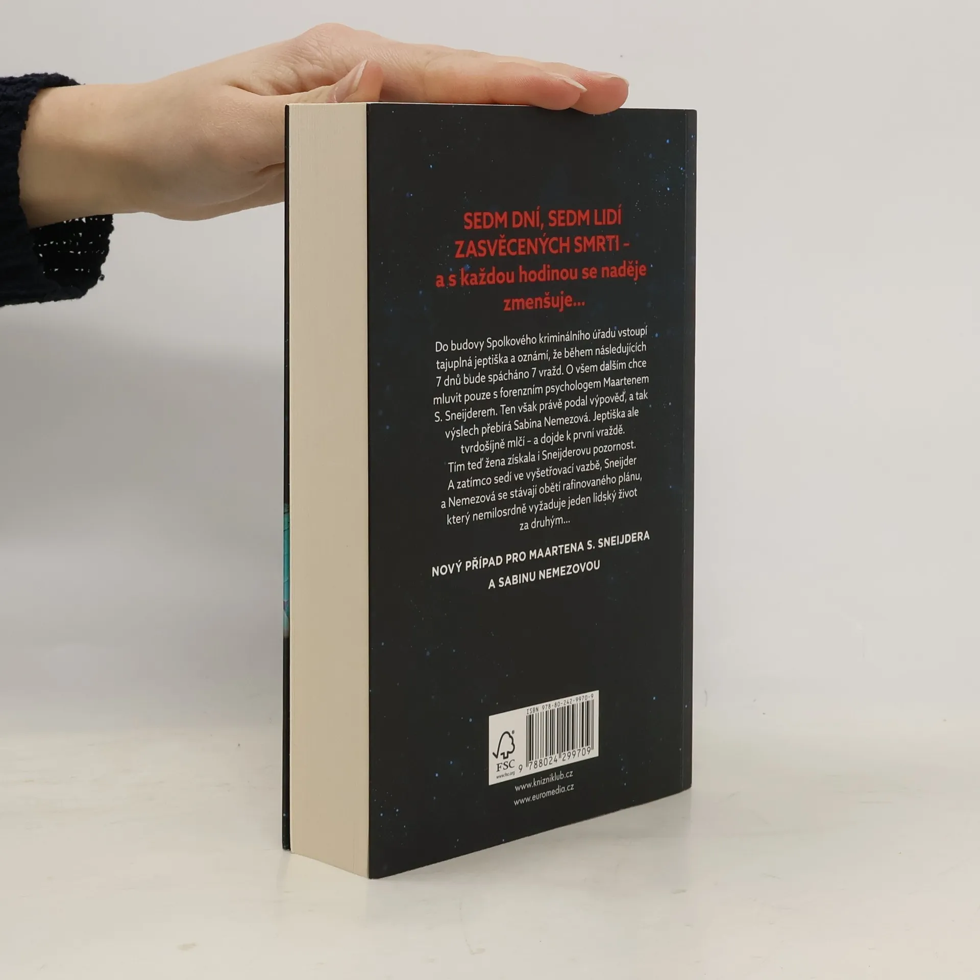 SEDM DNÍ, SEDM LIDÍ ZASVĚCENÝCH SMRTI – a s každou hodinou se naděje zmenšuje… Do budovy Spolkového kriminálního úřadu vstoupí tajuplná jeptiška a oznámí, že během následujících 7 dnů bude spácháno 7 vražd. O všem dalším chce mluvit pouze s forenzním psychologem Maartenem S. Sneijderem. Ten však právě podal výpověď, a tak výslech přebírá Sabina Nemezová. Jeptiška ale tvrdošíjně mlčí – a dojde k první vraždě. Tím žena získala i Sneijderovu pozornost. A zatímco sedí ve vyšetřovací vazbě, Sneijder a Nemezová se stávají obětí rafinovaného plánu, který nemilosrdně vyžaduje jeden lidský život za druhým…