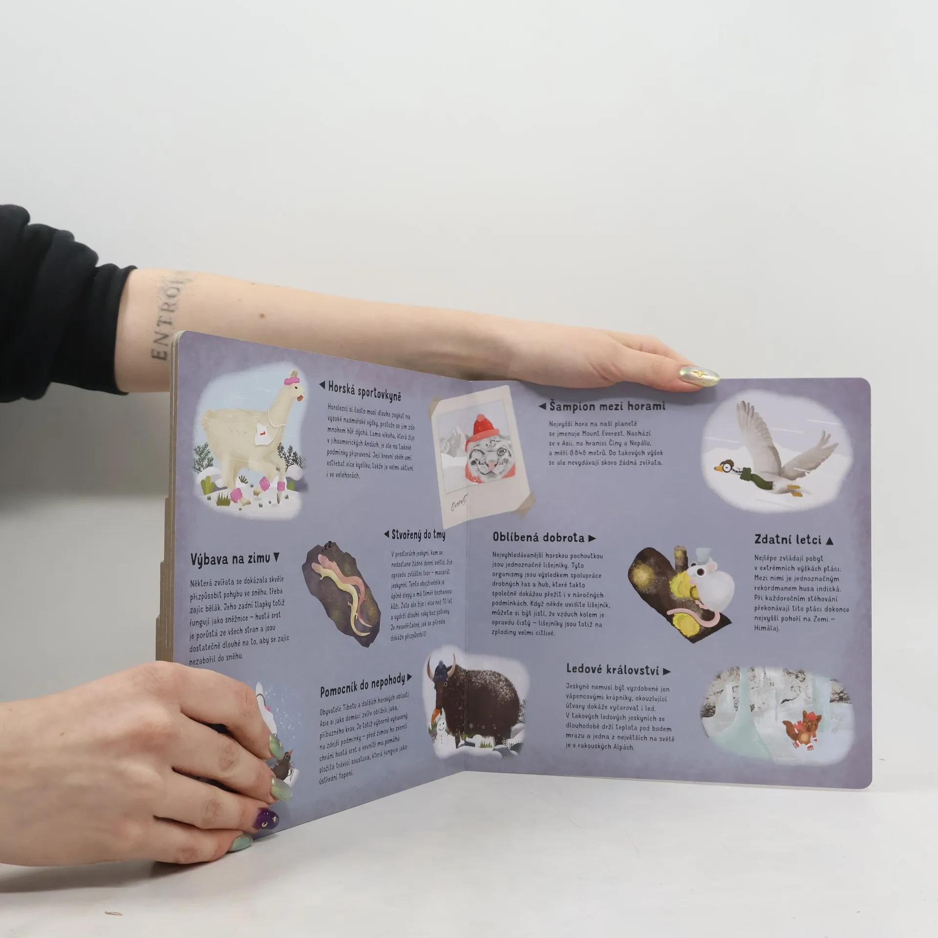 Prozkoumej hory od údolí až po skalnaté vrcholky! Hravá knížka o životě v horských oblastech. Medvěd se snaží ulovit mrštného lososa v horské říčce, svišti hledají zásoby i pod zbytky sněhu a z výšky to vše pozorně sleduje orel skalní… Kdo další je na horách jako doma? Nazuj pořádné boty a vydej se na průzkum všech horských pater! V leporelu na tebe čeká také spousta nor a dutin, které můžeš procházet neustále tam i zpět.