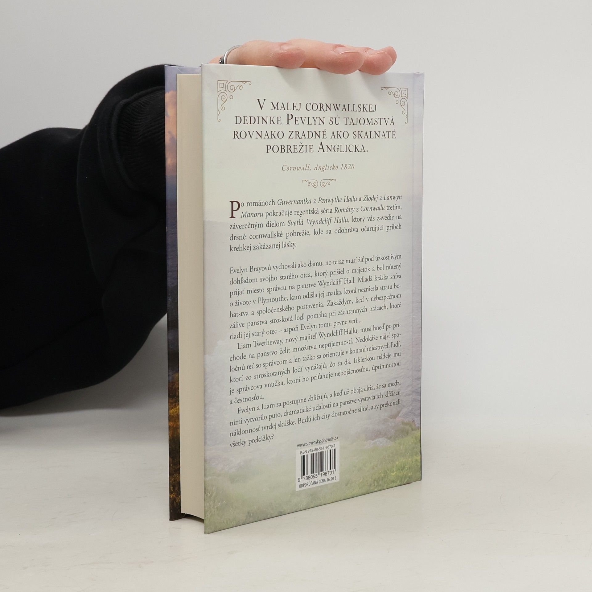 V malej cornwallskej dedinke Pevlyn sú tajomstvá rovnako zradné ako skalnaté pobrežie. Cornwall, Anglicko 1820. Po románoch Guvernantka z Penwythe Hallu a Zlodej z Lanwyn Manoru pokračuje regentská séria Romány z Cornwallu tretím, záverečným dielom, ktorý vás zavedie na drsné cornwallské pobrežie, kde sa odohráva očarujúci príbeh krehkej zakázanej lásky. Evelyn Brayovú vychovali ako dámu, no teraz žije pod dohľadom svojho starého otca, ktorý prišiel o majetok a stal sa správcom Wyndcliff Hallu. Mladá kráska sníva o živote v Plymouthe, kam odišla jej matka po strate bohatstva. Zakaždým, keď v nebezpečnom zálive stroskotá loď, pomáha pri záchranných prácach, ktoré riadi jej starý otec. Mladý šľachtic Liam Twetheway, nový majiteľ Wyndcliff Hallu, čelí množstvu nepríjemností. Nedokáže sa dohodnúť so správcom a ťažko sa orientuje v miestnych praktikách. Iskierkou nádeje mu je správcova vnučka, ktorá ho priťahuje svojou nebojácnosťou a úprimnosťou. Evelyn a Liam sa postupne zbližujú, no dramatické udalosti na panstve ich klíčiacu náklonnosť vystavia tvrdej skúške. Budú ich city dostatočne silné, aby prekonali všetky prekážky, ktoré im osud postavil do cesty?