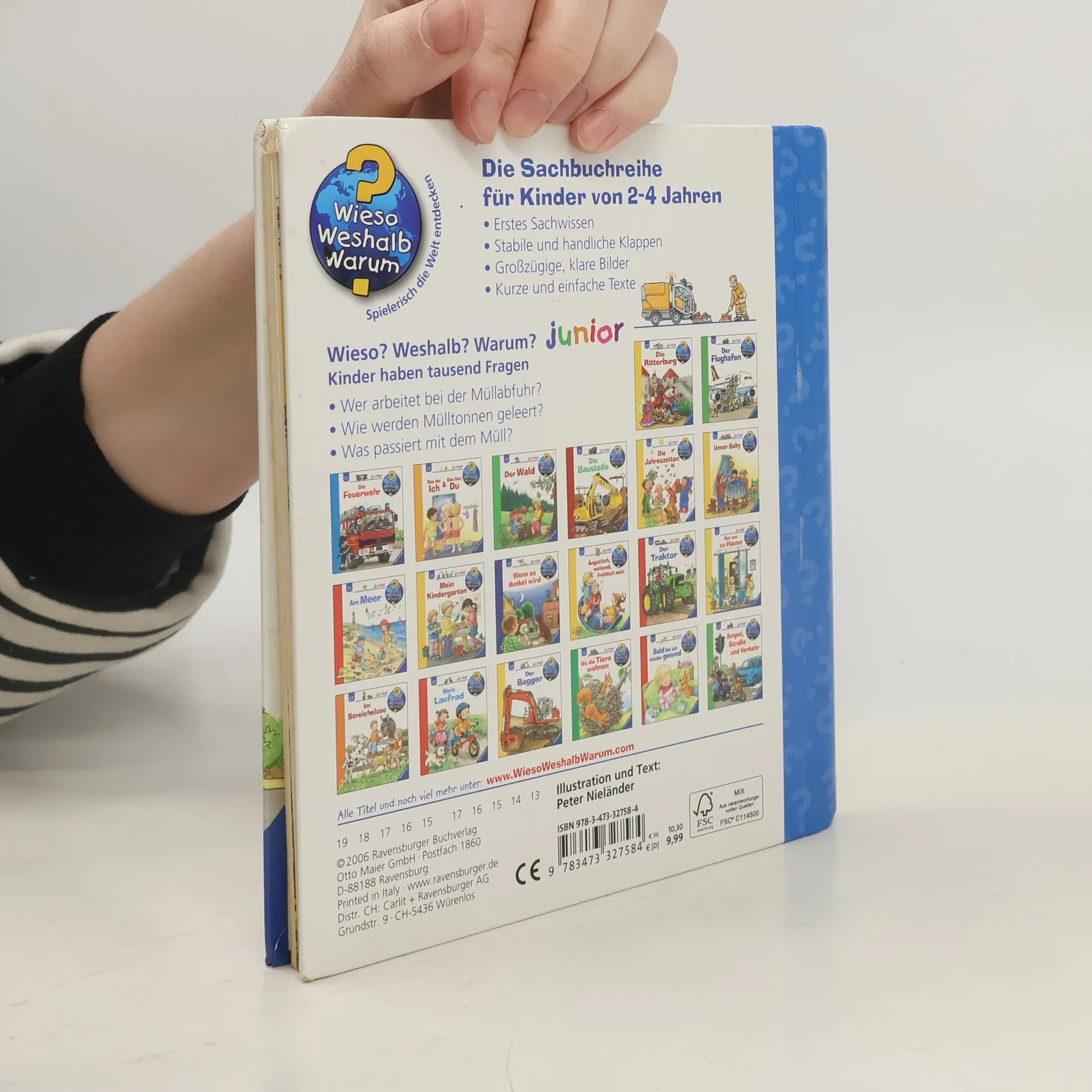 Wer arbeitet bei der Müllabfuhr? Welche Fahrzeuge reinigen die Straße? Wie werden Mülltonnen geleert? Und wohin kommt der Abfall danach? Mithilfe von Klappen und detailgenauen Bildern wird die Müllabfuhr und der Wertstoffhof für Kinder lebendig. Sie erfahren, welche Arten von Müll es gibt und wie man ihn vermeiden kann. Auch die Kleinsten können bereits einen Beitrag dazu leisten, Abfälle richtig zu trennen oder Müll sinnvoll zu verwerten. Die Sachbuchreihe für Kinder von 2-4 Jahren beantwortet die vielen Fragen, die Kinder täglich stellen. Themen wie die Feuerwehr, das Verhalten von Tieren im Winter oder die Notwendigkeit des Zähneputzens werden altersgerecht beleuchtet. Die Reihe ist speziell auf kleine Hände und die Bedürfnisse der Kleinsten abgestimmt. Klare, liebevolle Bilder, kurze Sachtexte und handliche Klappen, die Bewegungen veranschaulichen und überraschende Einblicke gewähren, ermöglichen es den Kindern, sich ihre Themen selbst zu erschließen. Der Spaß am eigenhändigen Entdecken, die liebevolle Umsetzung und die hochwertige Ausstattung garantieren langanhaltende Freude an jedem Buch.