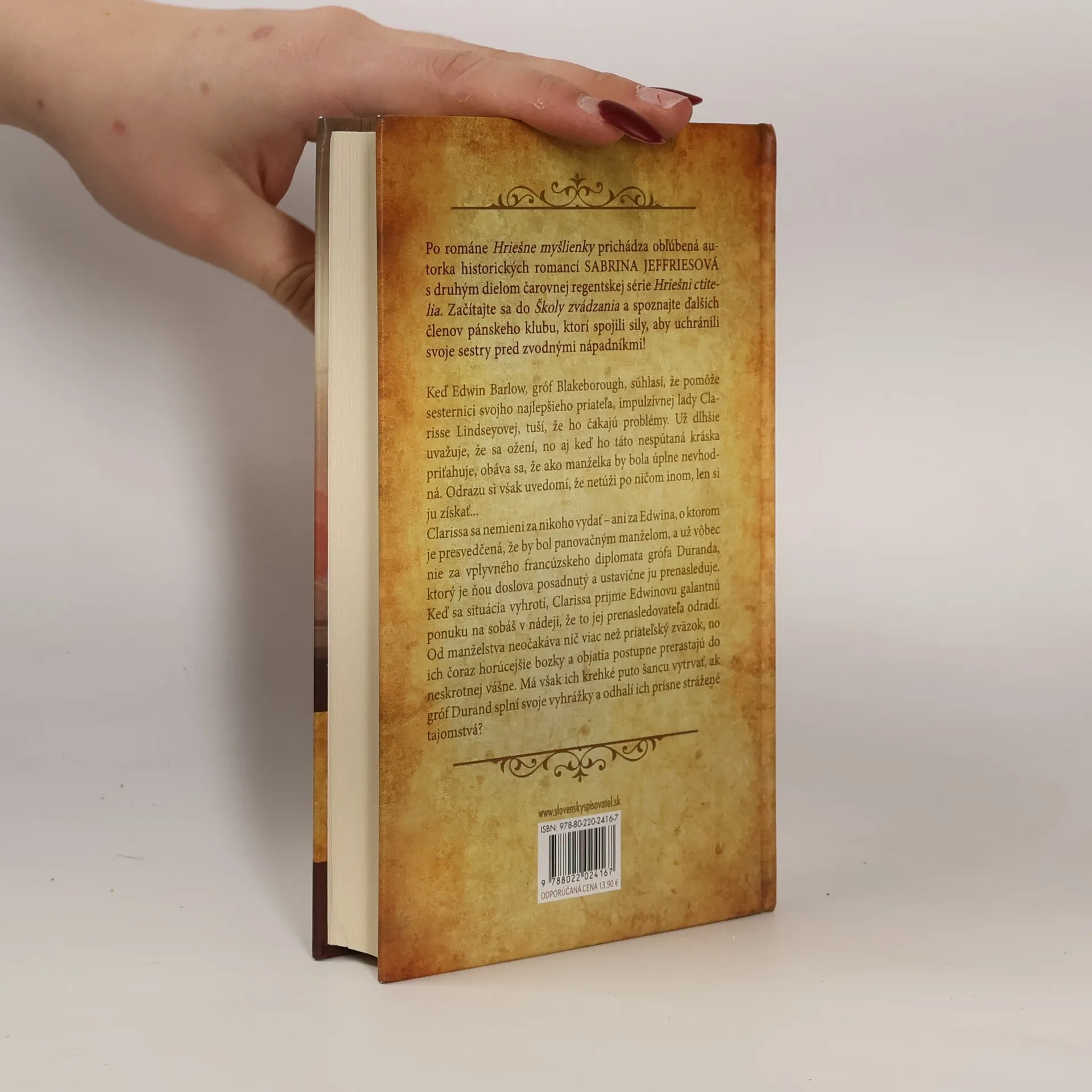 Po románe Hriešne myšlienky prichádza obľúbená autorka historických romancí Sabrina Jeffriesová s druhým dielom čarovnej regentskej série Hriešni ctitelia. Začítajte sa do Školy zvádzania a spoznajte ďalších členov pánskeho klubu, ktorí spojili sily, aby uchránili svoje sestry pred zvodnými nápadníkmi! Keď Edwin Barlow, gróf Blakeborough, súhlasí, že pomôže sesternici svojho najlepšieho priateľa, impulzívnej lady Clarisse Lindseyovej, tuší, že ho čakajú problémy. Už dlhšie uvažuje, že sa ožení, no aj keď ho táto nespútaná kráska priťahuje, obáva sa, že ako manželka by bola úplne nevhodná. Odrazu si však uvedomí, že netúži po ničom inom, len si ju získať... Clarissa sa nemieni za nikoho vydať – ani za Edwina, o ktorom je presvedčená, že by bol panovačným manželom, a už vôbec nie za vplyvného francúzskeho diplomata grófa Duranda, ktorý je ňou doslova posadnutý a ustavične ju prenasleduje. Keď sa situácia vyhrotí, Clarissa prijme Edwinovu galantnú ponuku na sobáš v nádeji, že to jej prenasledovateľa odradí. Od manželstva neočakáva nič viac než priateľský zväzok, no ich čoraz horúcejšie bozky a objatia postupne prerastajú do neskrotnej vášne. Má však ich krehké puto šancu vytrvať, ak gróf Durand splní svoje vyhrážky a odhalí ich prísne strážené tajomstvá?