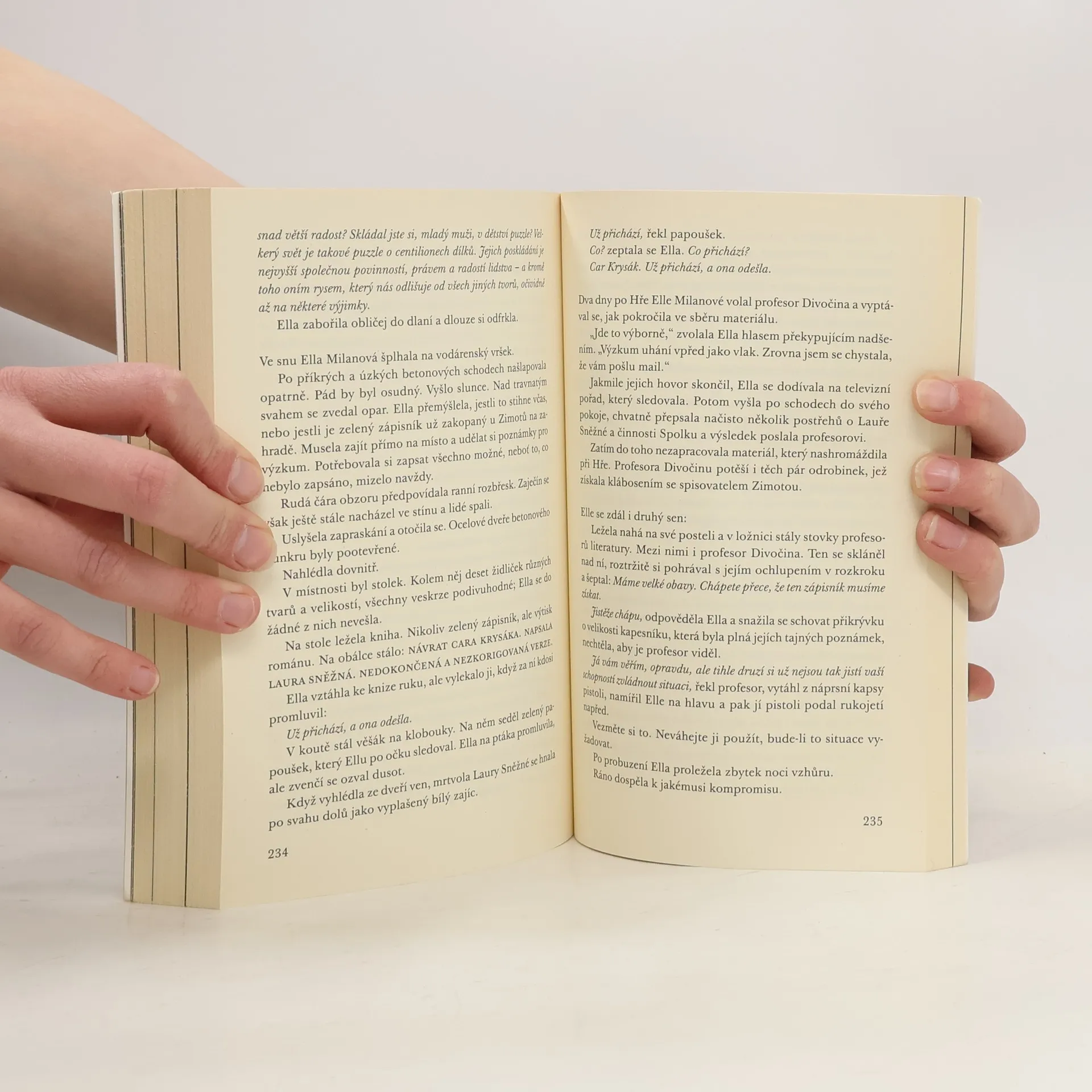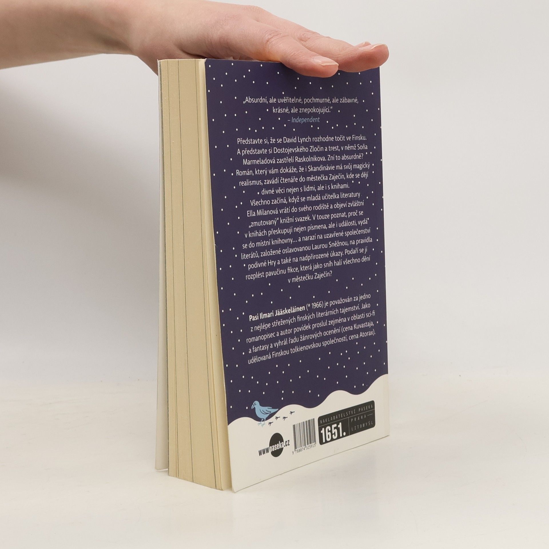 Představte si Lynchův Twin Peaks zasazený do Finska. A představte si Dostojevského Zločin a trest, v němž Soňa Marmeladová zastřelí Raskolnikova. Zní to absurdně? Román, který vám dokáže, že i Skandinávie má svůj magický realismus, zavádí čtenáře do městečka Zaječín, kde se dějí divné věci nejen s lidmi, ale i s knihami. Všechno začíná, když se mladá učitelka literatury Ella Milanová vrátí do svého rodiště a objeví tam zvláštní knižní svazek, který jí vyrazí dech. V místní knihovně se vydá po stopě záhadných událostí... a brzy narazí na uzavřené společenství literátů, založené oslavovanou Laurou Sněžnou, na pravidla podivné Hry a také na nadpřirozené úkazy. Podaří se jí odhalit, co se ve skutečnosti stalo s desátým členem literárního spolku, a rozplést pavučinu všeprostupující fikce?