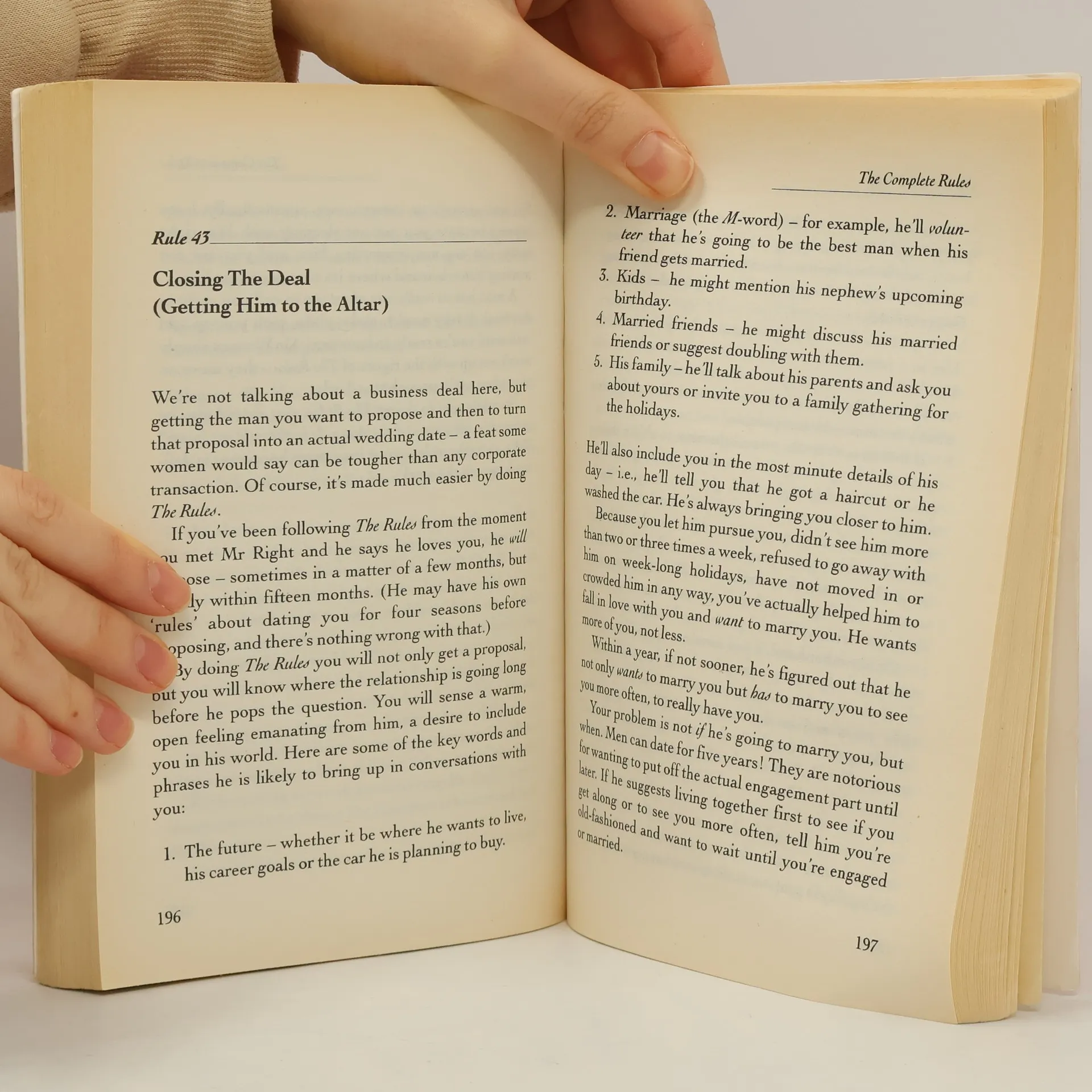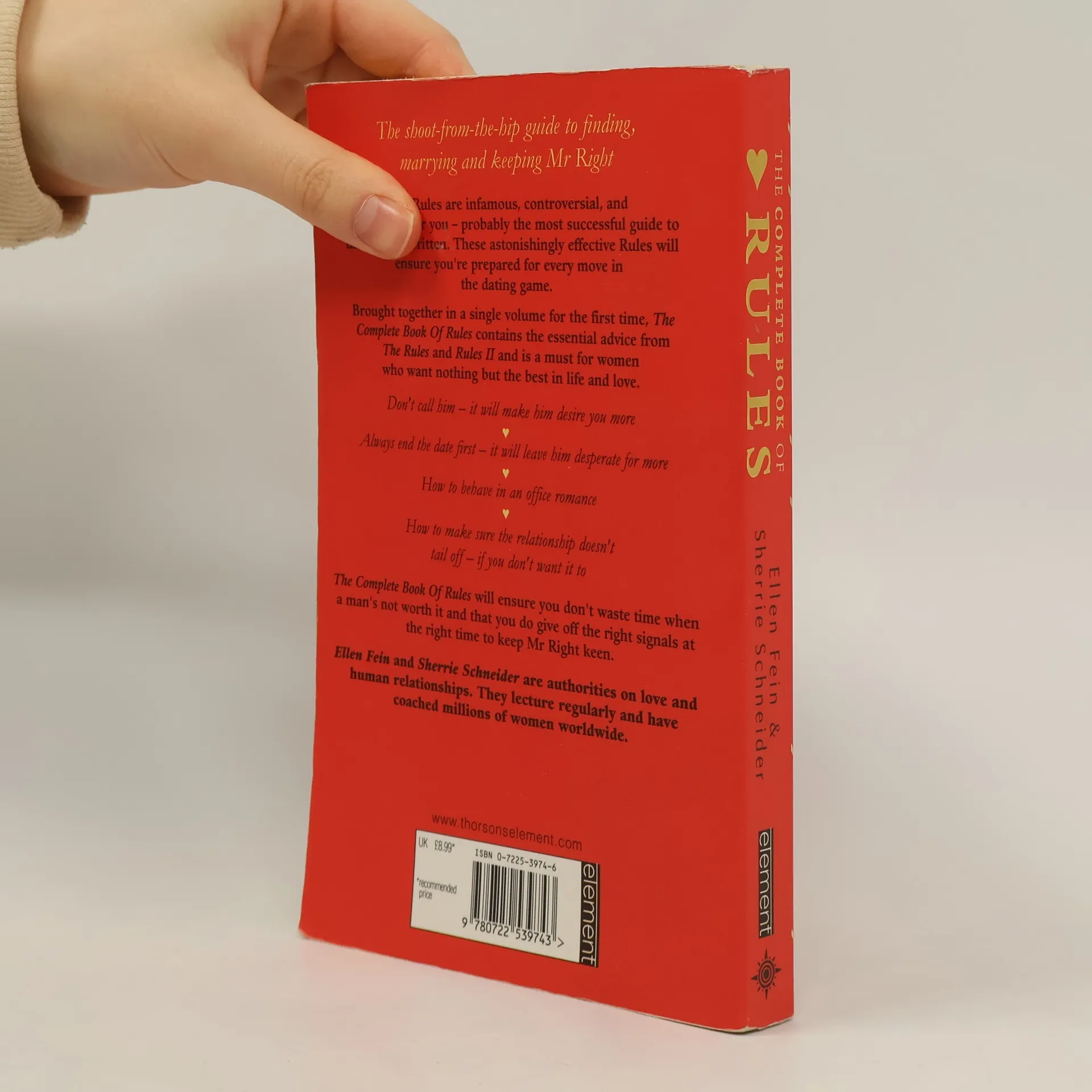 The very best advice from The Rules and The Rules 2 is brought together to provide the ultimate guide to successful dating.The notorious dating handbook comprises many tips such as "Never call a man first" (designed to make "Mr Right" hungry for more) which, although old-fashioned, has been found effective by millions of women worldwide. Other essential advice offered: always end the first date — it will leave him desperate for more; don't call him — it will make him desire you more; never accept a Saturday night date after Wednesday — it will encourage him to phone sooner; always end the telephone conversation first — it will leave him wanting more; don't rush into sex — let his passion build.