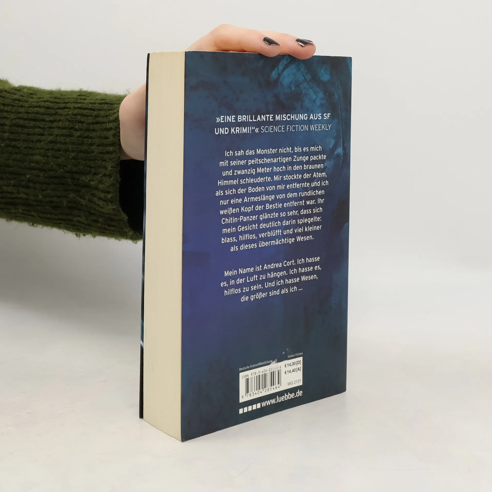 Andrea Cort wird von einem riesigen Monster mit seiner Zunge gepackt und in die Höhe geschleudert. Während sie in der Luft hängt, sieht sie ihr eigenes, hilfloses Spiegelbild im glänzenden Chitin-Panzer des Wesens. Sie empfindet Angst und Abneigung gegenüber der Übermacht und ihrer eigenen Hilflosigkeit.