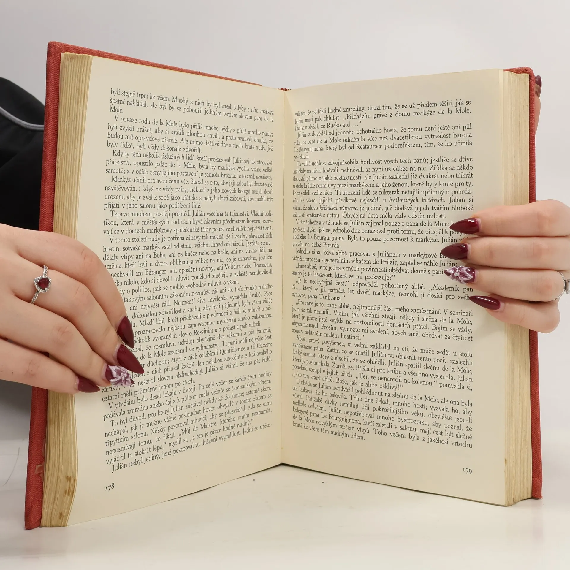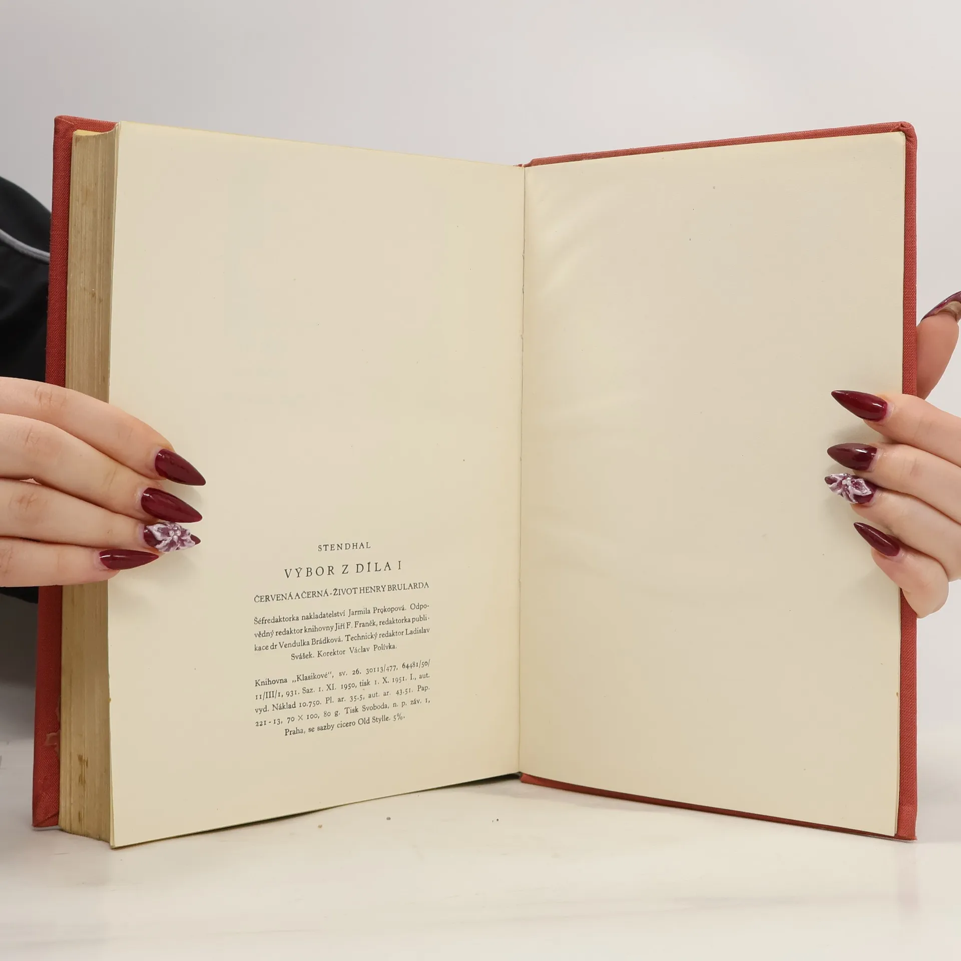 Obsáhlý výbor ze Stendhalova díla, které spolu s dílem Balzacovým je nejpřednějším projevem francouzského realismu za kapitalistické období, přináší v 1. svazku dvě práce; první z nich je v podstatných partiích založena na autobiografických prvcích, druhá pak je čistou autobiografií. Román "Červená a černá" (tj. barva napoleonské uniformy a barva kněžské sutany) je příběhem tesařského synka Juliána Sorela, který ve své potřebě vyšplhat se výše, ve své ctižádosti, přejímá od společnosti doby Restaurace metody cílevědomé přetvářky - ovšem marně; jeho rozlet, podporovaný láskou dvou žen, končí pod guillotinou. "Život Henry Brularda" je S. svéživotopis doby mladosti, psaný až r. 1835-36. Autor, usilující o absolutní upřímnost, nijak nepřikrašluje temné stránky svého charakteru ani své vnitřní rozpory a ve své přesnosti (ačkoliv to píše po nějakých 35-40 letech, ve své padesátce) doplňuje text vlastními kresbami a náčrty.
