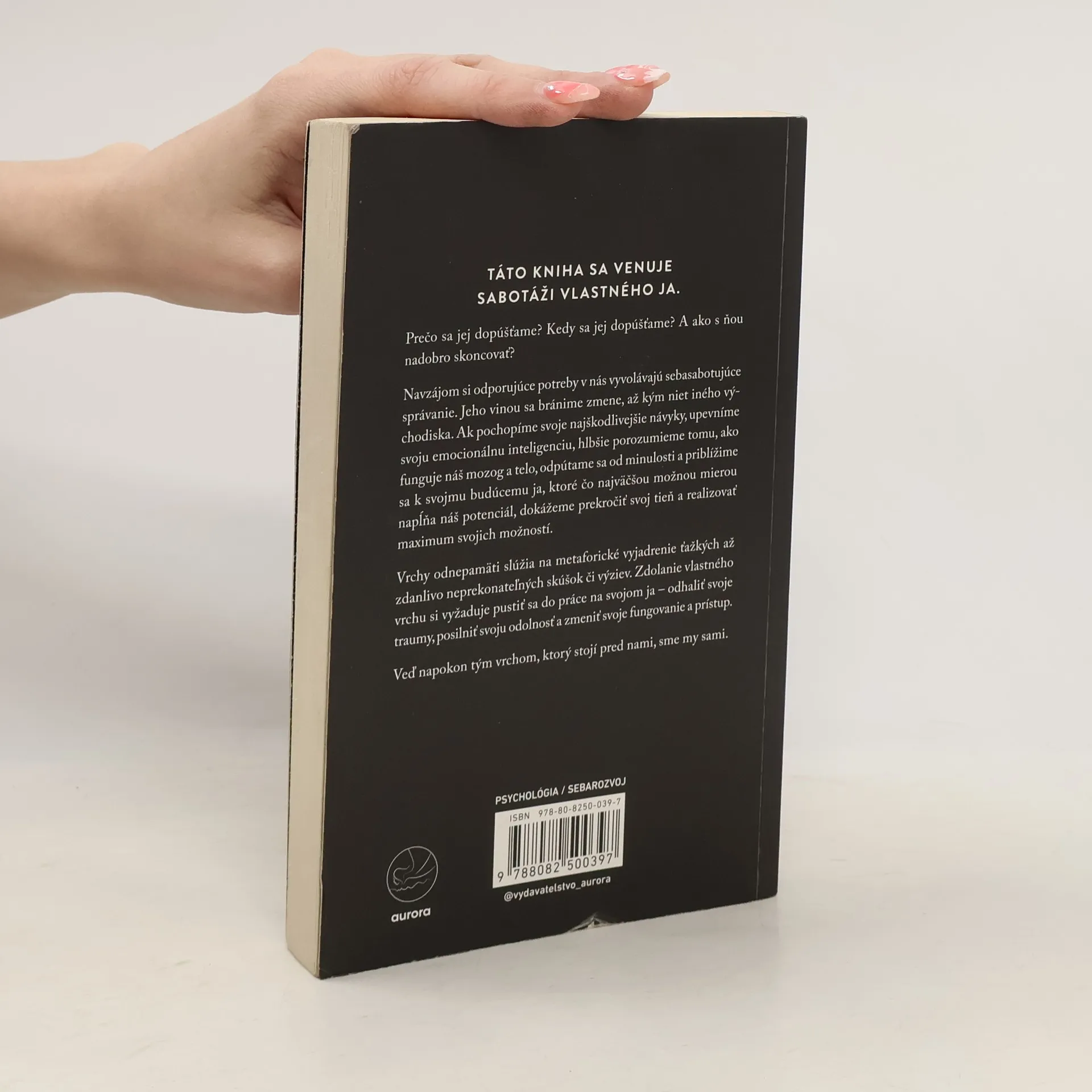 Prečo sa jej dopúšťame? Kedy sa jej dopúšťame? A ako s ňou nadobro skoncovať? Navzájom si odporujúce potreby v nás vyvolávajú sebasabotujúce správanie. Jeho vinou sa bránime zmene, až kým niet iného východiska. Ak pochopíme svoje najškodlivejšie návyky, upevníme svoju emocionálnu inteligenciu, hlbšie porozumieme tomu, ako funguje náš mozog a telo, odpútame sa od minulosti a priblížime sa k svojmu budúcemu ja, ktoré čo najväčšou možnou mierou napĺňa náš potenciál, dokážeme prekročiť svoj tieň a realizovať maximum svojich možností.Vrchy odnepamäti slúžia na metaforické vyjadrenie ťažkých až zdanlivo neprekonateľných skúšok či výziev. Zdolanie vlastného vrchu si vyžaduje pustiť sa do práce na svojom ja – odhaliť svoje traumy, posilniť svoju odolnosť a zmeniť svoje fungovanie a prístup. Veď napokon tým vrchom, ktorý stojí pred nami, sme my sami.