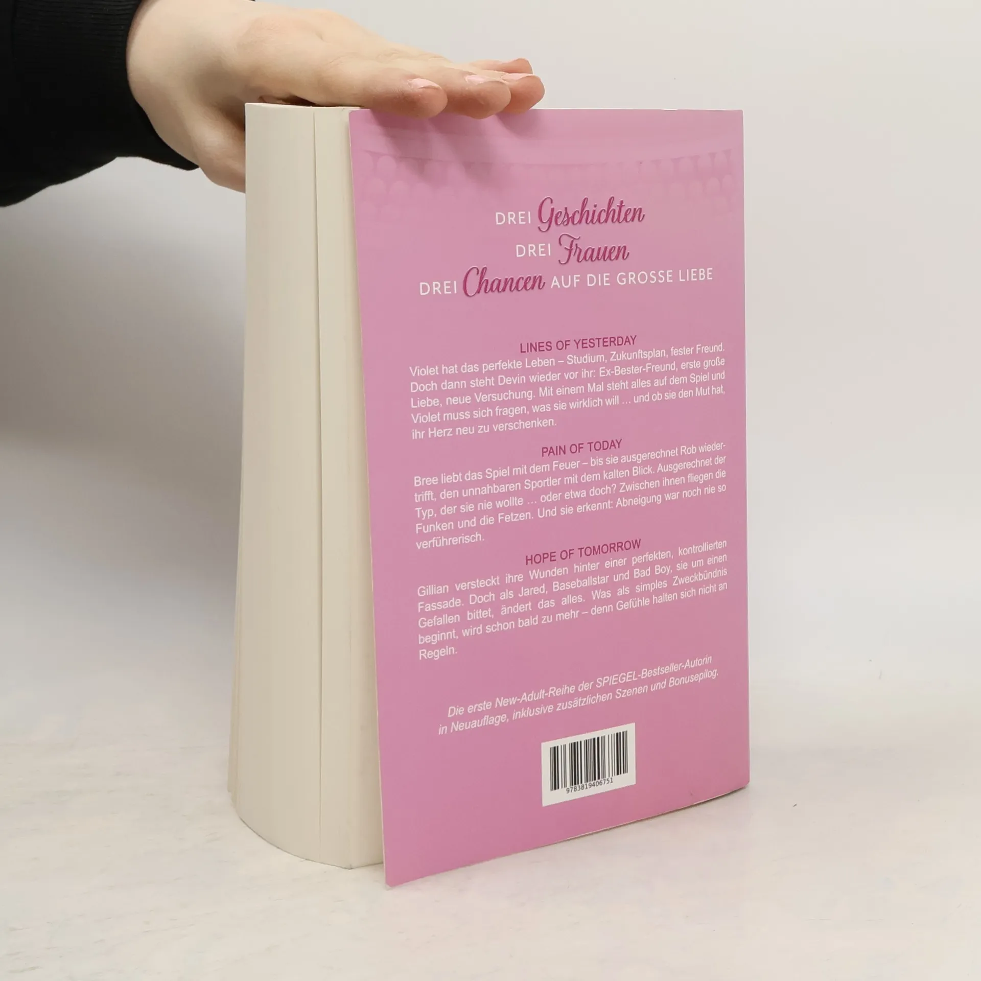 Drei Geschichten. Drei Frauen. Drei Chancen auf die große Liebe. Lines of Yesterday Violet hat das perfekte Leben – Studium, Zukunftsplan, fester Freund. Doch dann steht Devin wieder vor ihr: Ex-Bester-Freund, erste große Liebe, neue Versuchung. Mit einem Mal steht alles auf dem Spiel und Violet muss sich fragen, was sie wirklich will ... und ob sie den Mut hat, ihr Herz neu zu verschenken. Pain of Today Bree liebt das Spiel mit dem Feuer – bis sie ausgerechnet Rob wiedertrifft, den unnahbaren Sportler mit dem kalten Blick. Ausgerechnet der Typ, der sie nie wollte ... oder etwa doch? Zwischen ihnen fliegen die Funken und die Fetzen. Und sie erkennt: Abneigung war noch nie so verführerisch. Hope of Tomorrow Gillian versteckt ihre Wunden hinter einer perfekten, kontrollierten Fassade. Doch als Jared, Baseballstar und Bad Boy, sie um einen Gefallen bittet, ändert das alles. Was als simples Zweckbündnis beginnt, wird schon bald zu mehr – denn Gefühle halten sich nicht an Regeln. Die erste New-Adult-Reihe der SPIEGEL-Bestseller-Autorin in Neuauflage, inklusive zusätzlichen Szenen und Bonusepilog.
