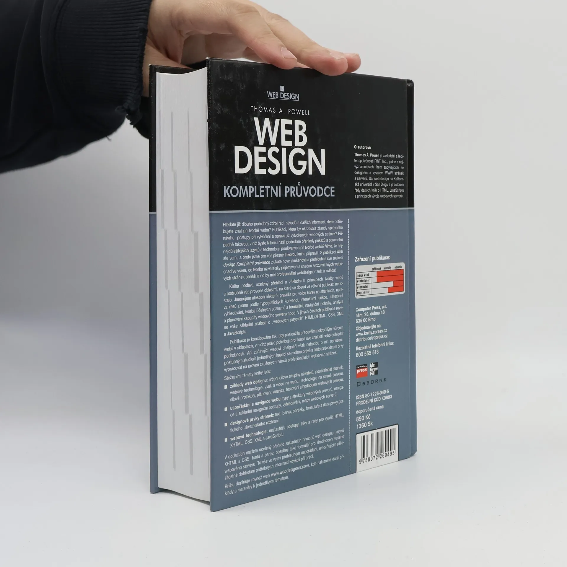 Jedinečný zdroj pro webdesignéry, pokrývající základní principy, postupy navržení a tvorby webu, navigaci, vyhledávání, designové prvky, a triky z HTML, CSS a JavaScriptu. Kniha poskytuje ucelený přehled o tvorbě webů a podrobně se věnuje tématům, která často chybí v jiných publikacích. Obsahuje pravidla pro volbu barev, úpravu písma podle typografických konvencí, interaktivní funkce, fulltextové vyhledávání, tvorbu seznamů a formulářů, navigační techniky a analýzu kapacity webového serveru. Dále rozšiřuje znalosti o webových jazycích HTML/XHTML, CSS, XML a JavaScriptu. Kniha je určena především pokročilým tvůrcům webů, kteří chtějí prohloubit své znalosti, ale i začínající designéři mohou díky postupnému studiu jednotlivých kapitol rychle dosáhnout úrovně zkušených profesionálů. Hlavní témata zahrnují základy web designu, uspořádání a navigaci webu, designové prvky stránek a webové technologie. Autor, Tomas A. Powell, je zakladatel a ředitel PINT, Inc., významné firmy v oblasti designu a vývoje webových stránek, a vyučuje web design na kalifornské univerzitě.