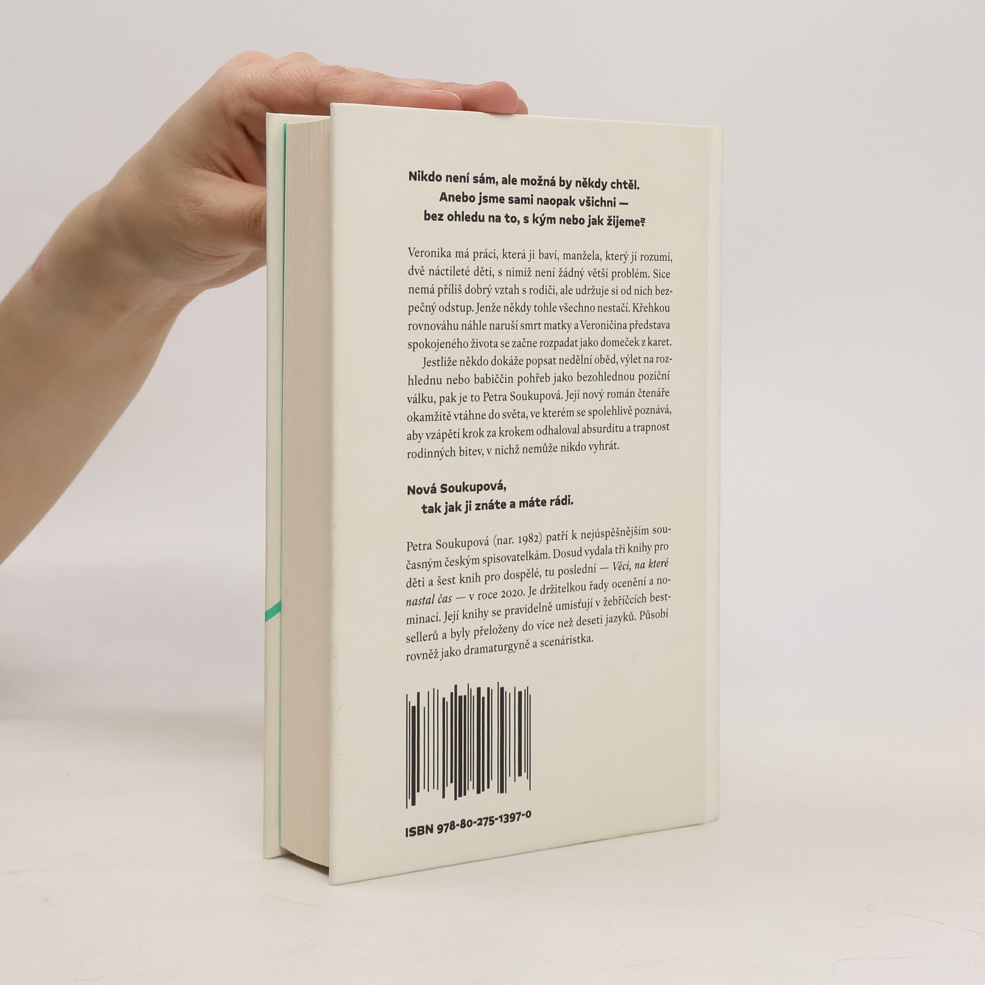 Nikdo není sám, ale možná by někdy chtěl. Anebo jsme sami naopak všichni — bez ohledu na to, s kým nebo jak žijeme?Veronika má práci, která ji baví, manžela, který jí rozumí, dvě náctileté děti, s nimiž není žádný větší problém. Sice nemá příliš dobrý vztah s rodiči, ale udržuje si od nich bezpečný odstup. Jenže někdy tohle všechno nestačí. Křehkou rovnováhu náhle naruší smrt matky a Veroničina představa spokojeného života se začne rozpadat jako domeček z karet.Jestliže někdo dokáže popsat nedělní oběd, výlet na rozhlednu nebo babiččin pohřeb jako bezohlednou poziční válku, pak je to Petra Soukupová. Její nový román čtenáře okamžitě vtáhne do světa, ve kterém se spolehlivě poznává, aby vzápětí krok za krokem odhaloval absurditu a trapnost rodinných bitev, v nichž nemůže nikdo vyhrát.Nová Soukupová, tak jak ji znáte a máte rádi.