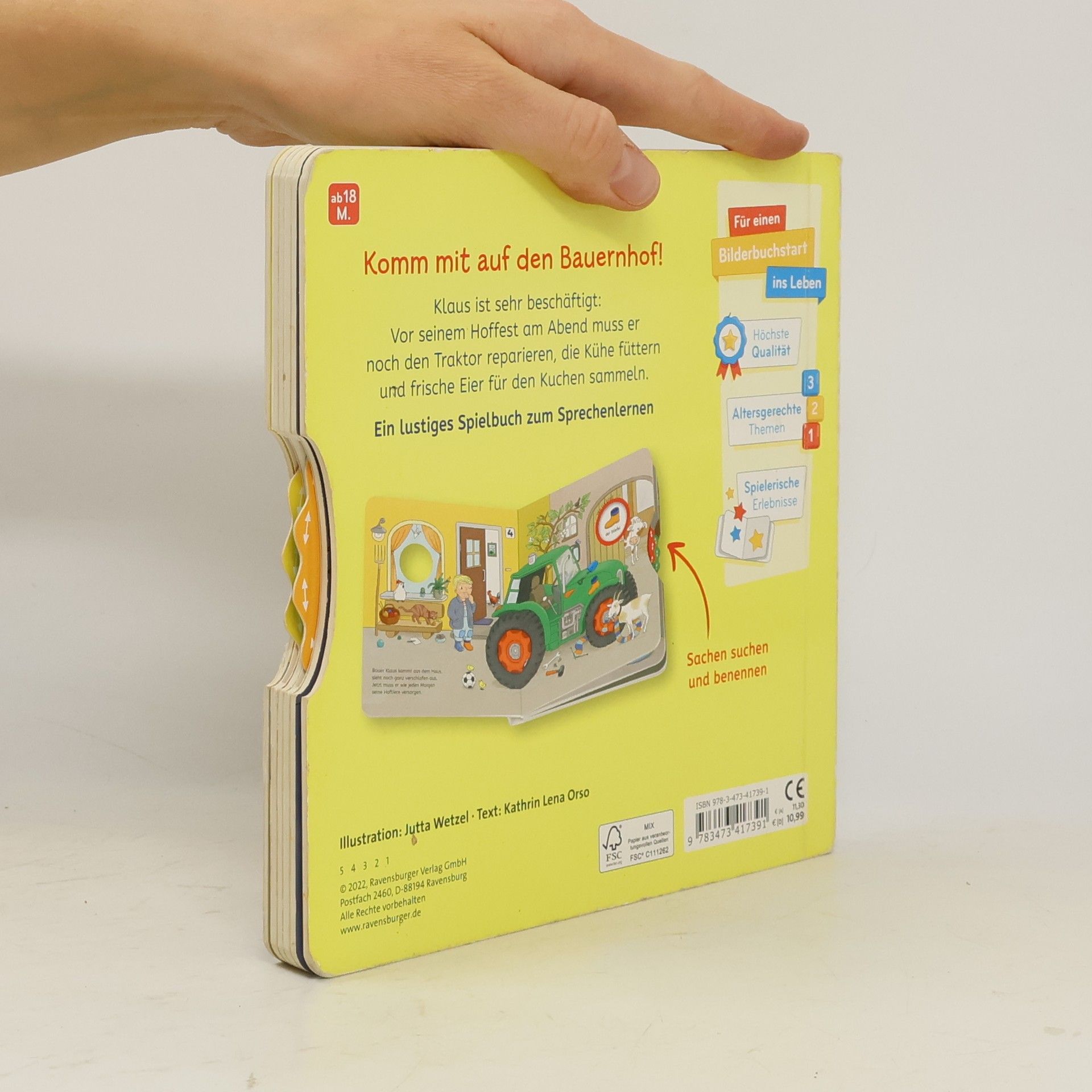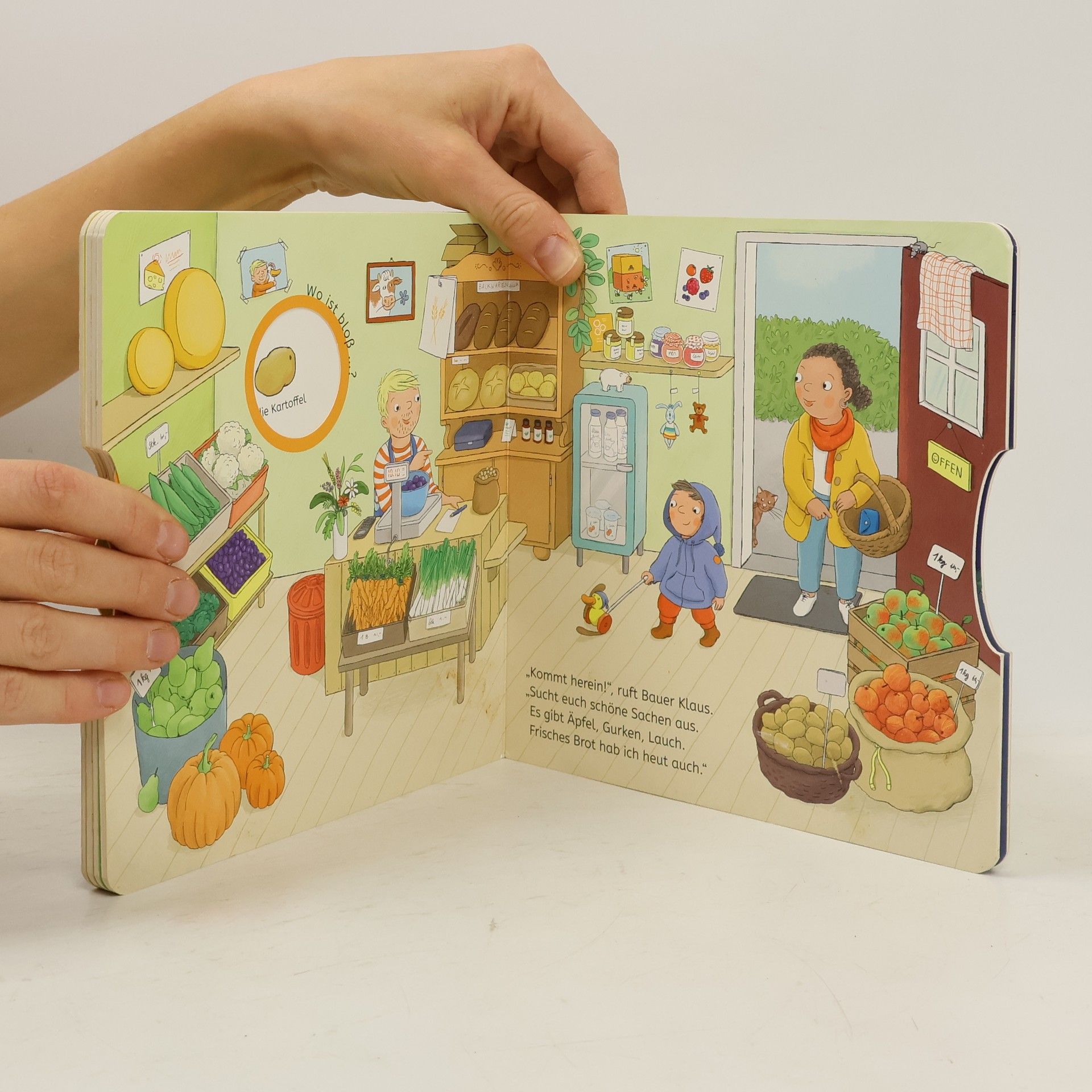 Hilf Bauer Klaus beim Suchen seiner verschwundenen Sachen für das Hoffest! Auf wimmeligen Seiten können mit Drehscheiben verschiedene Dinge gefunden werden. Dieses interaktive Suchbuch kombiniert Spielbuch, Wimmelbuch und Vorlesegeschichte, fördert den Wortschatz und die Feinmotorik von Kindern.